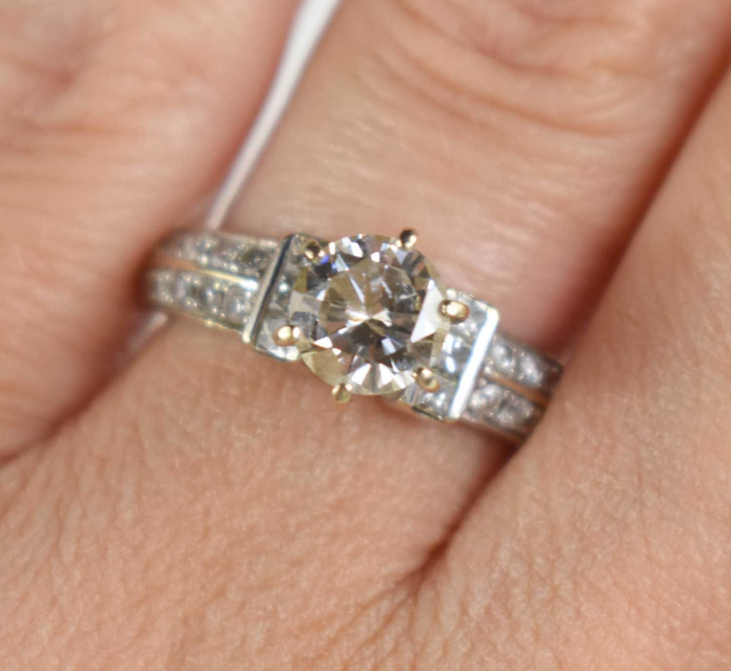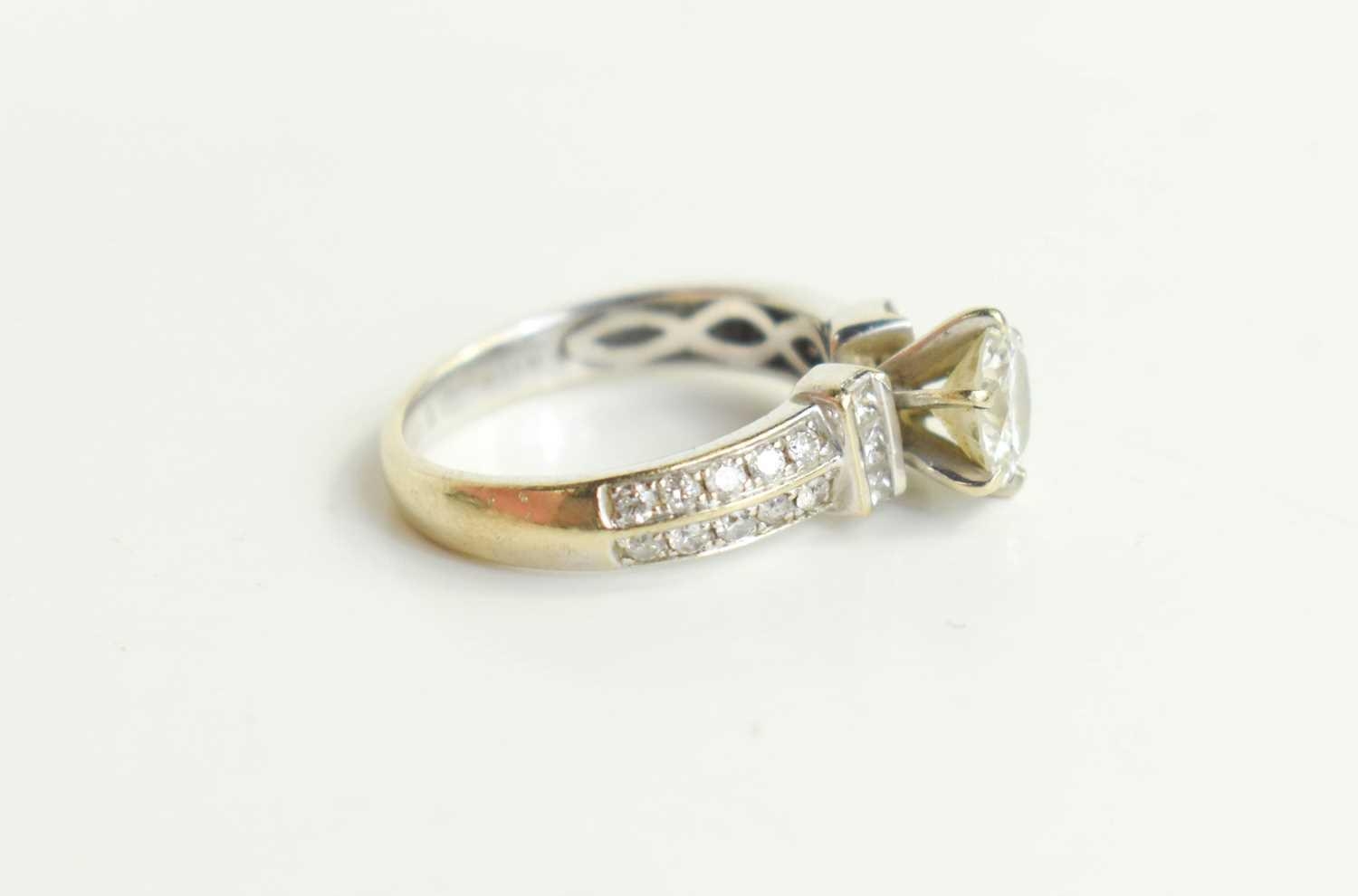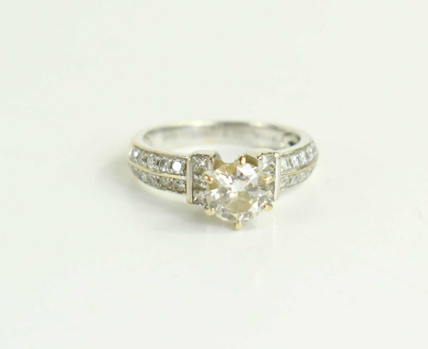 An 18ct white gold and diamond solitaire ring, the central claw set brilliant cut stone of approximately 1ct, 6.71mm diameter, with thirteen further small diamonds to the shoulders, size O, 5.3g total weight.