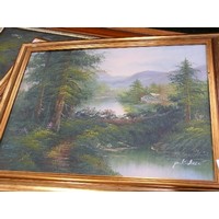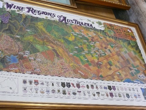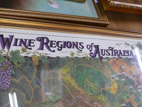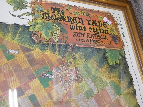 A VERY LARGE FRAMED AND GLAZED PRINT OF THE MCLAREN WINE REGION OF AUSTRALIA.