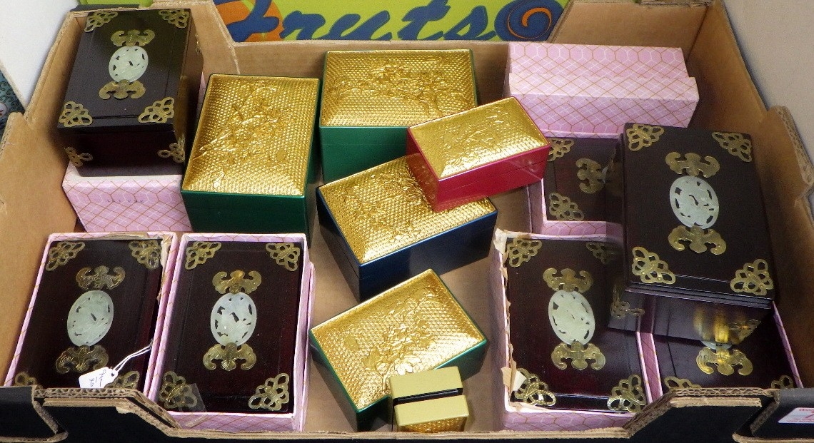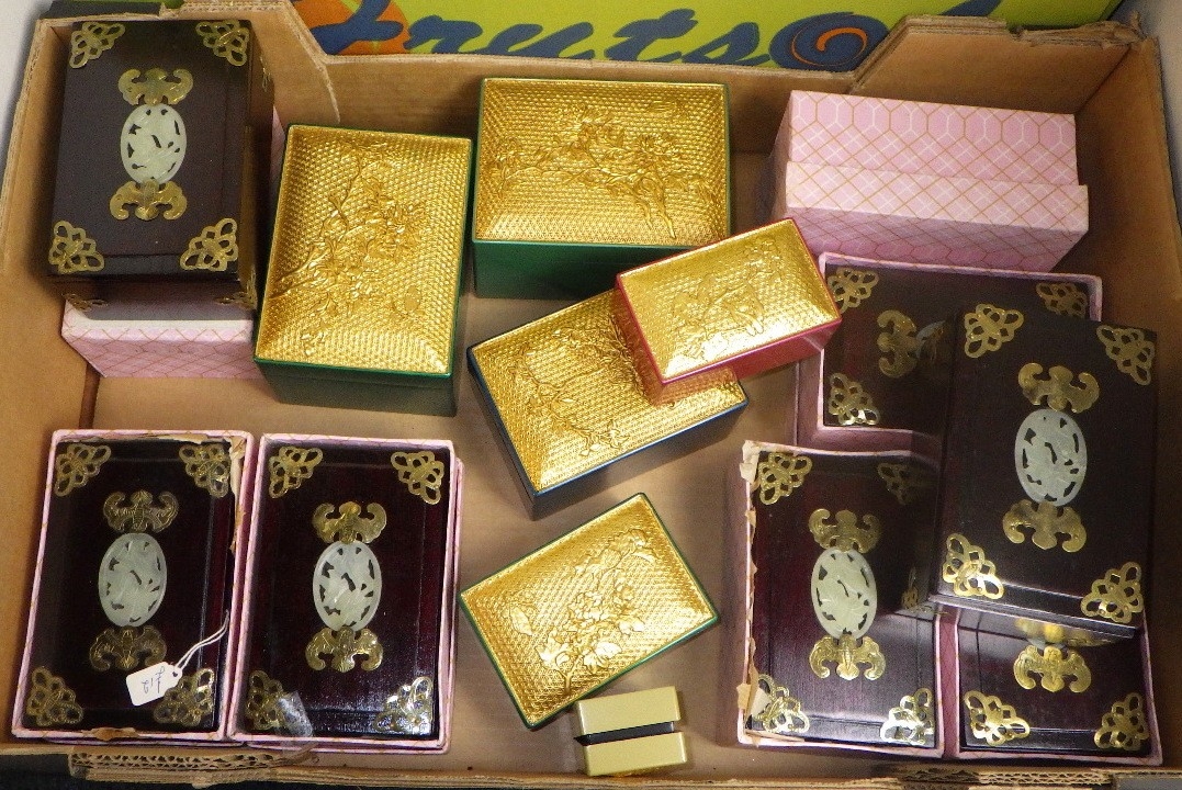 A qty boxed hardwood soapstone inlaid jewellery boxes etc