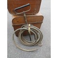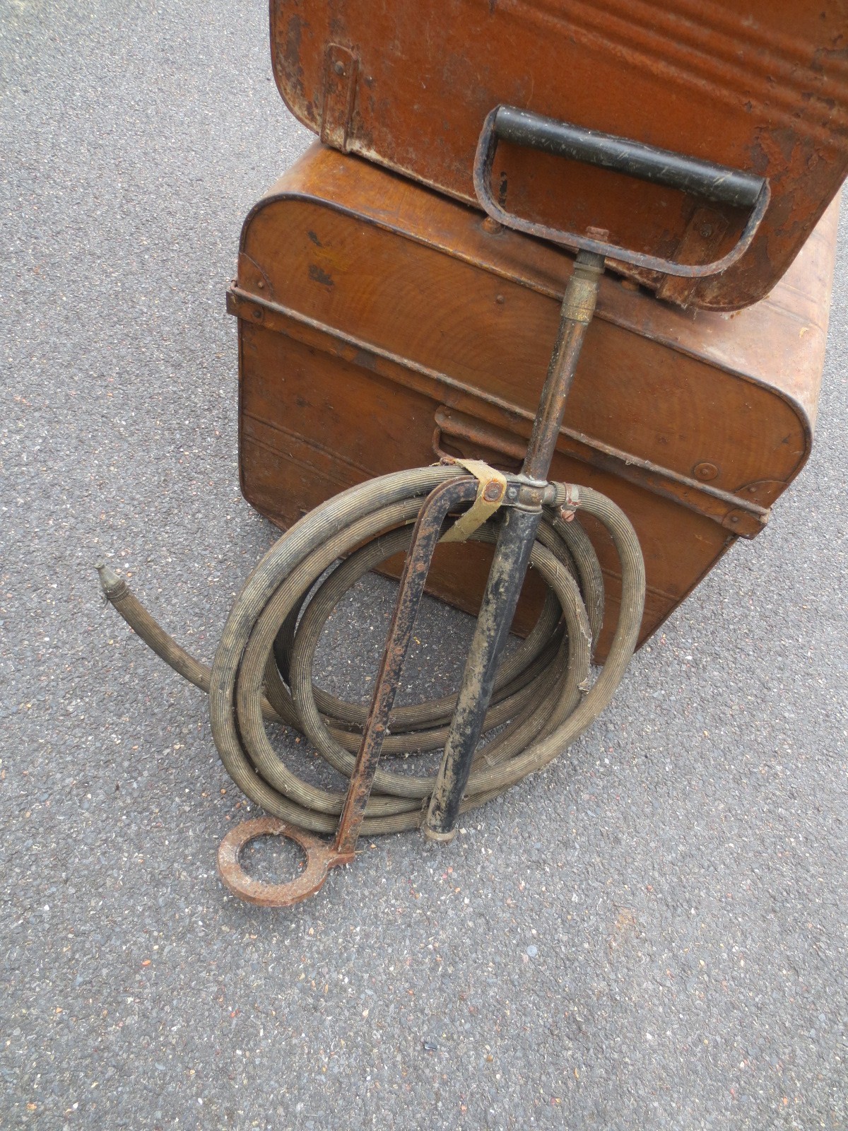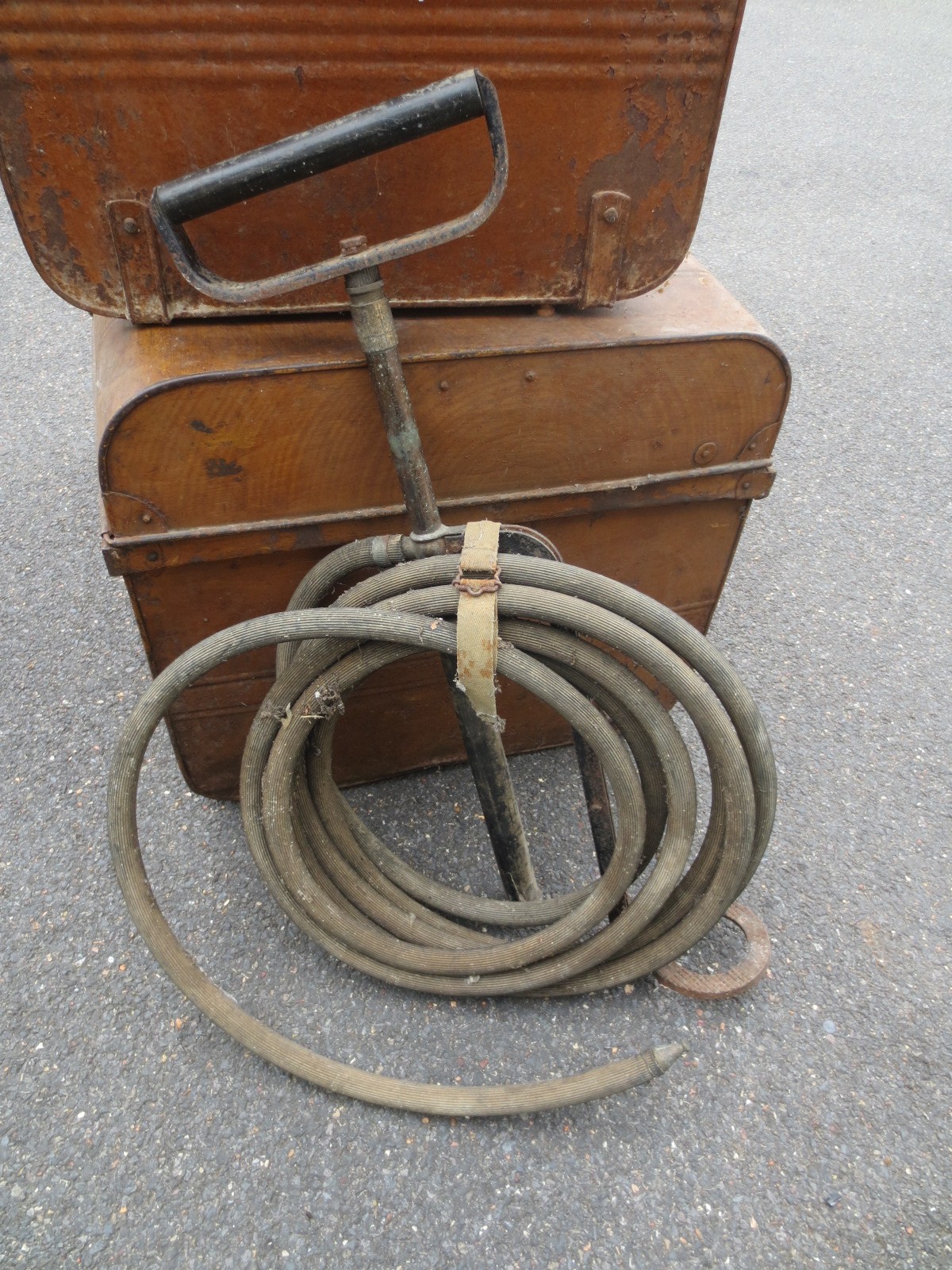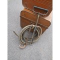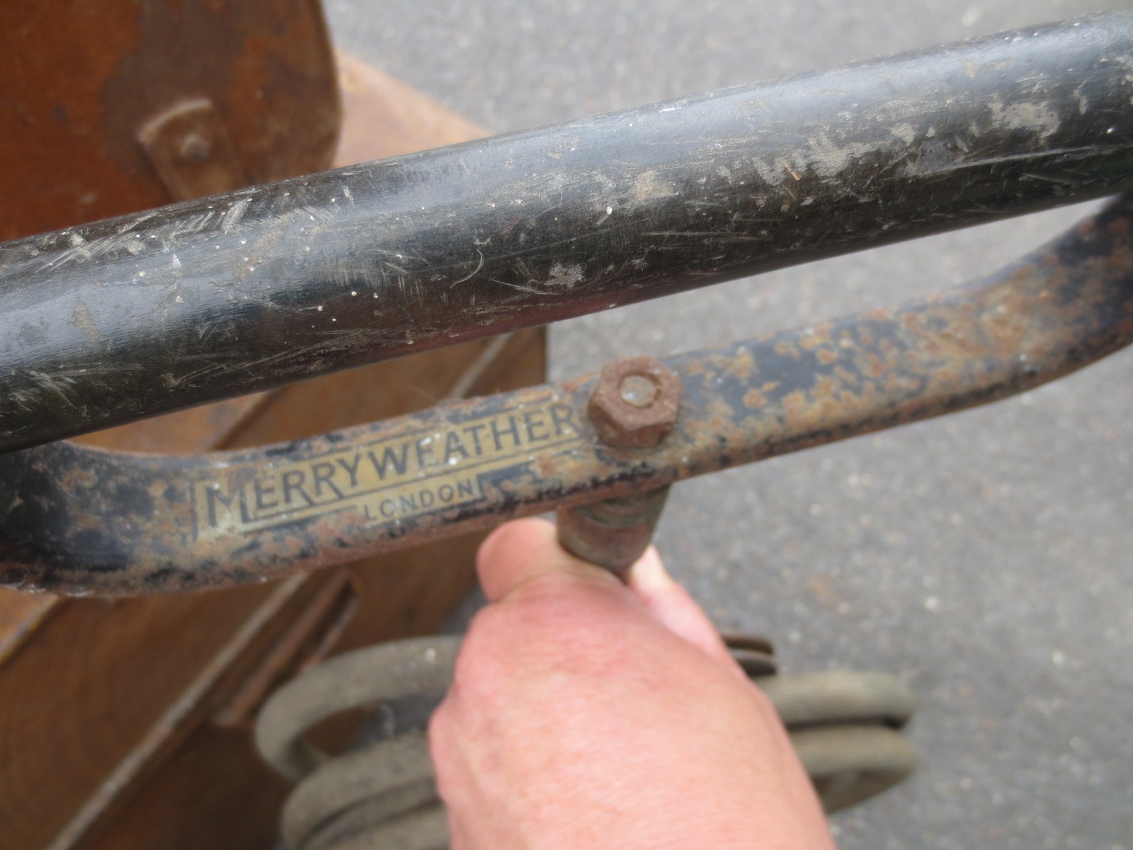 A vintage Merryweather stirrup pump with hose and webbing hose retainer, believed to be WW2-era ARP