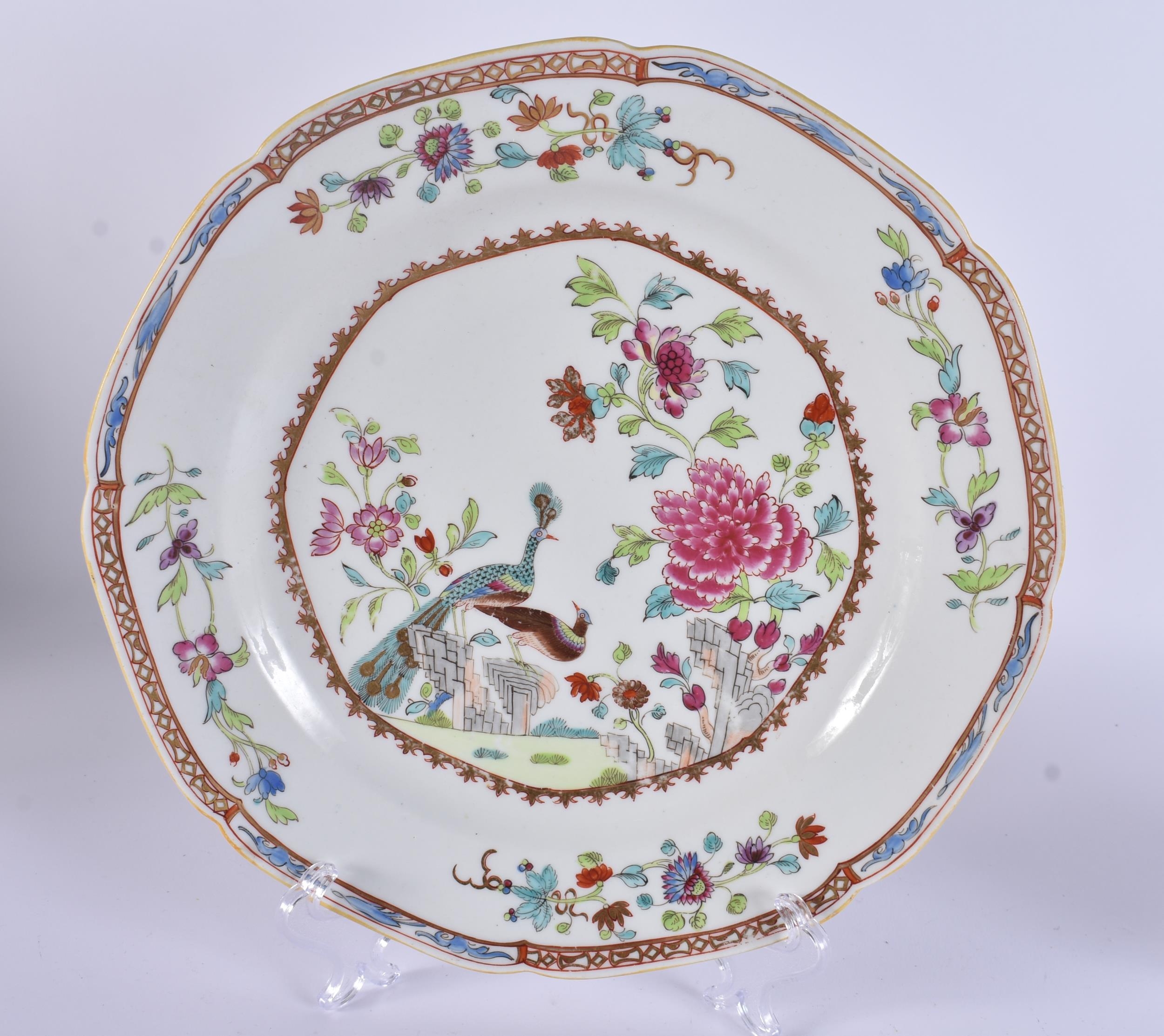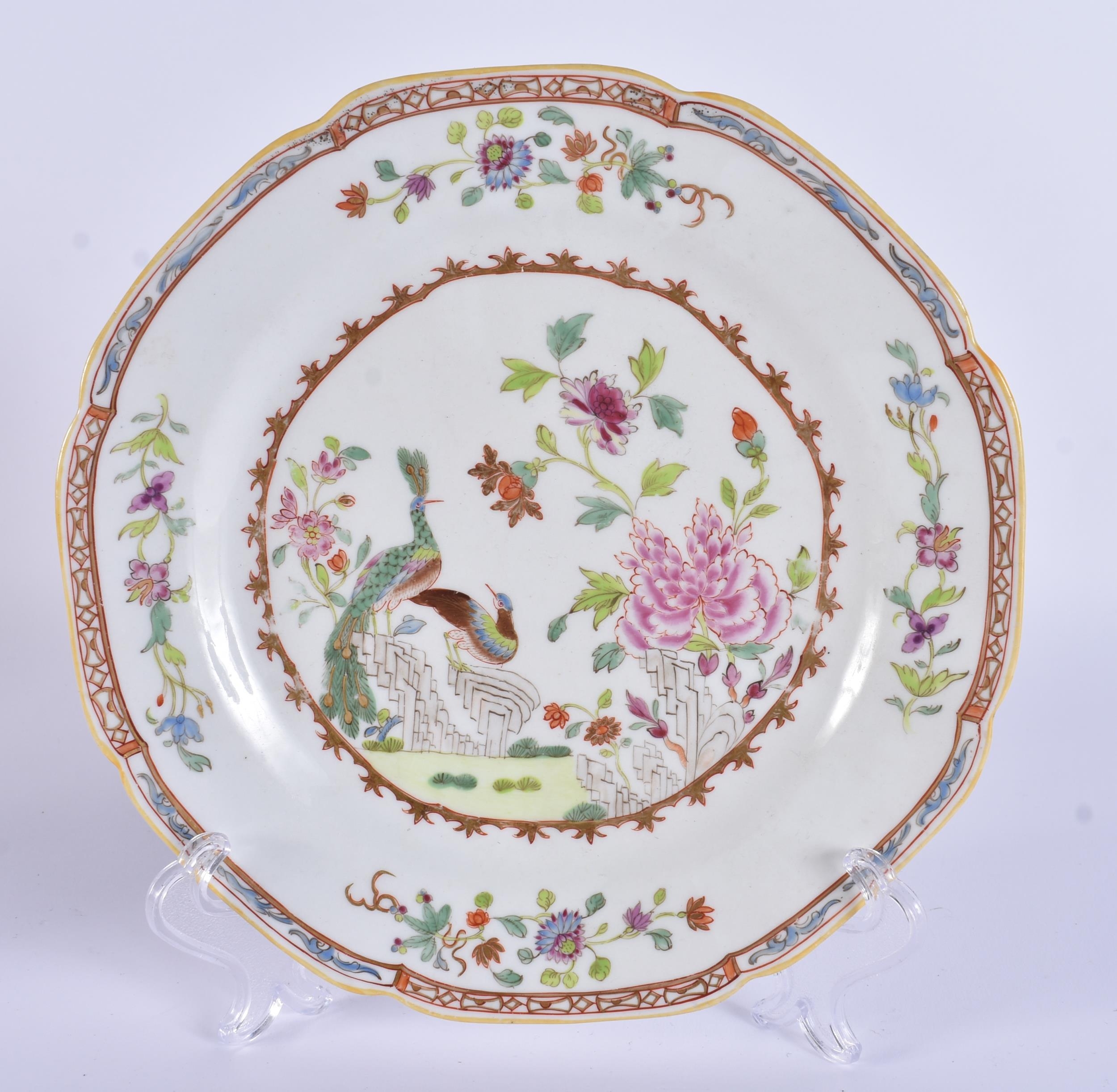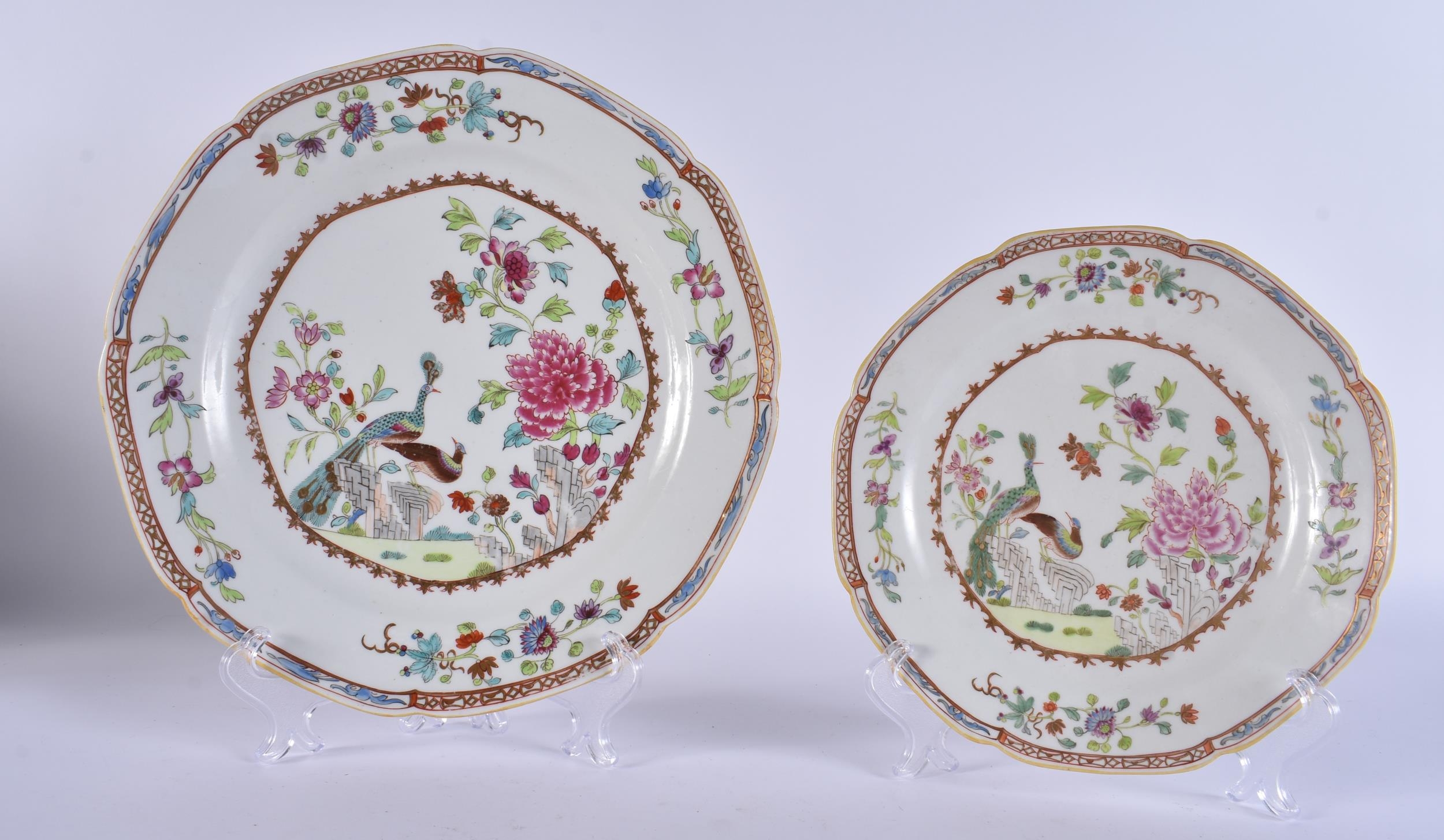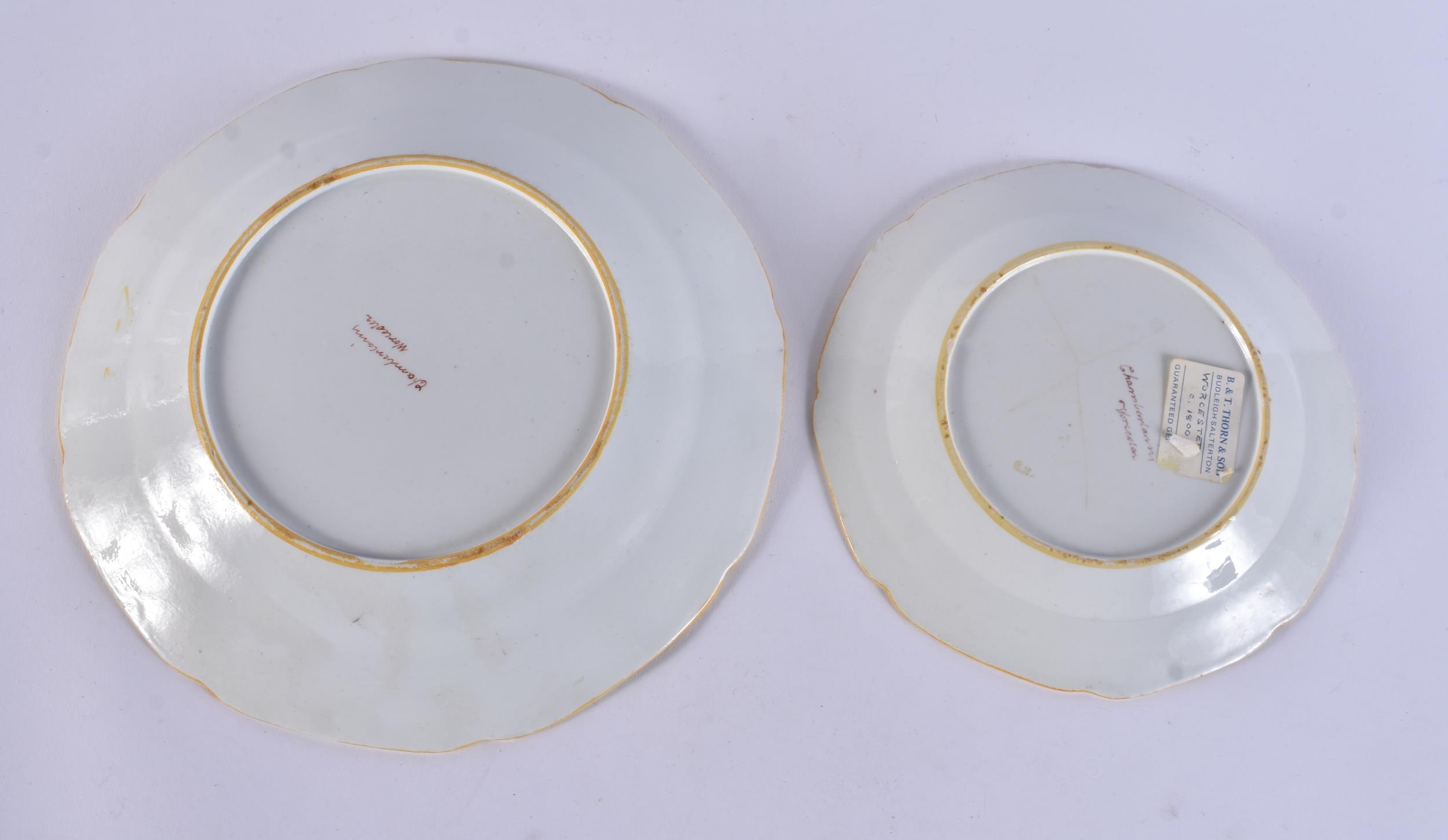 TWO RARE EARLY 19TH CENTURY CHAMBERLAINS WORCESTER PLATES modelled in the 18th century Chinese Export style. Largest 22.5 cm wide. (2)