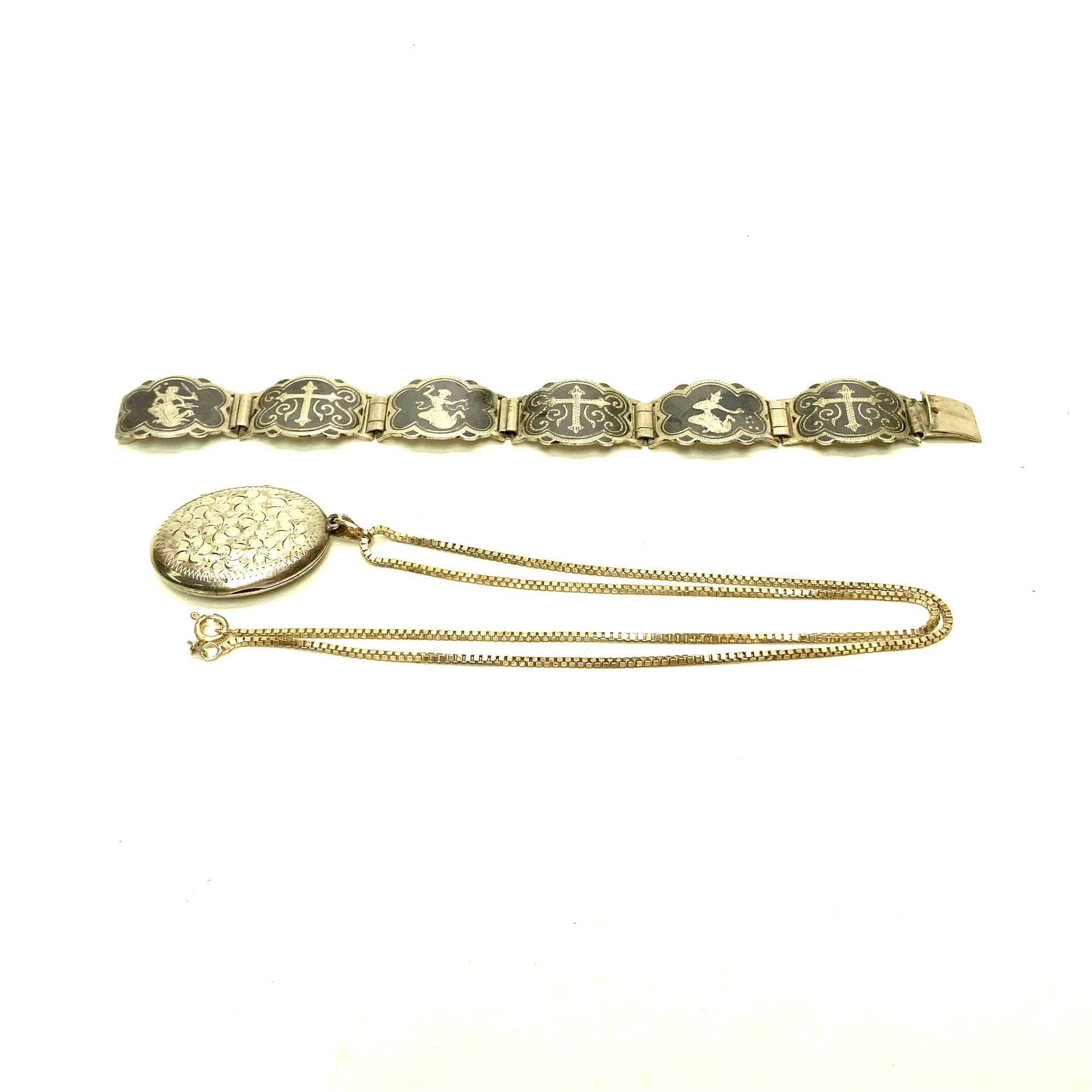Panelled .925 silver Siam Niello bracelet 18cm, Large sterling silver locket and chain, hallmarks for Birmingham 1972 by Joseph Smith & Sons (Birmingham) Ltd, Vittoria Street, Birmingham.