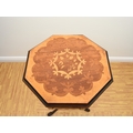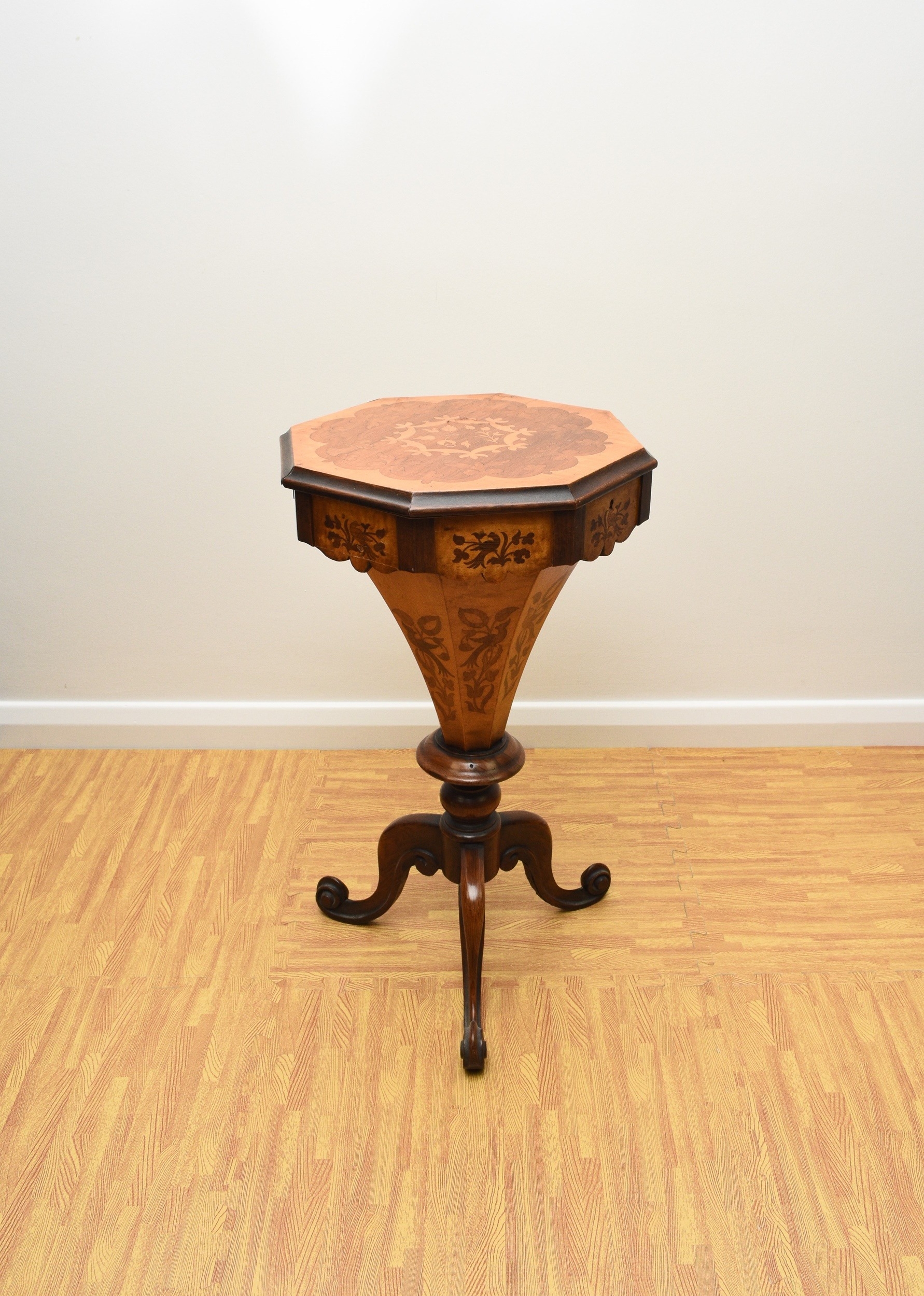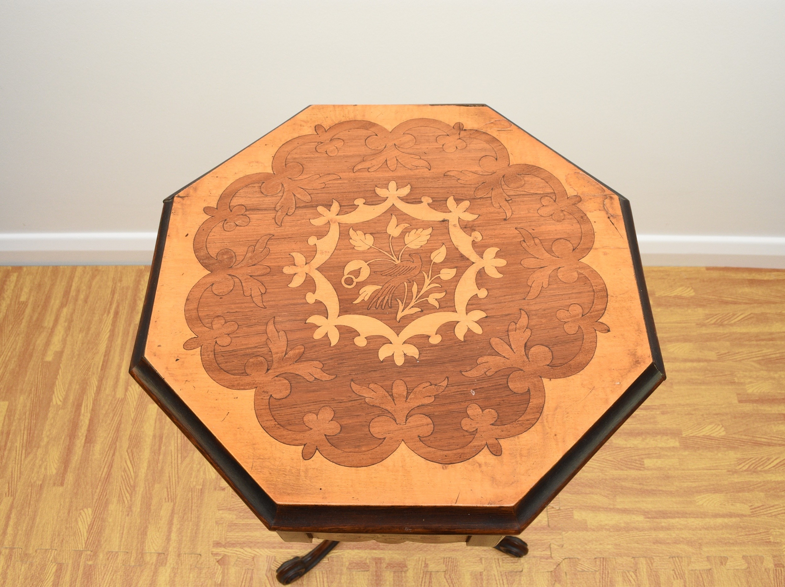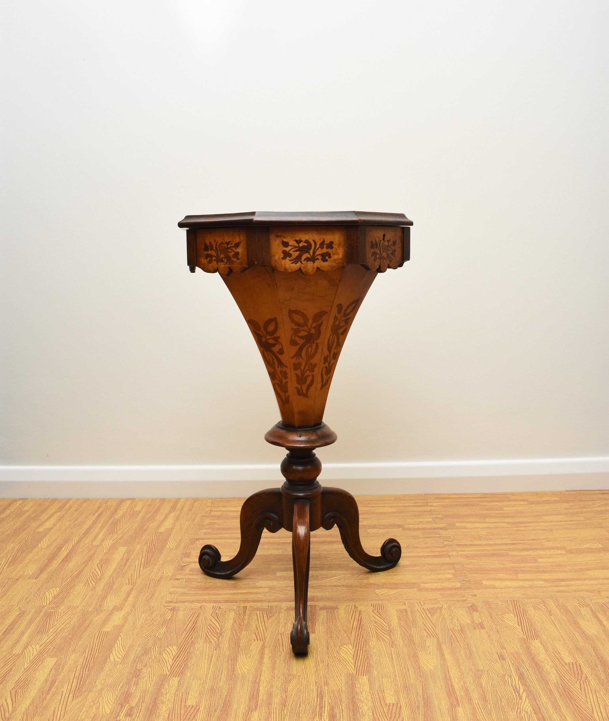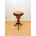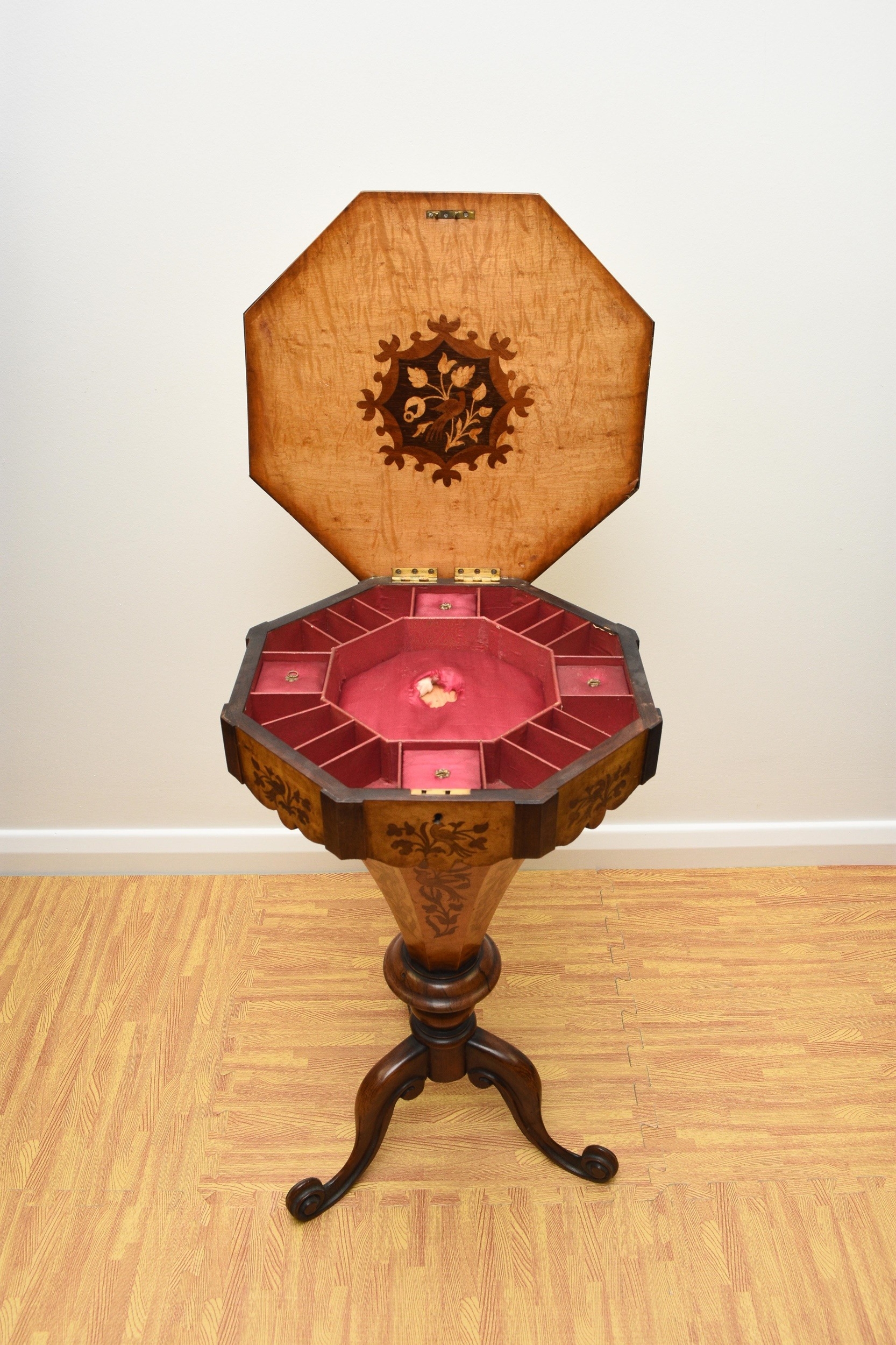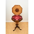 A Victorian rosewood and marquetry inlaid work table The octagonal top inlaid with a bird within scrolling foliage, enclosing a fitted interior with red silk elements, above a shaped frieze with conforming inlay, the tapering octagonal drum with further marquetry birds and foliage, raised on three scroll supports. 42cm wide x 73cm high Wirswall Hall, Whitchurch, Shropshire. Condition:Two of the frieze panels have splits and small veneer losses. Interior fitting showing some wear with central knop missing and some loss to silk. One scroll support repaired.