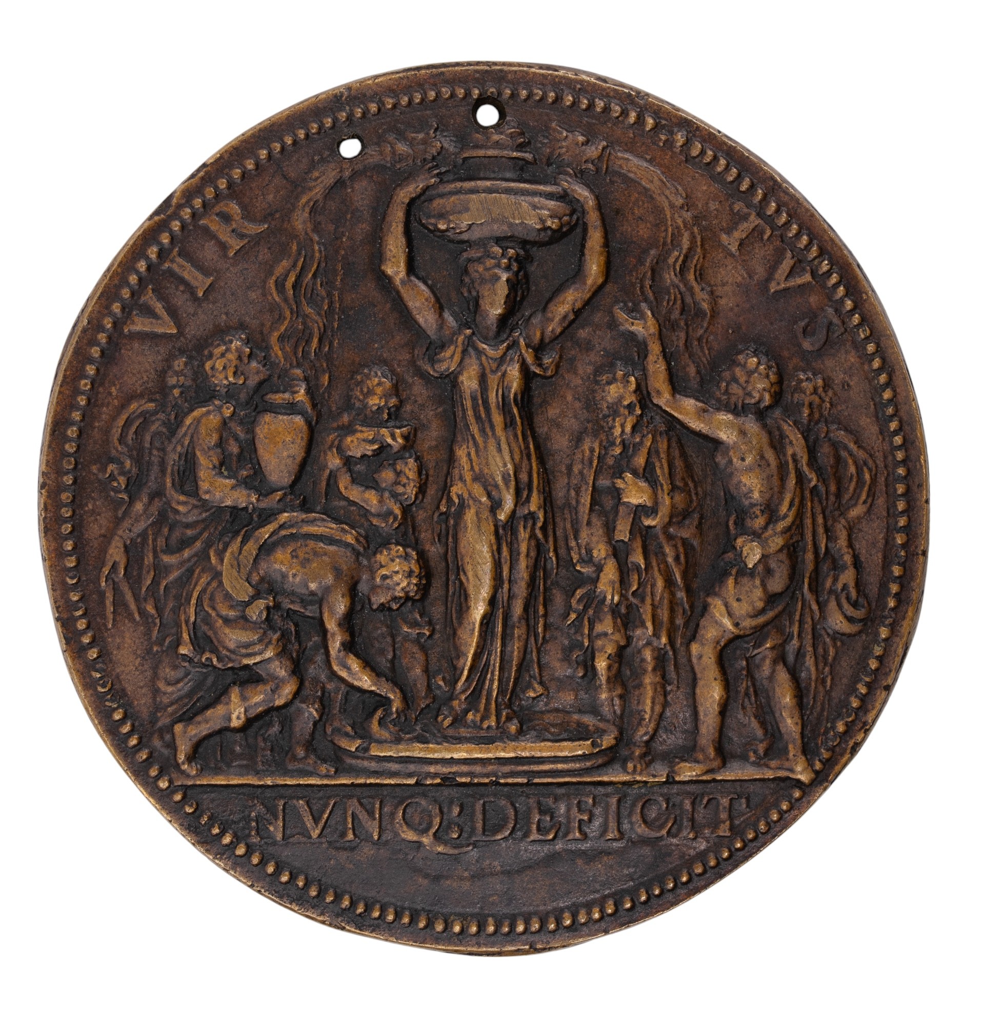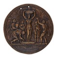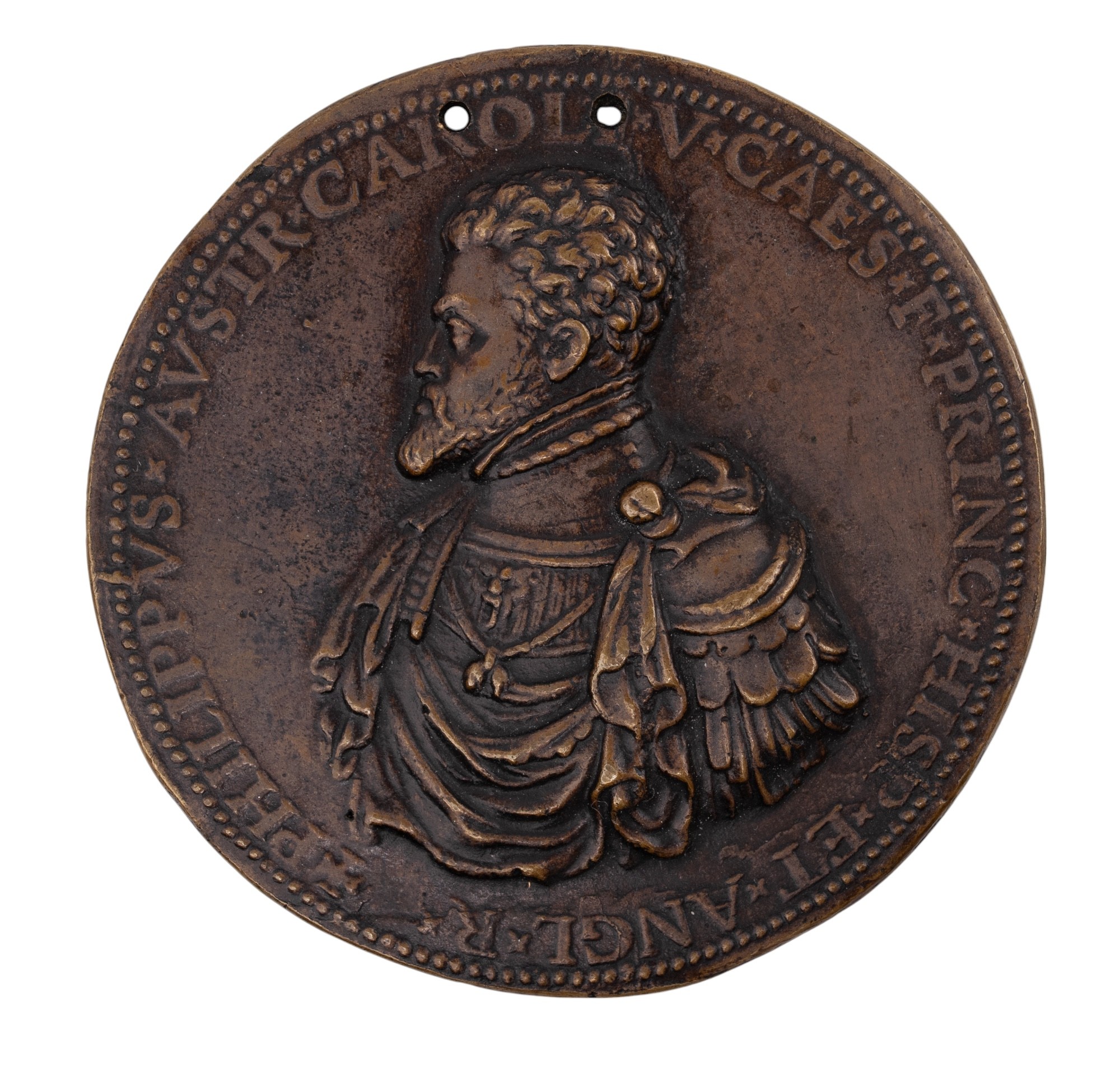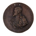 Half-length bust of Philip II, left, in armour, with badge of the Golden Fleece, mantle around his shoulders, + PHILIPPVS AVSTR CAROLI V CAES F PRINC HISP ET ANGL R, rev., Virtue, as a draped female statue stands in a small pool, on her head a vase overflowing with water from two animal heads, around, a group of figures collect the water and drink it, VIRTVS, in ex, NVNQ DEFICIT, beaded border to both sides, 79.5mm (MI 75/26).
