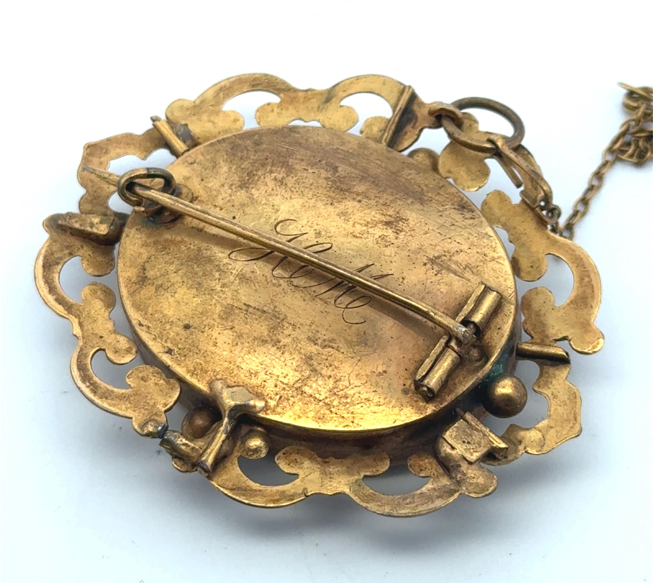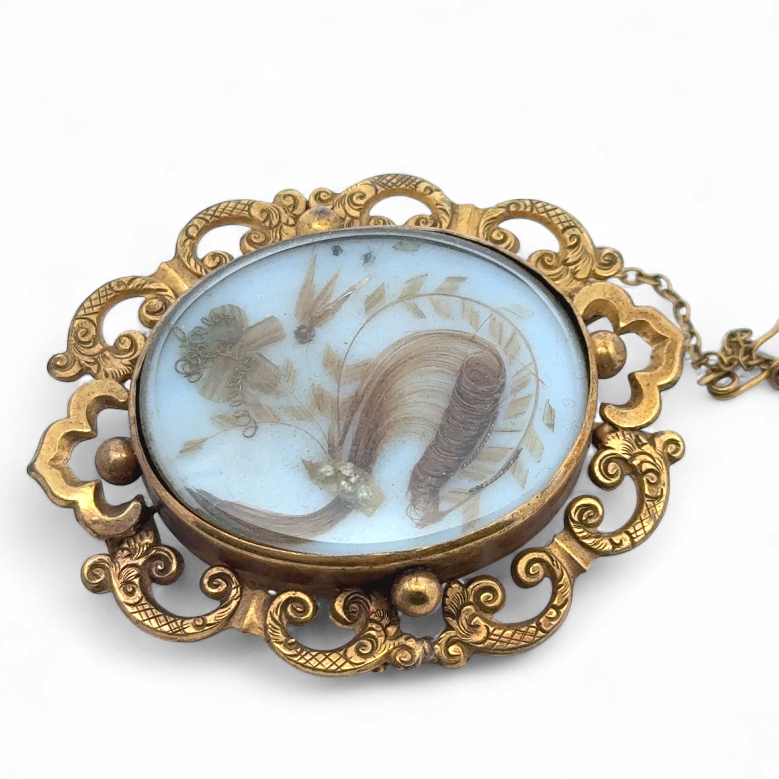 A Victorian pinchbeck mourning brooch with hair decoration. Pin in need of attention. Length 57mm