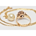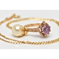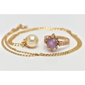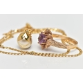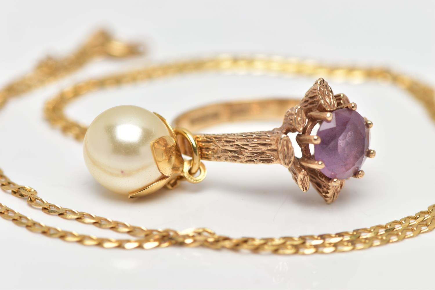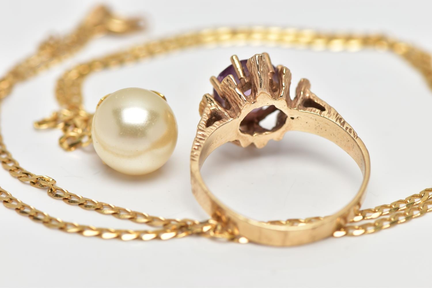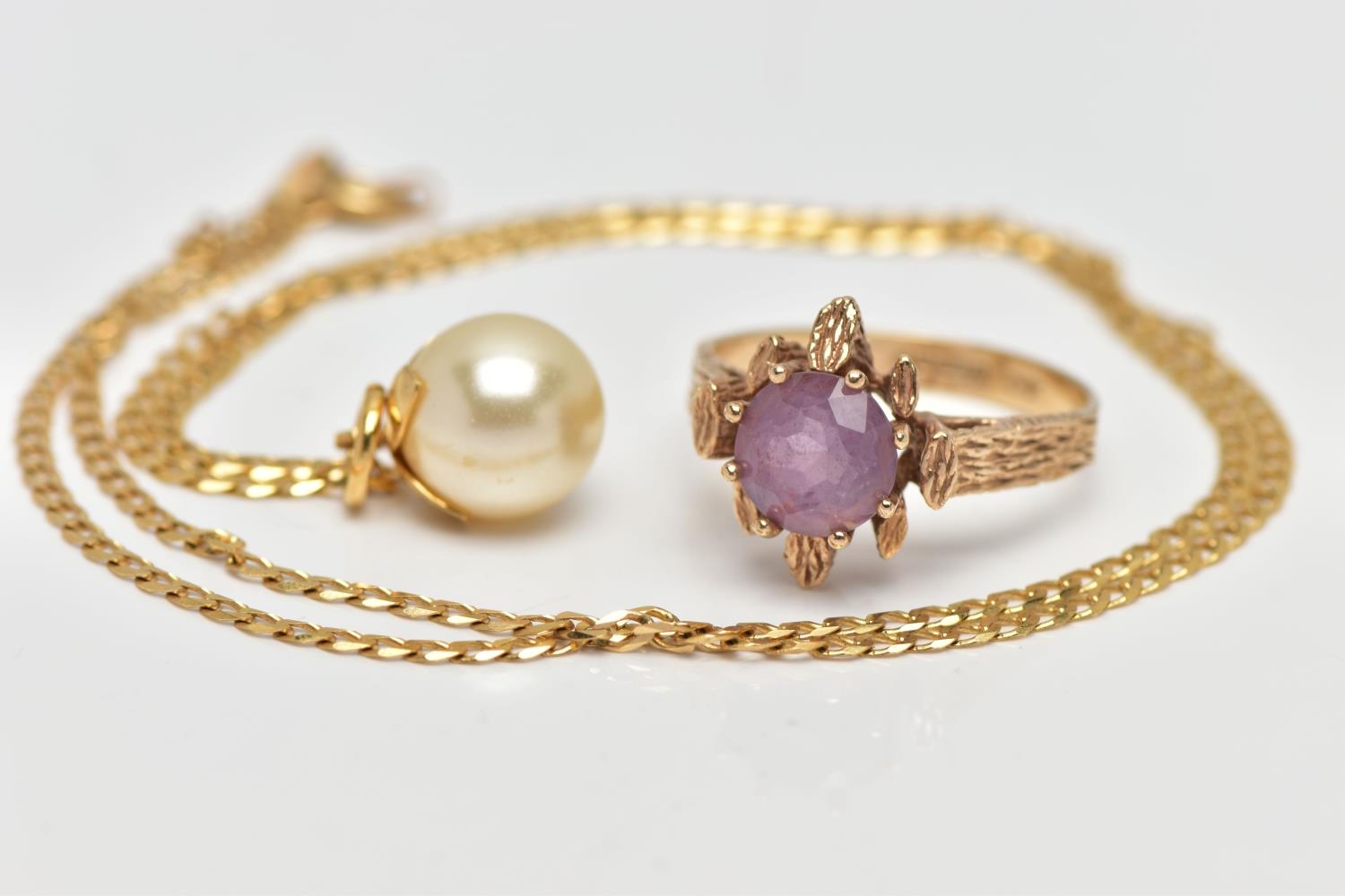 A 9CT GOLD AMETHYST RING AND A PENDANT NECKLACE, the ring designed with an eight claw set, circular cut amethyst, within an undulating textured bark effect surround and shoulders, leading onto a polished band, hallmarked 9ct Birmingham 1973, ring size O, approximate gross weight 3.9 grams, together with an imitation pearl pendant mounted in a yellow metal mount unmarked, suspended from a fine curb link chain fitted with a spring clasp, hallmarked 9ct London import, length 450mm, approximate total gross weight 7.8 grams