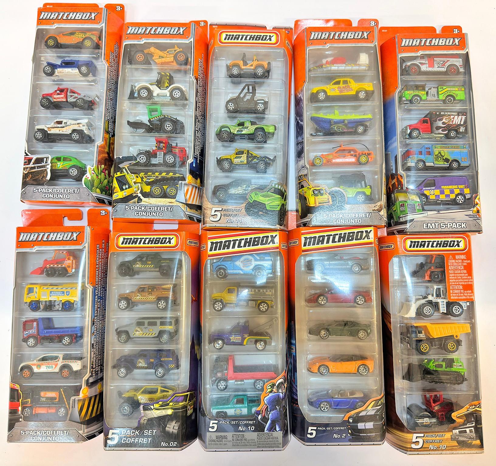 A group of 10 x 5 pack Matchbox diecast model vehicles comprising 1) Matchbox 5 Pack City Works Vehicles, 2) Matchbox 5 Pack Construction Vehicles, 3) Matchbox 5 Pack Desert Adventure Vehicles, plus others as shown. All appear excellent in original boxes.