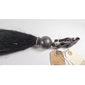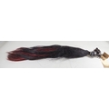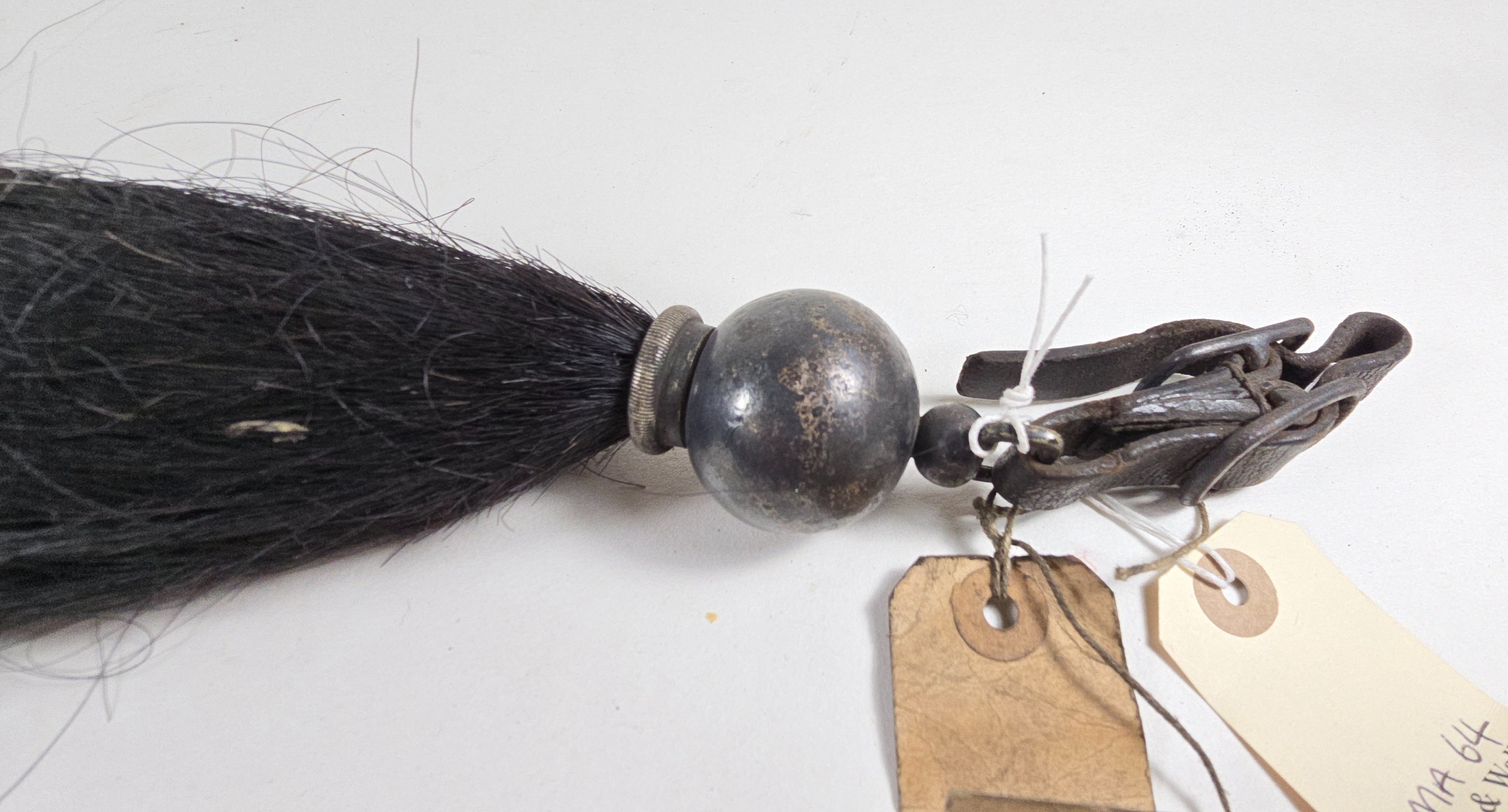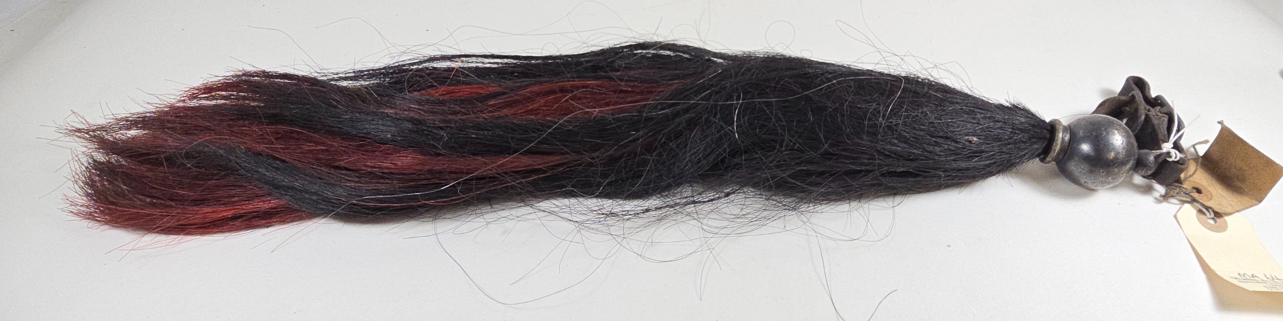 A Cavalry black over maroon horse hair Throat Plume, with plain spherical white metal (heavily tarnished) mount and leather loop. GC.