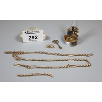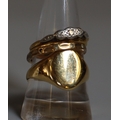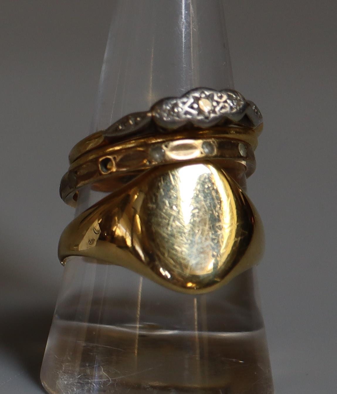 22ct gold wedding ring, 18ct gold signet ring, a 9ct gold eternity ring and a three stone diamond ring. Ring size N, S, P and M. Approx weight in total grams.