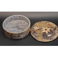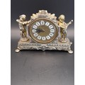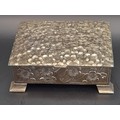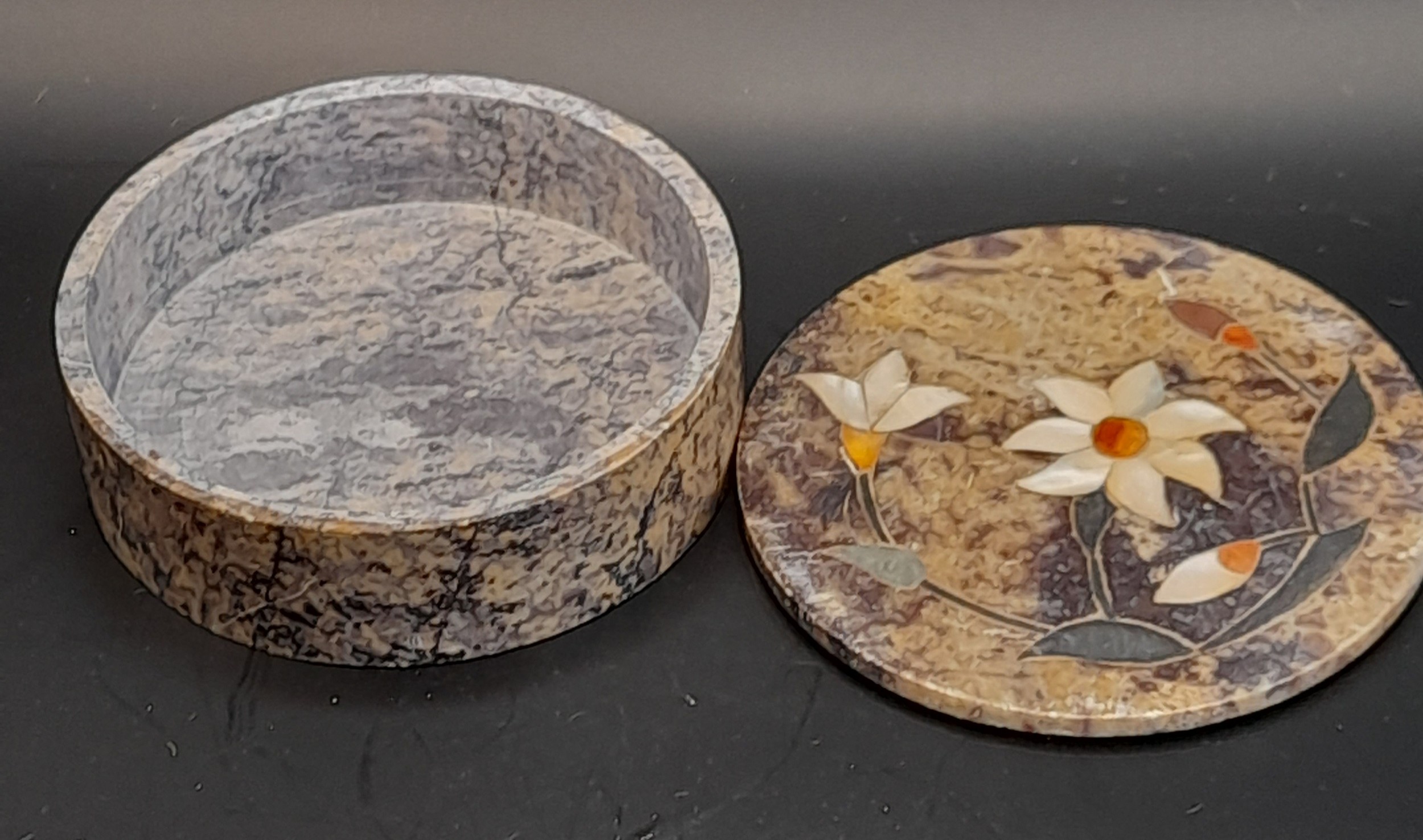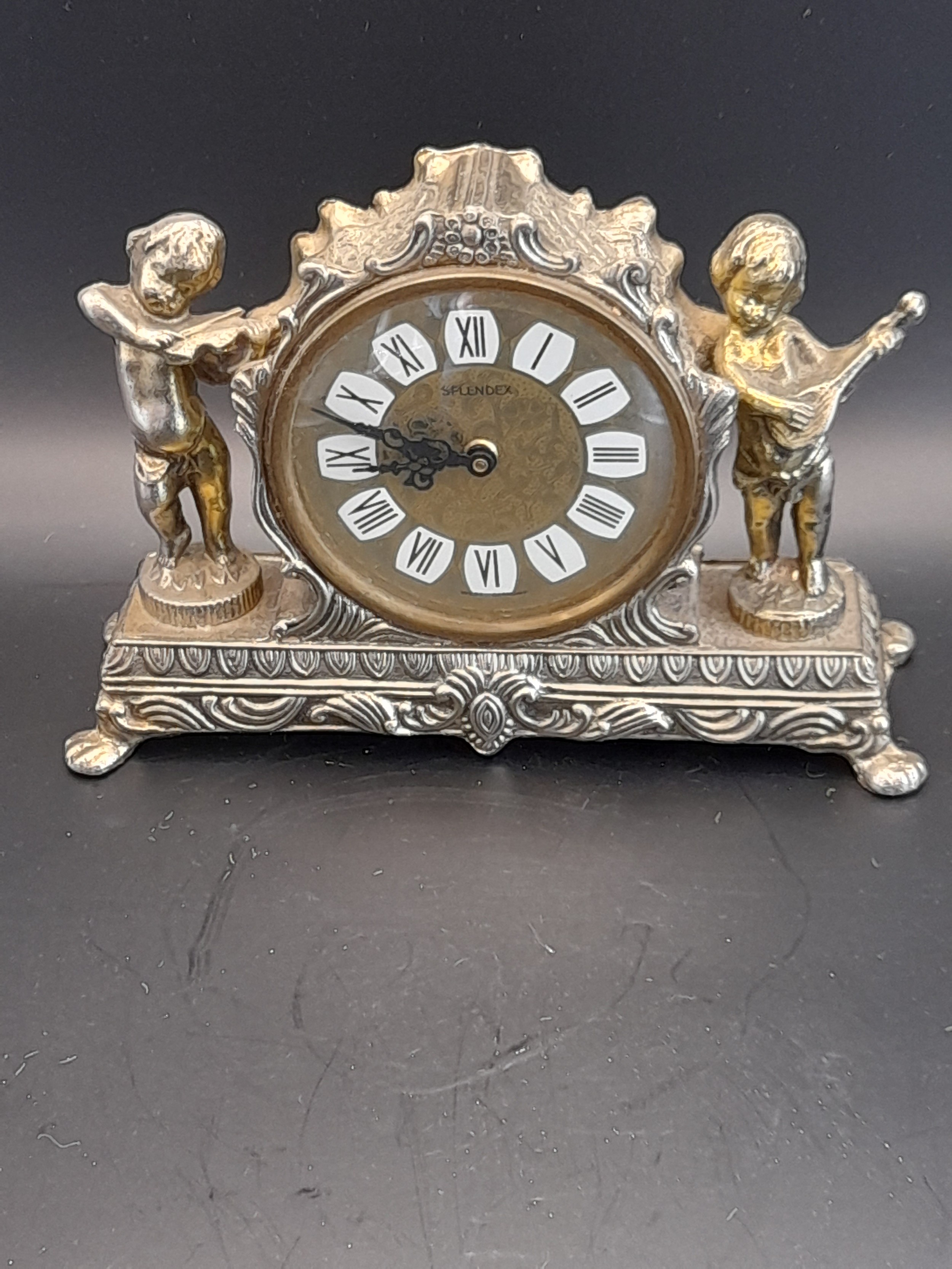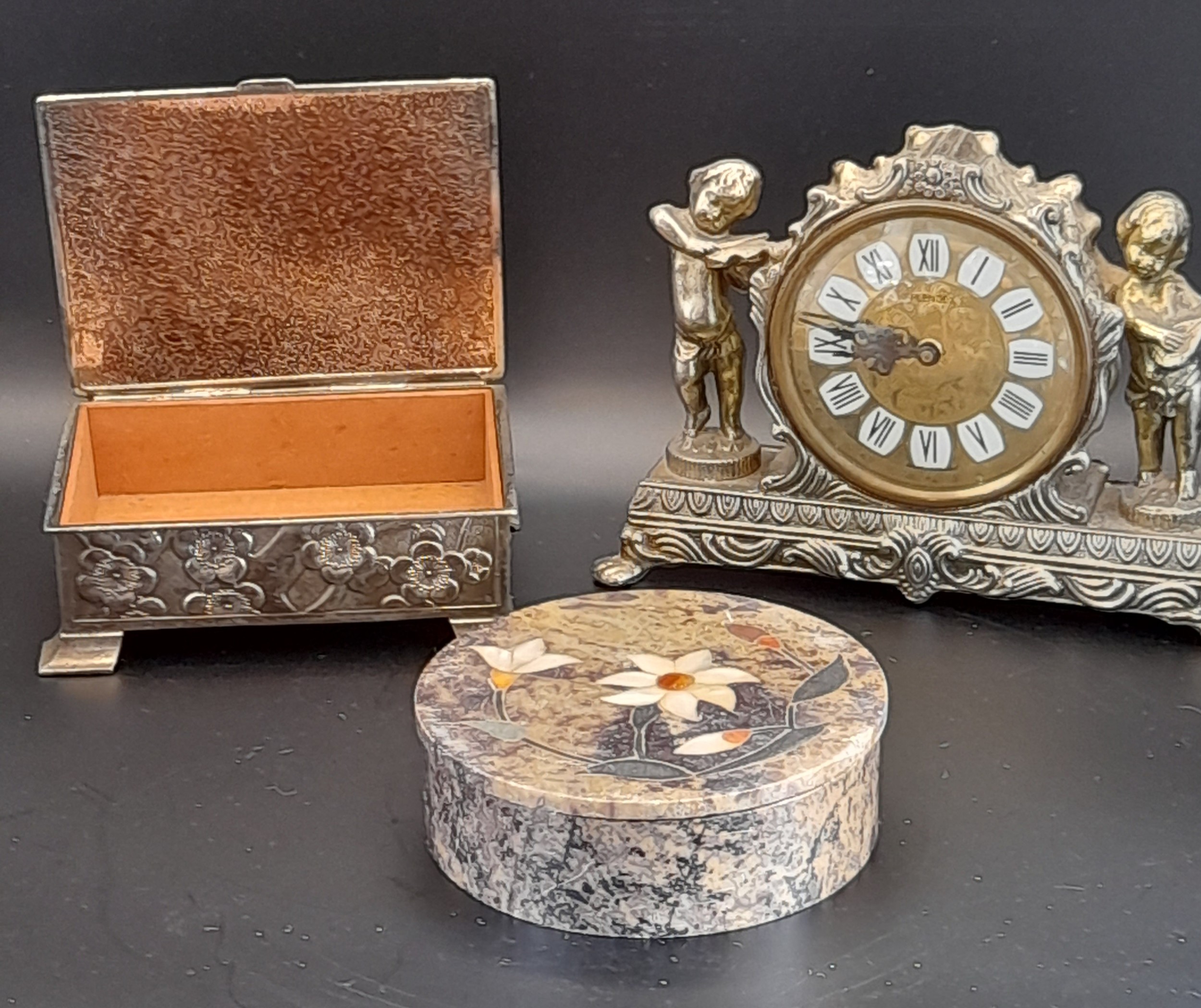 white metal clock by Splendex 17cm wide along with a carved marble box with inlay to lid and a white metal box on 4 feet (3)