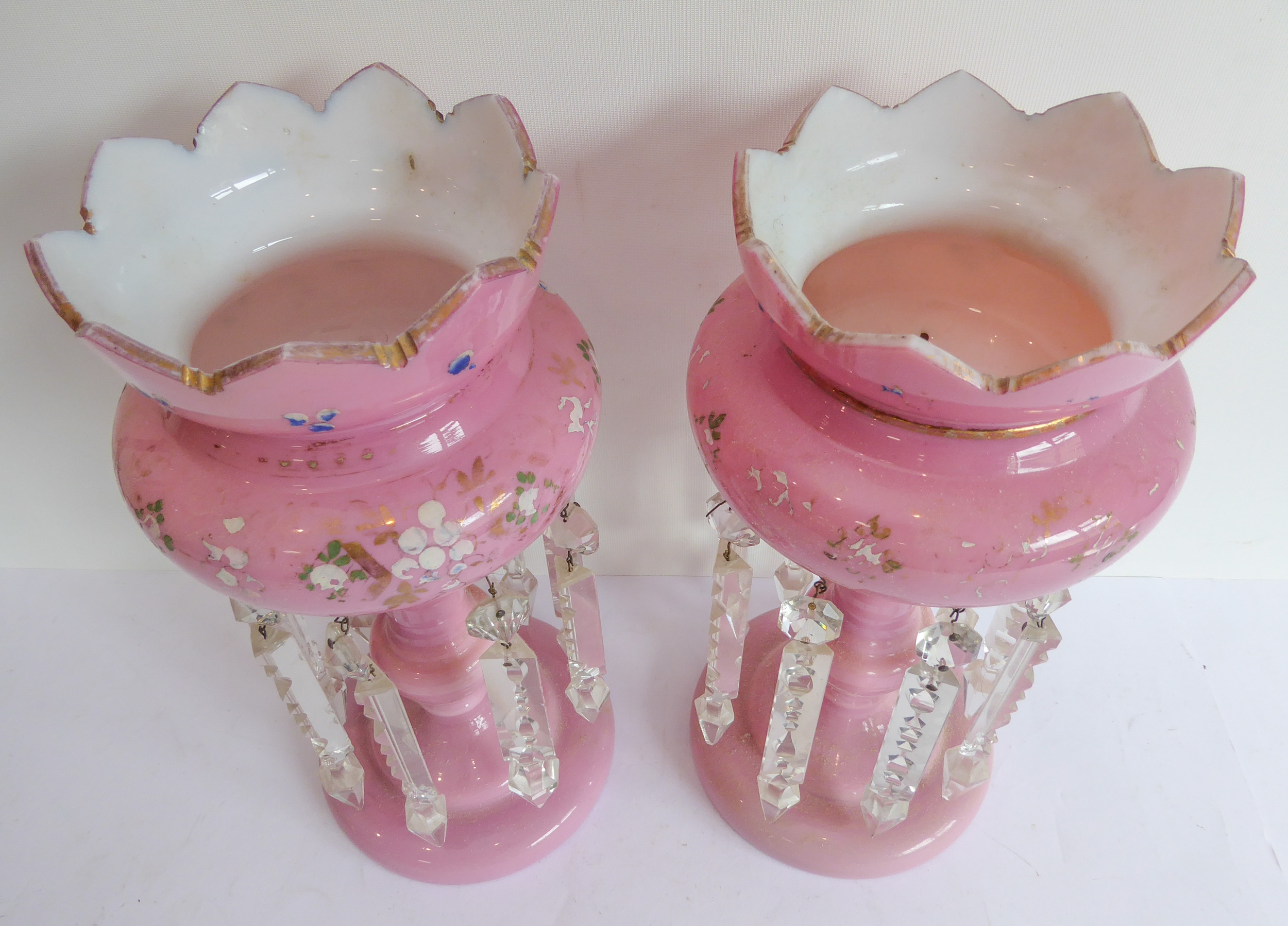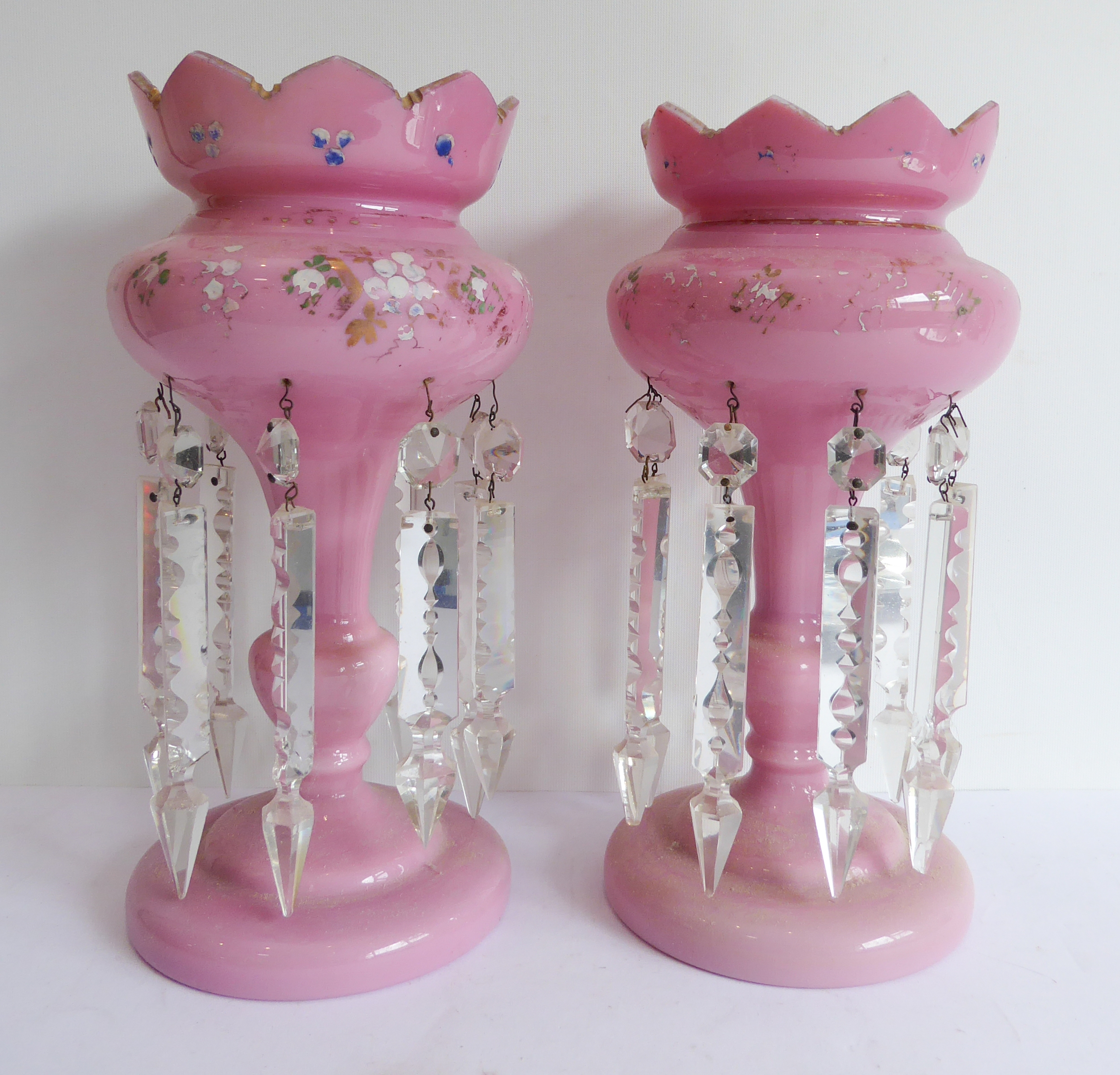 Condition Report: The items are dusty and dirty and in need of a clean. There has been some rubbing of the gilt and enamel decoration on both. The lustre with the lot number ticket exhibits very minor chips to inside of top rim. Foot rim looks good and two of the faceted cut-glass droplets have been replaced (7 longer, 2 now shorter). The other lustre exhibits some very minor chips to the top lip. Again gilt rubbing to the gilt decoration, the foot and stem appear good and the cut-glass droplets look in good order with one replaced (shorter, with the tip away). Some pointed 'ends' to the droplets on both lustres exhibit ships but do not particularly detract.