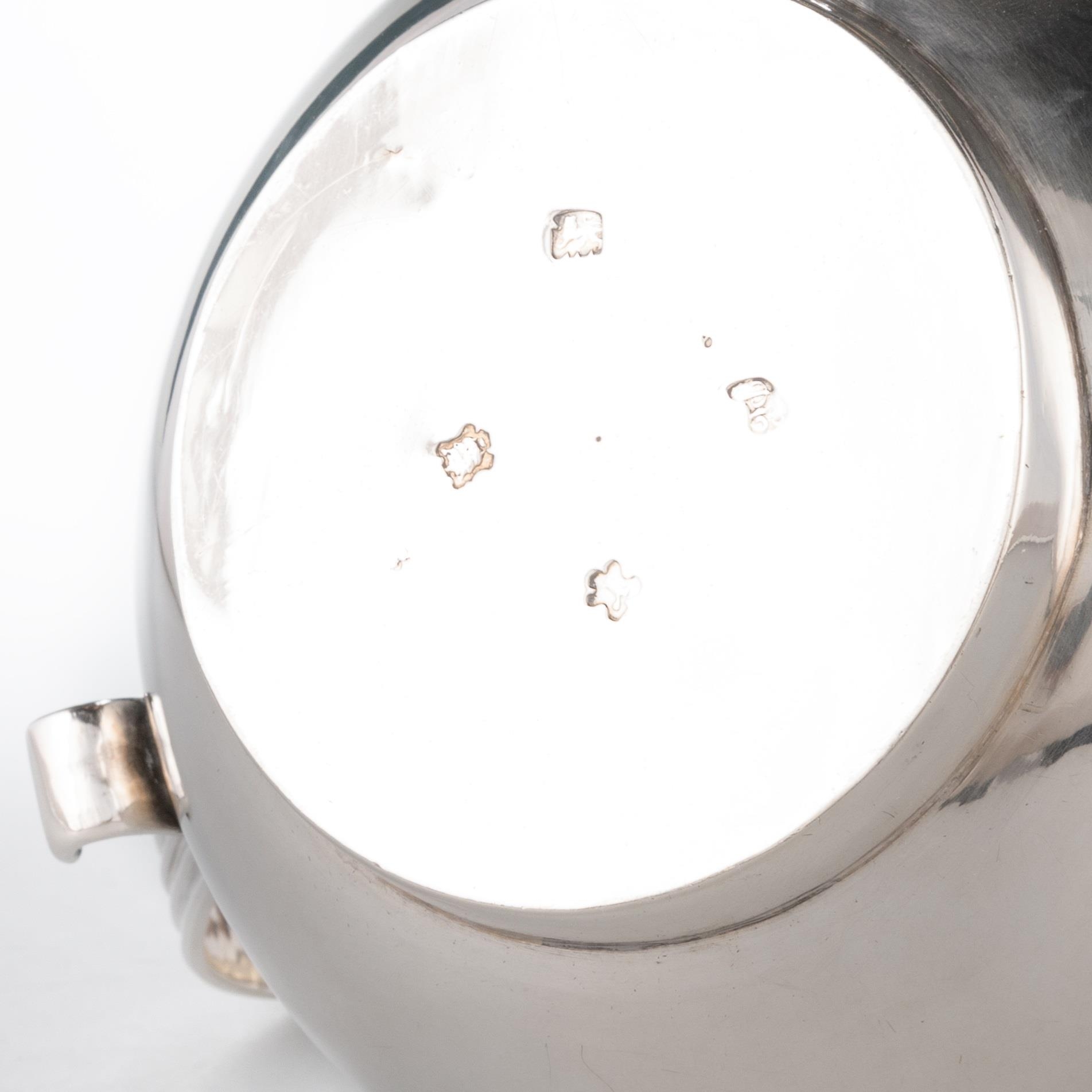 by Paul Crespin, London 1752, baluster form, with reeded collar and reeded strap handle, raised on a short circular foot. 13cm high overall, 18.3 troy ounces