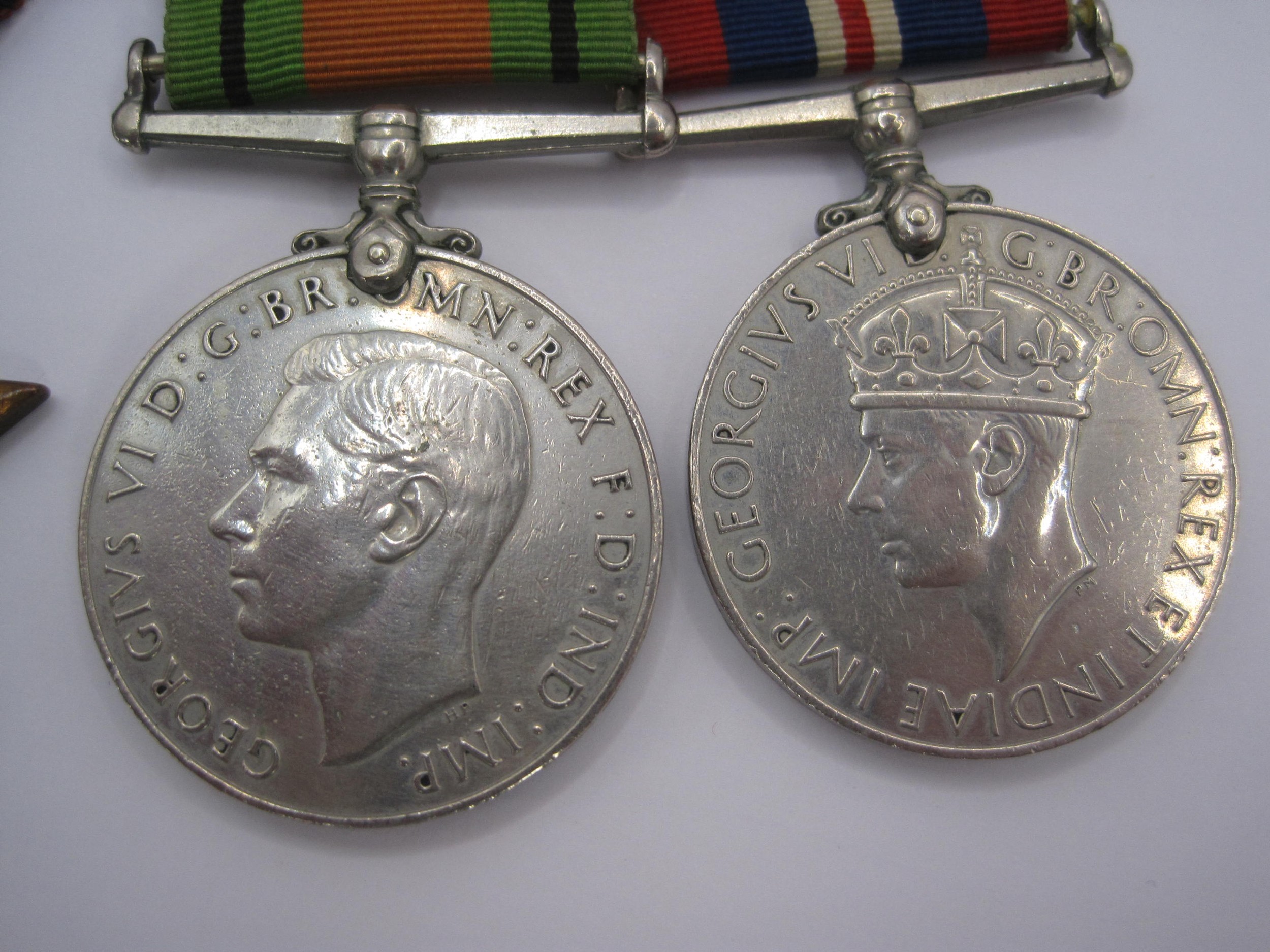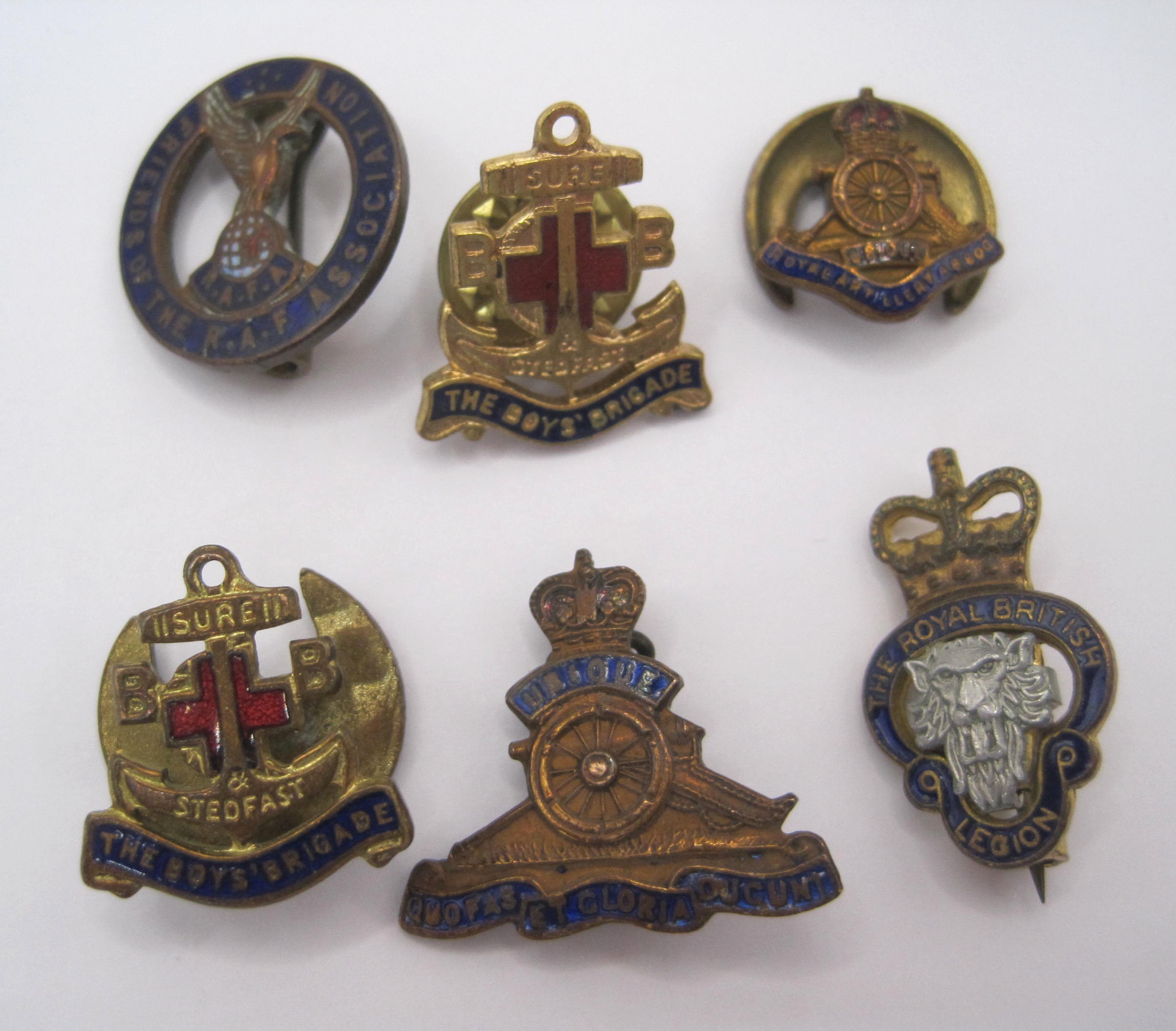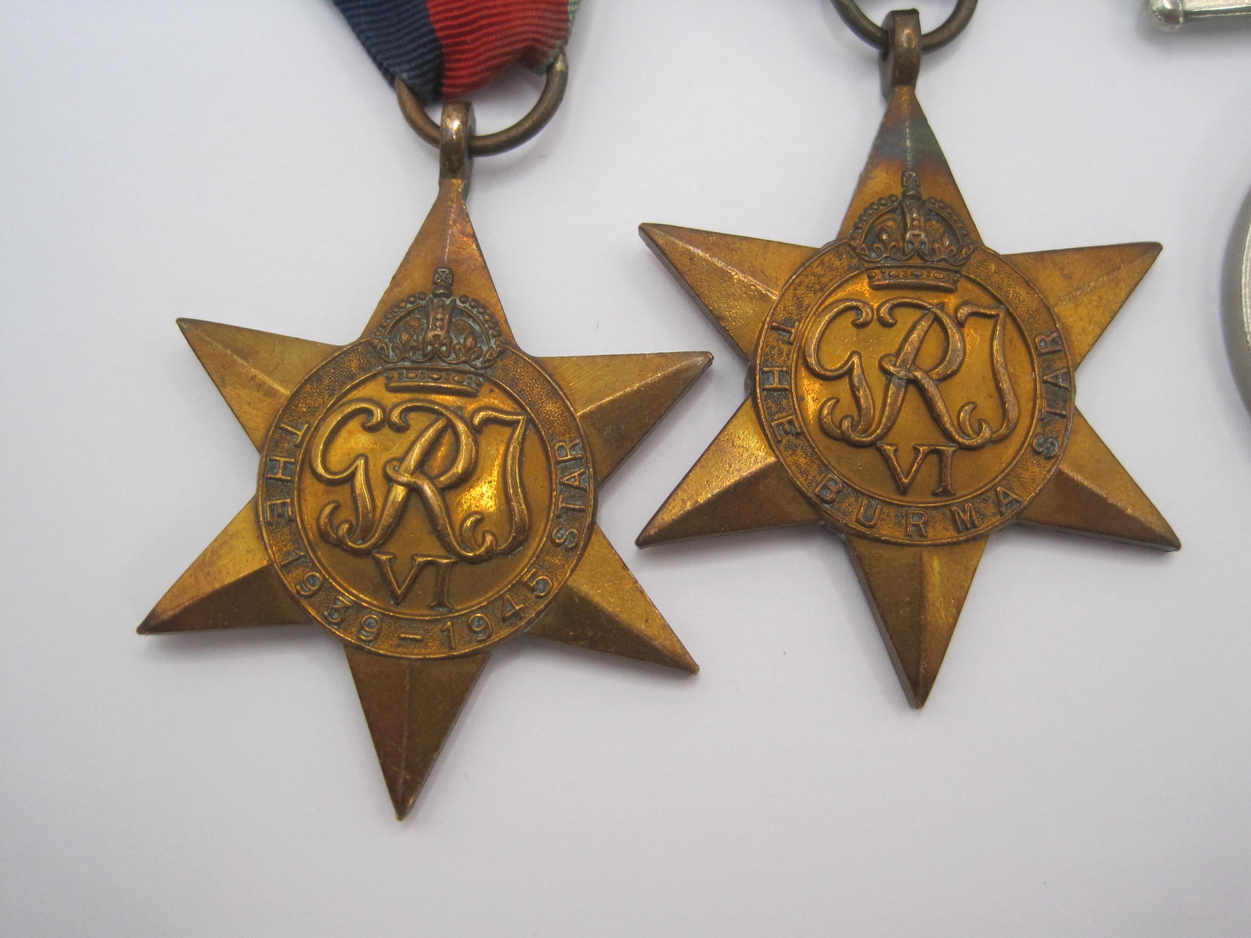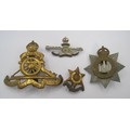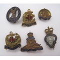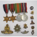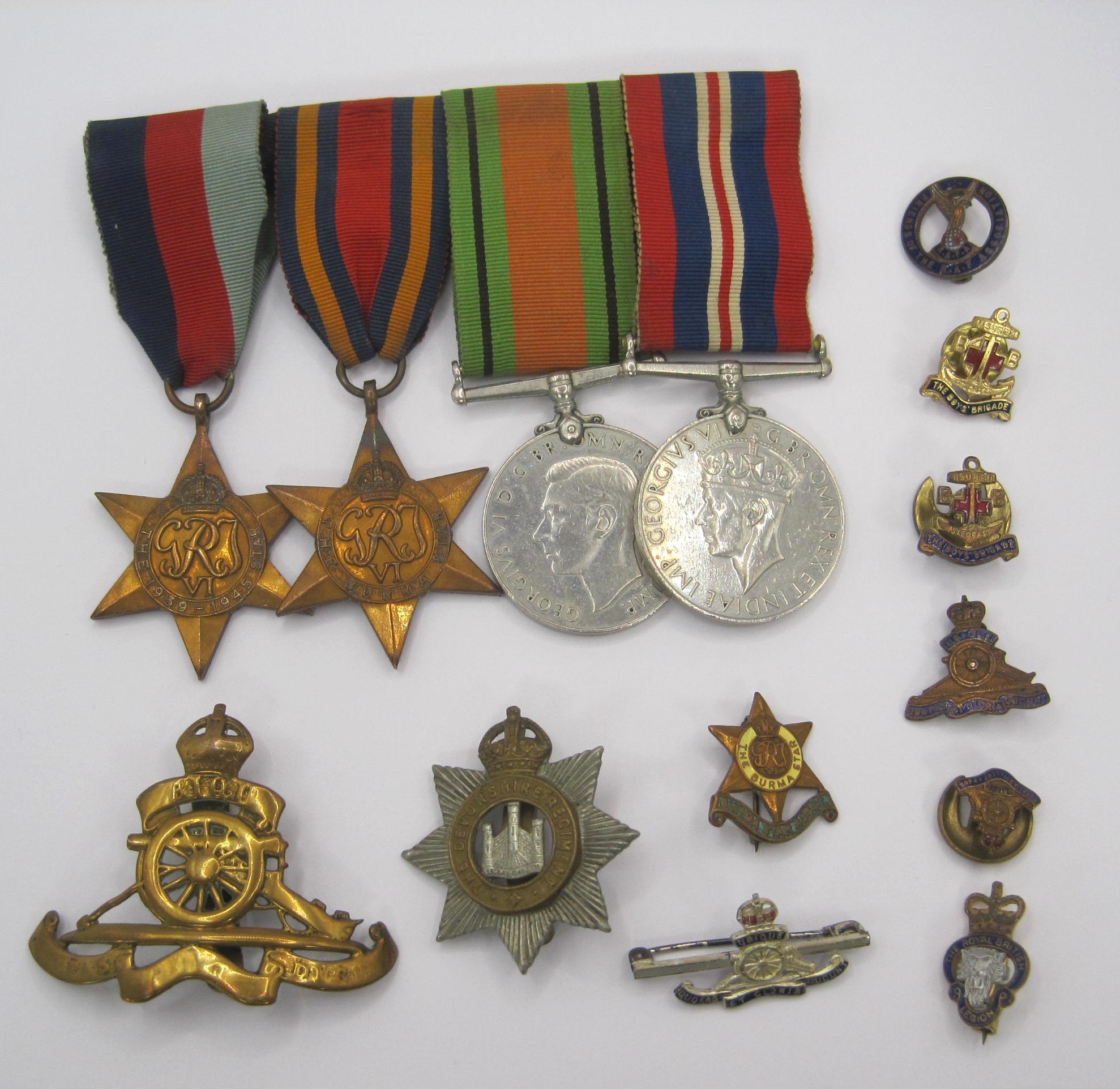 A group of four World War 2 medals and ribbons (Defence Medal, 1939-1945 War Medal, The 1939-1945 Star and The Burma Star), and ten military and service badges including The Devonshire Regiment and Royal Artillery Assoc.