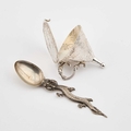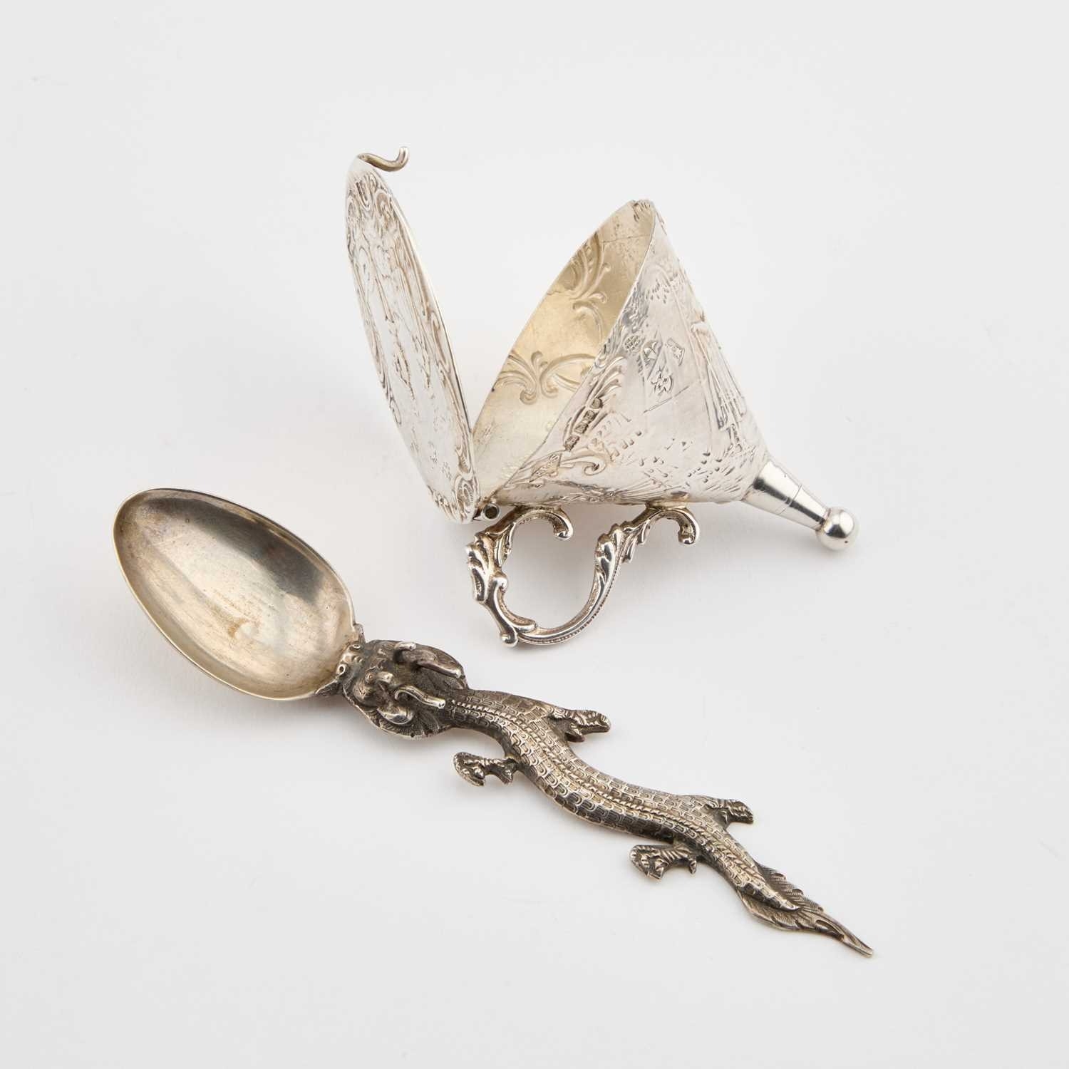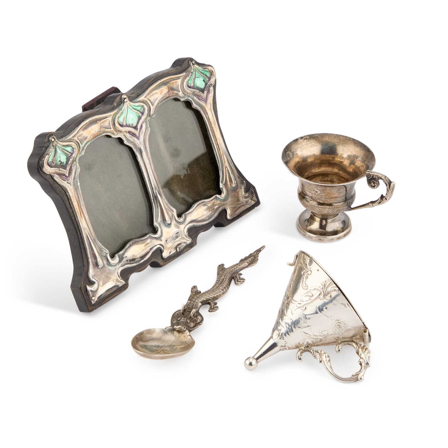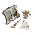 comprising a silver and enamel double photograph frame, stamped STERLING; a German silver funnel-form box; a Chinese silver spoon, with a dragon-form stem; and a Continental silver miniature cup. (4) Frame 7.8cm by 11.2cm, 2.2 troy ounces gross (excl. frame)