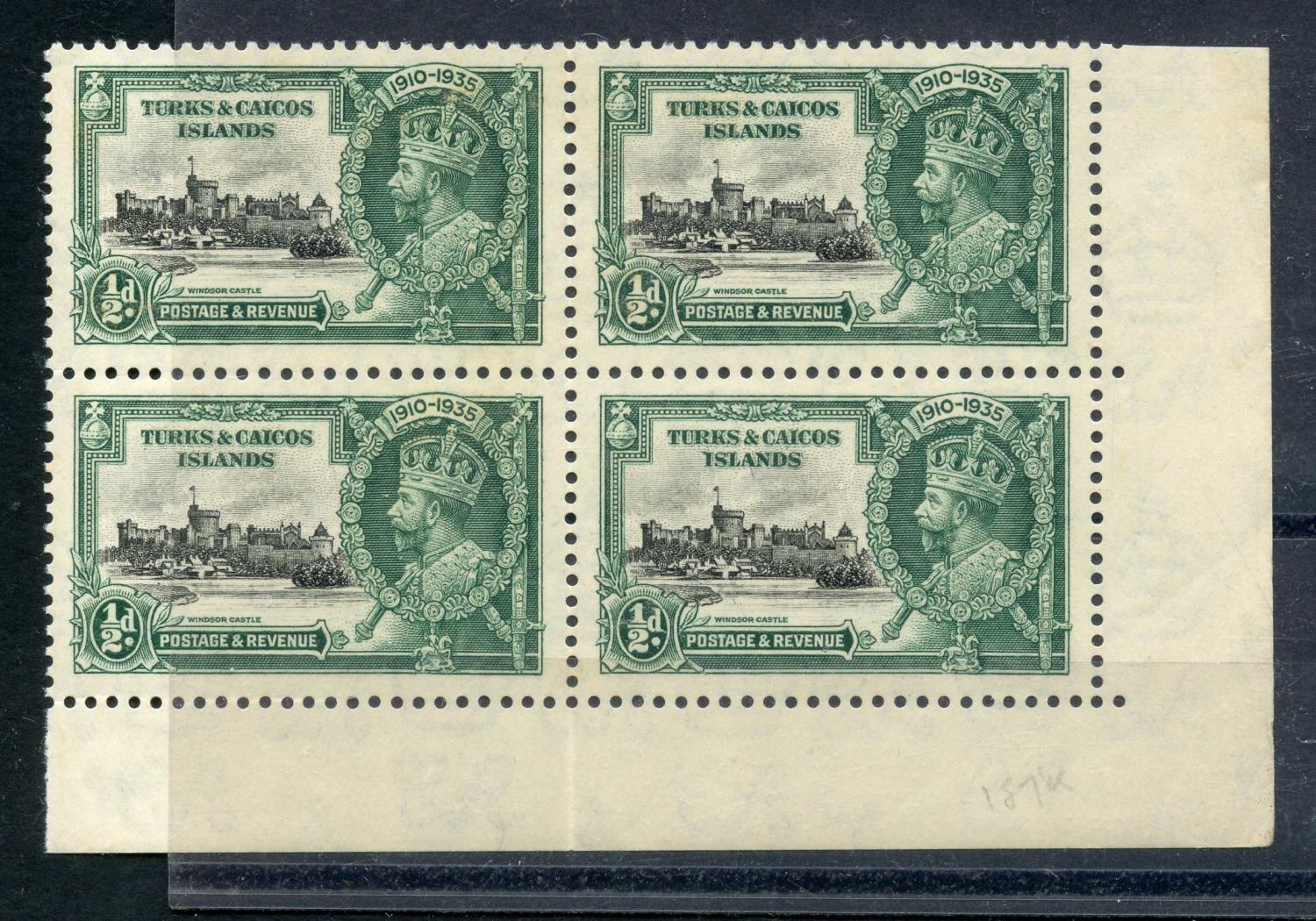 TURKS & CAICOS IS 1935 ½d Silver Jubilee showing the "Kite and vertical log" variety um in block of 4. SG 187k. Cat £45+
