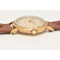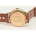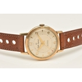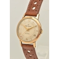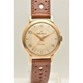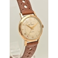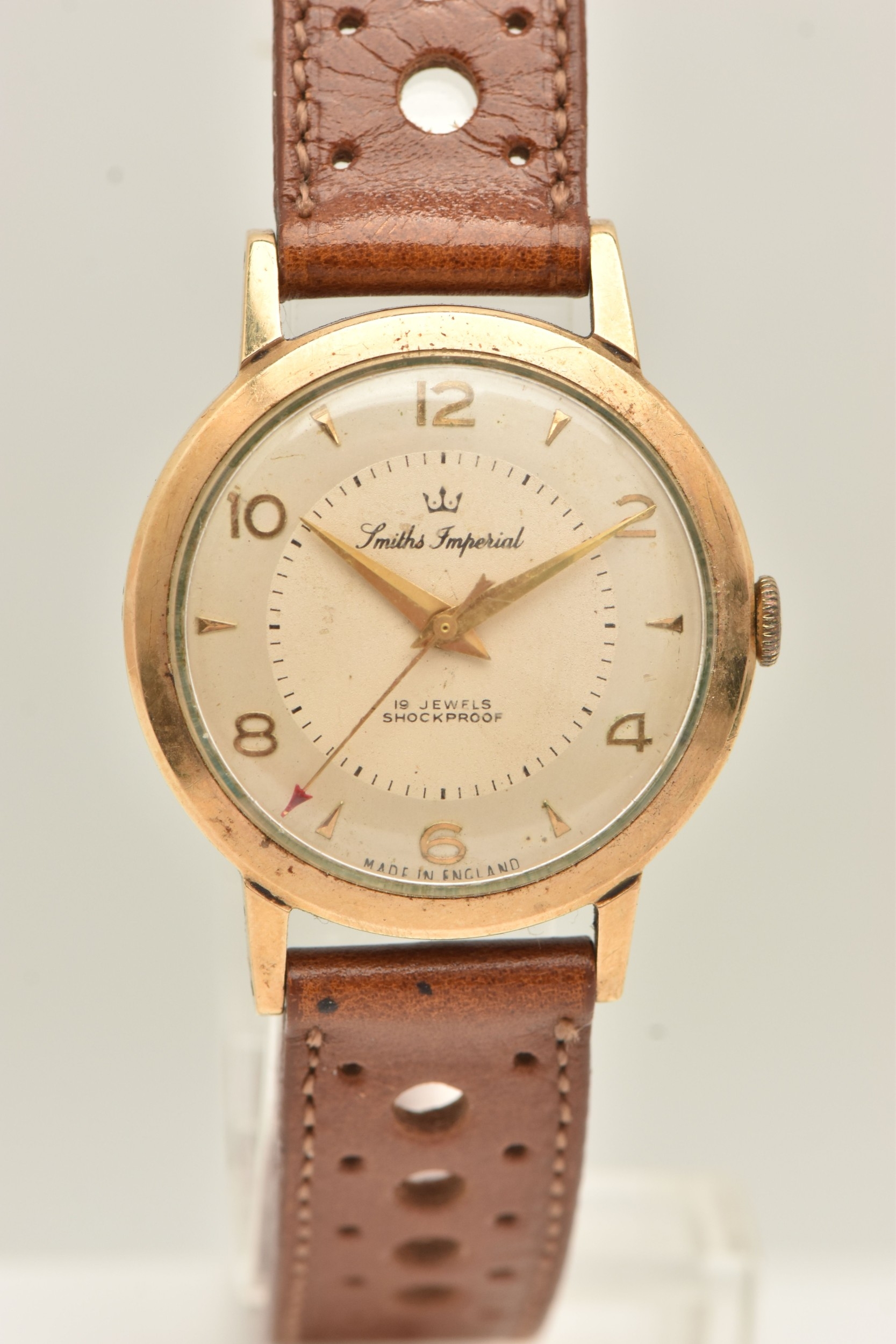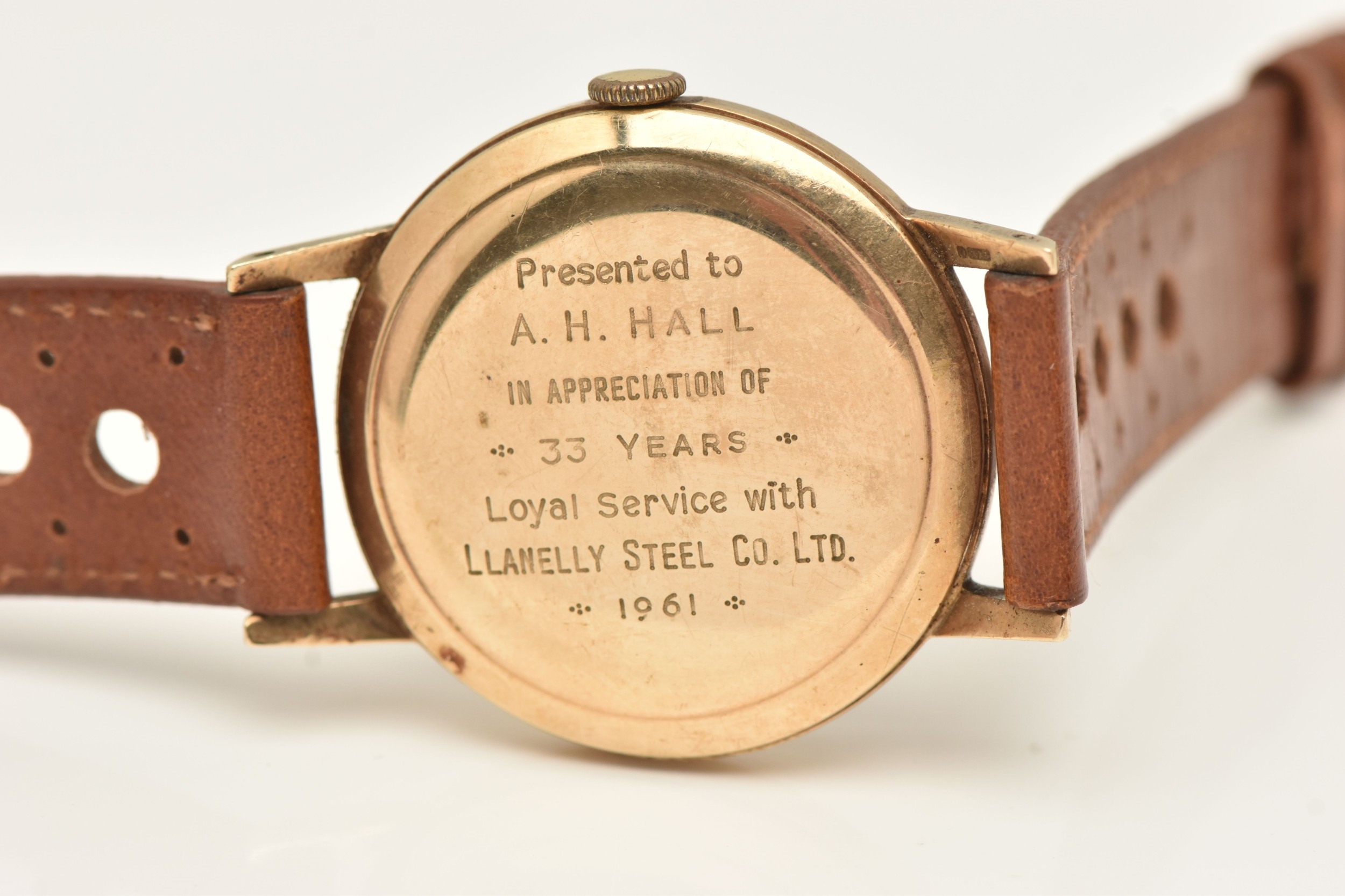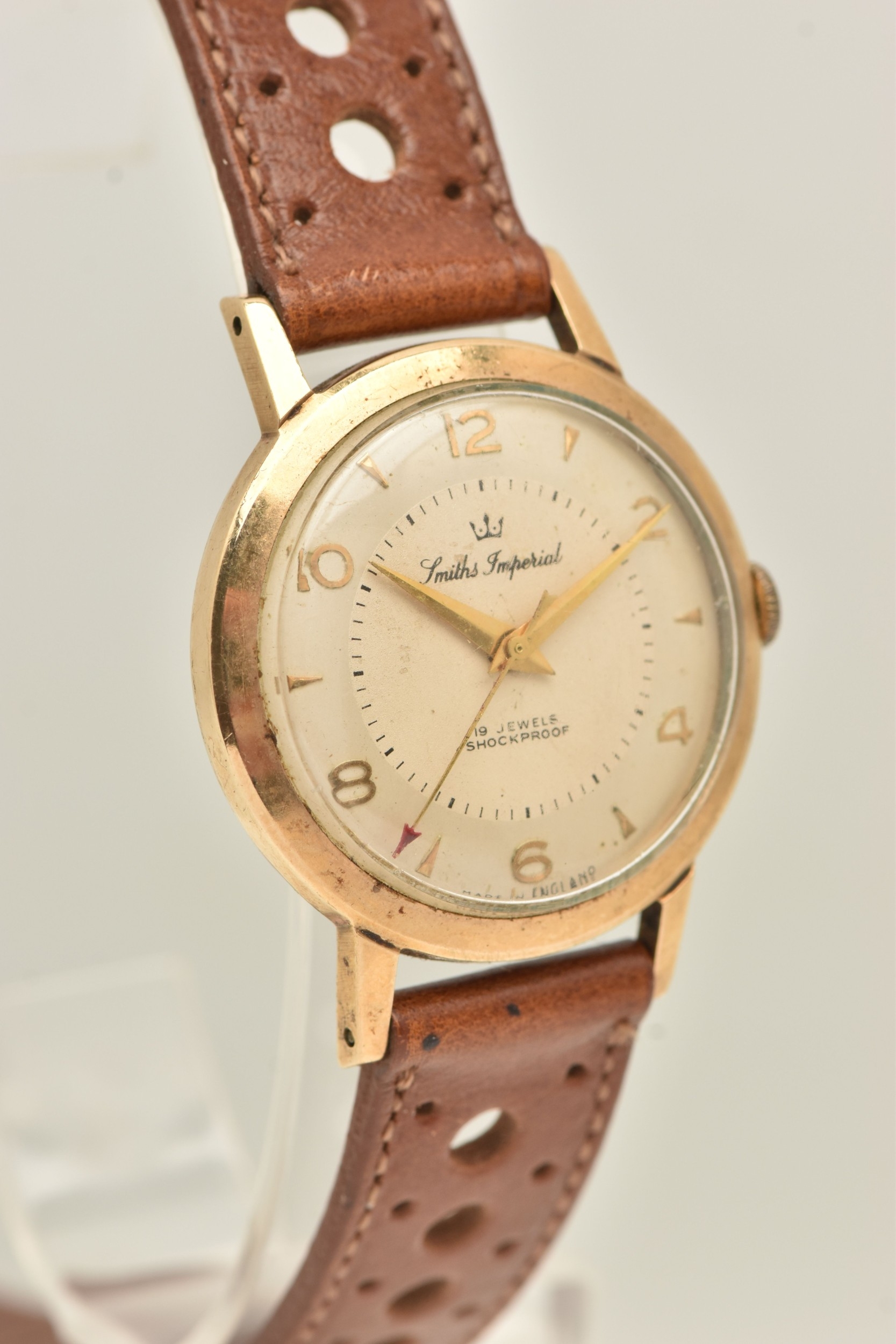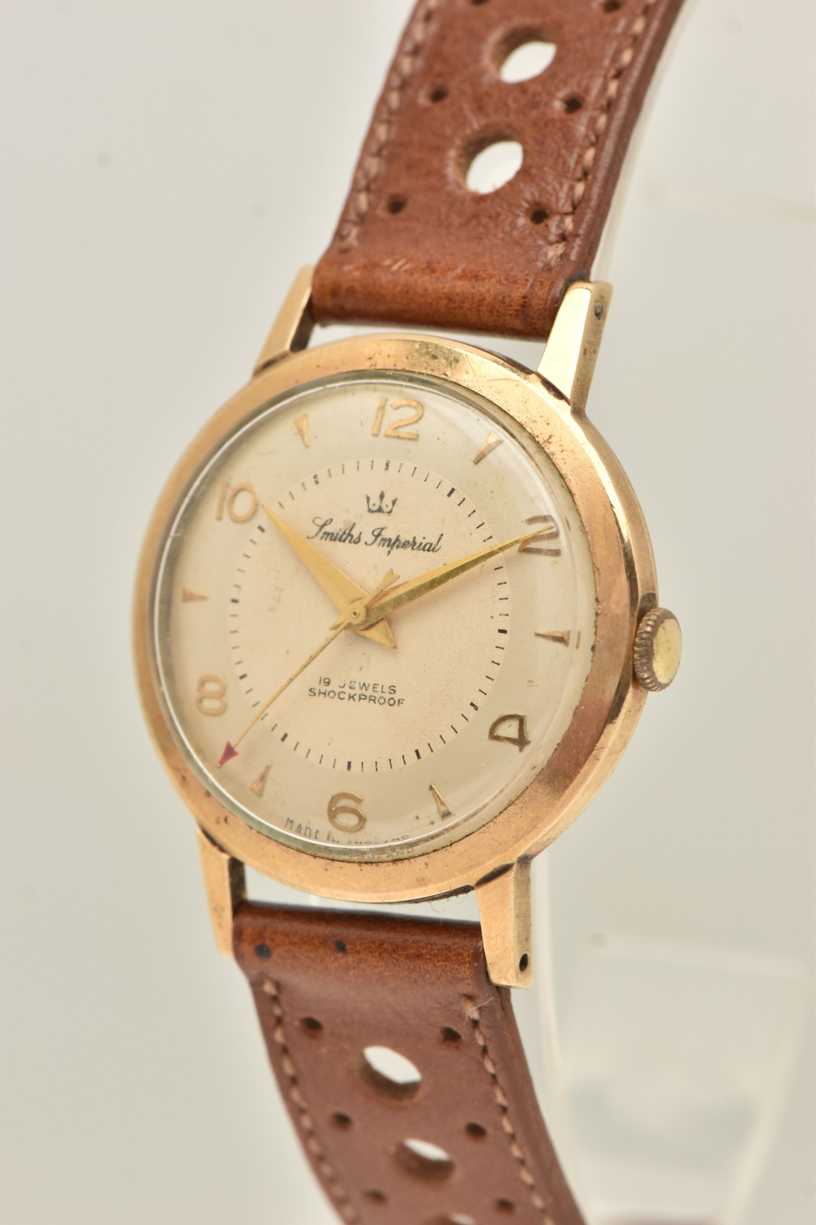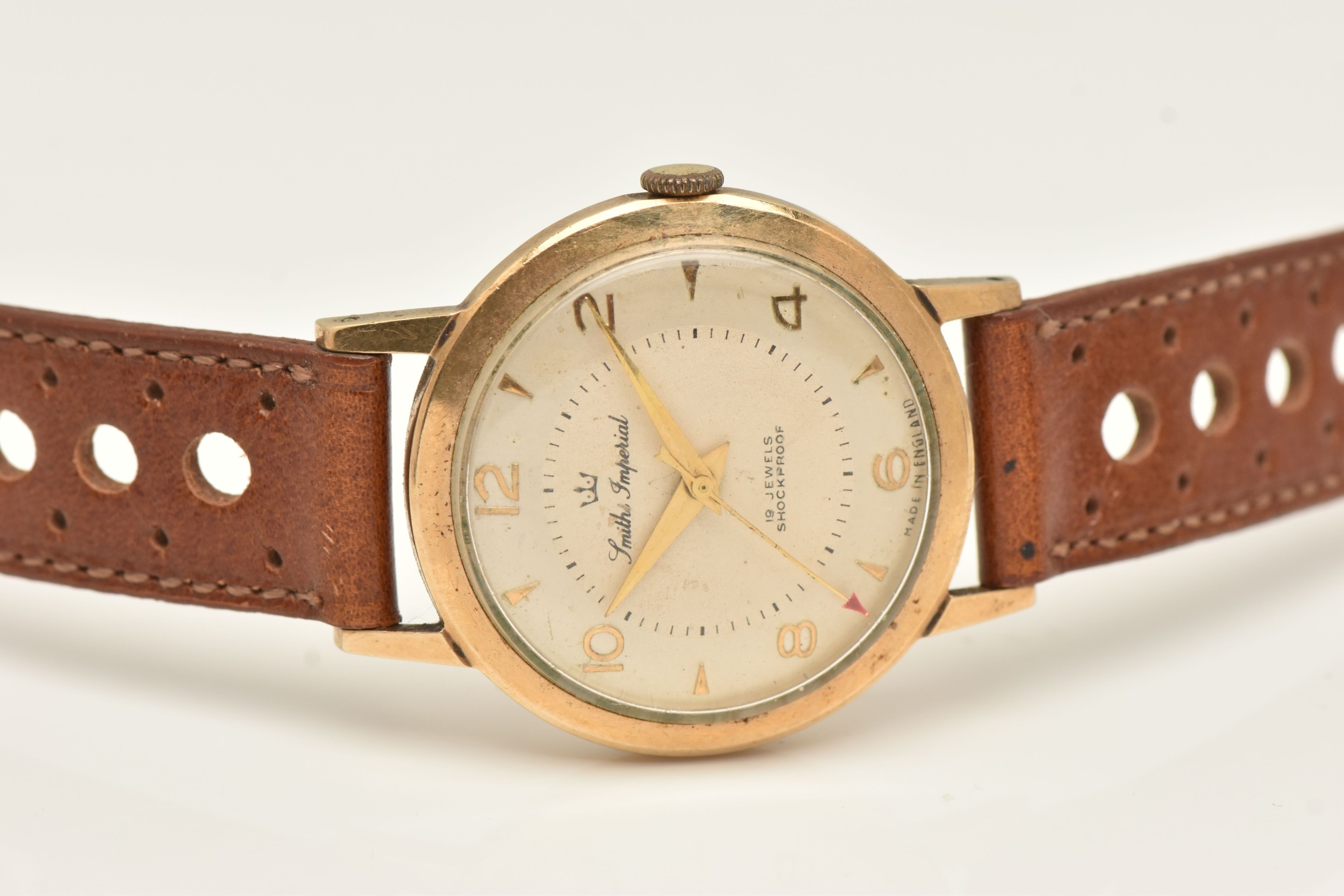 A GENTS 9CT GOLD 'SMITHS IMPERIAL' WRISTWATCH, manual wind, round silvered dial signed 'Smiths Imperial 19 Jewels Shockproof', alternating Arabic numerals and baton markers, red arrow seconds sweep, polished case with personal engraving reads 'Presented to A.H.HALL In Appreciation of 33 Years Loyal Service with Llanelly Steel Co Ltd 1961', movement unsigned, calibre 0104, approximate case width 32.6mm, approximate case back weight 4.5 grams, fitted with a brown strap and ardillon buckle (condition report: watch winds, sets and runs at time of cataloguing, although time keeping has not been tested, would benefit from a gentle clean, strap in overall good condition, we cannot guarantee the working order of any watch)