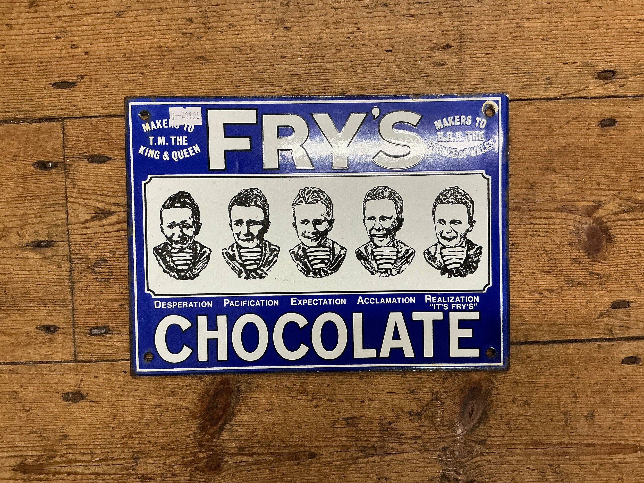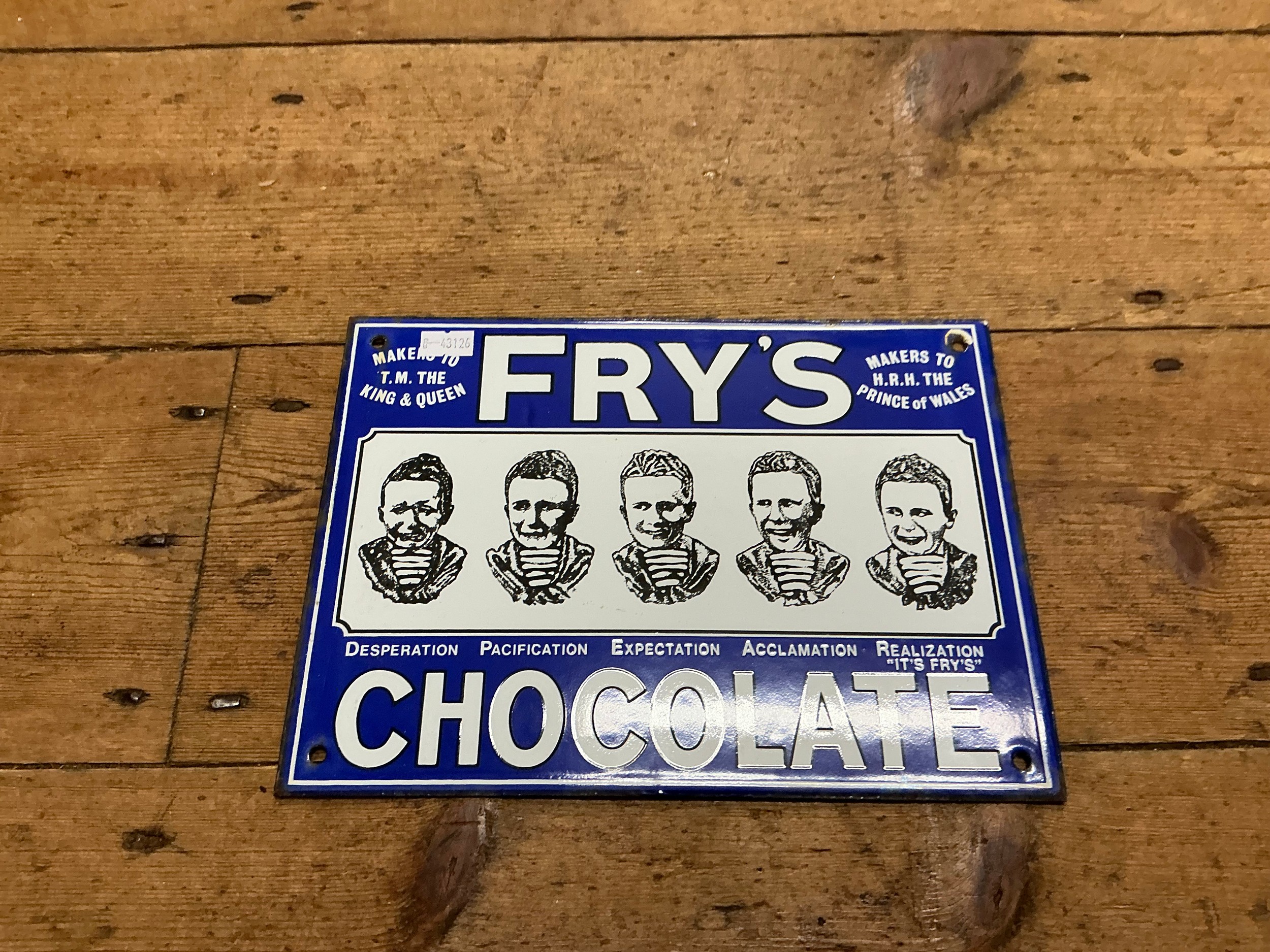 A Scarce Vintage Tin & Enamel "FRY'S" Chocolate Advertising Sign. Measuring: 26cms x 19cms.