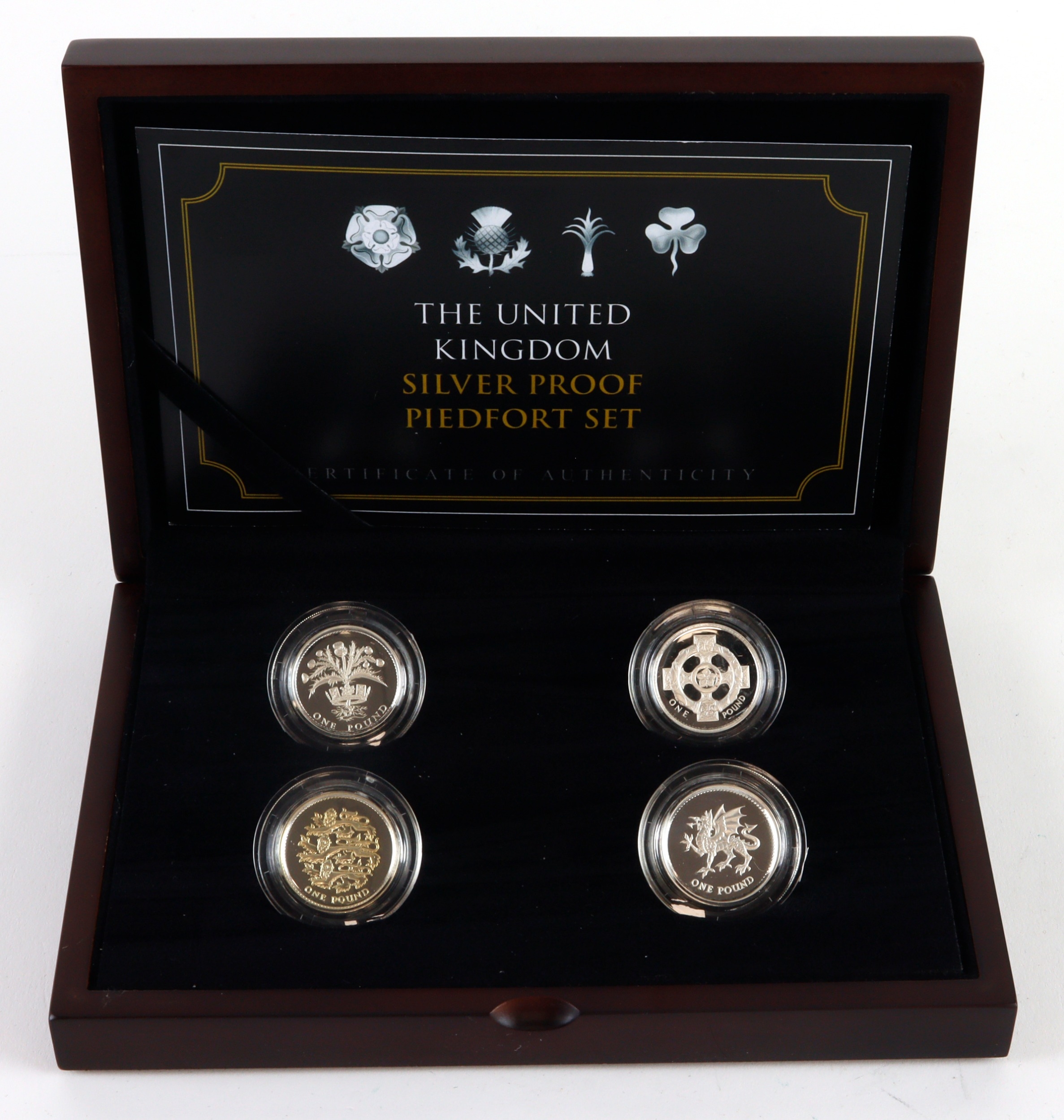 One Pound Silver Proof Piedfort four coin set 1989, 1996, 1997 (toned) & 2000 FDC in a non royal mint box with certificate