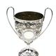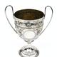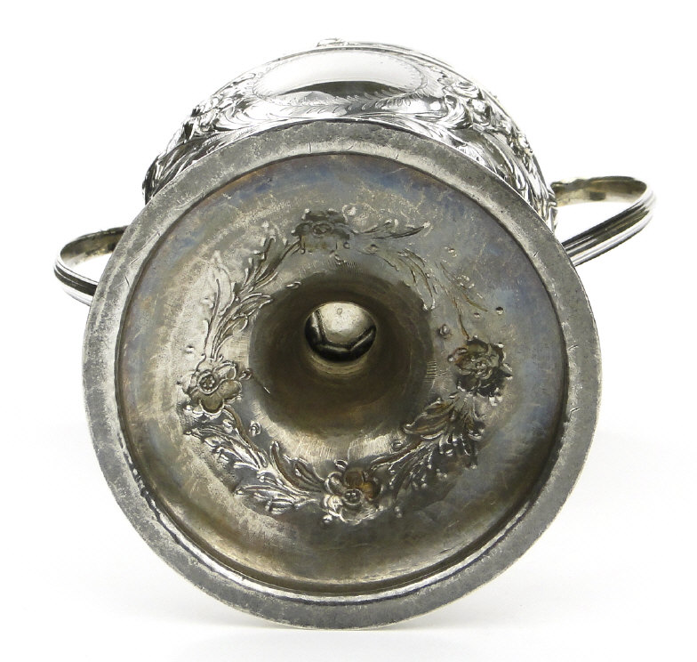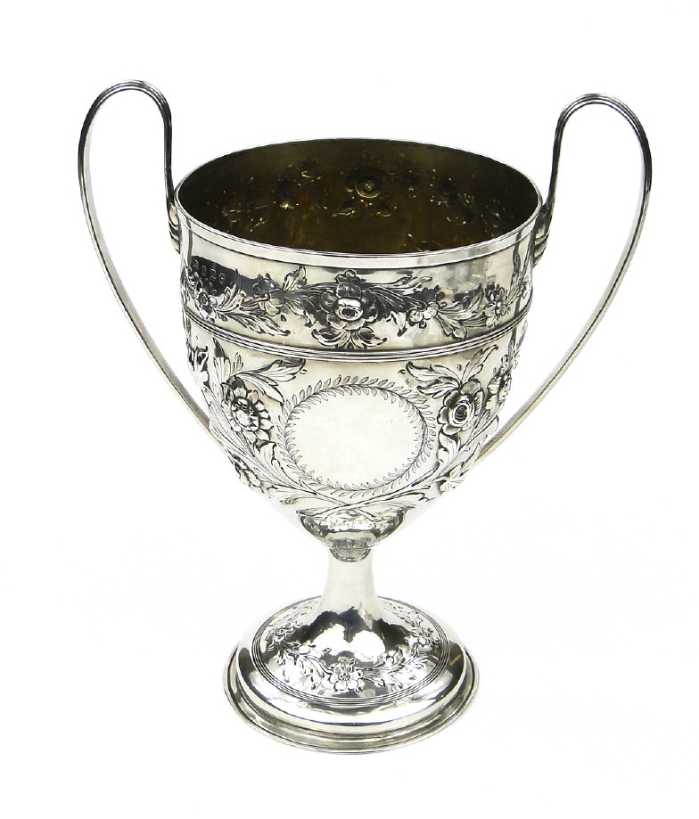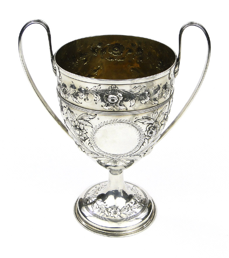 Georgian silver two handled trophy embossed with flowers and blank cartouches, raised on a circular foot, London 1807-08, 24cm high