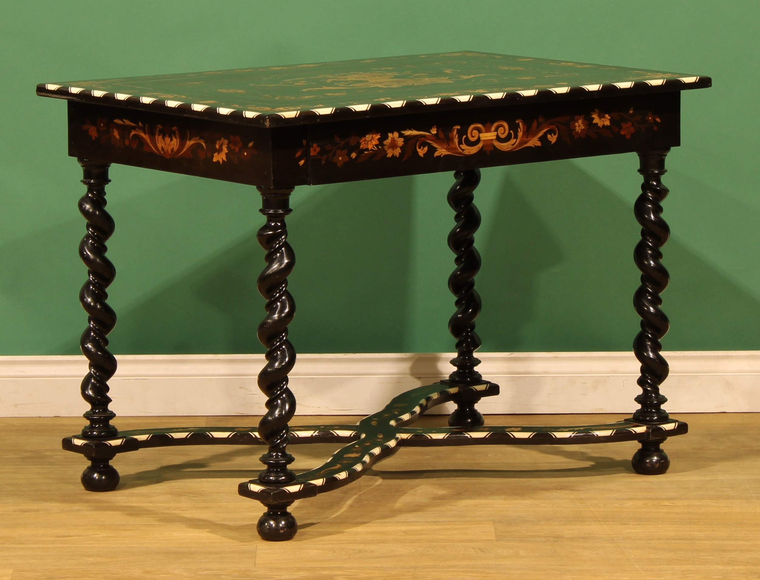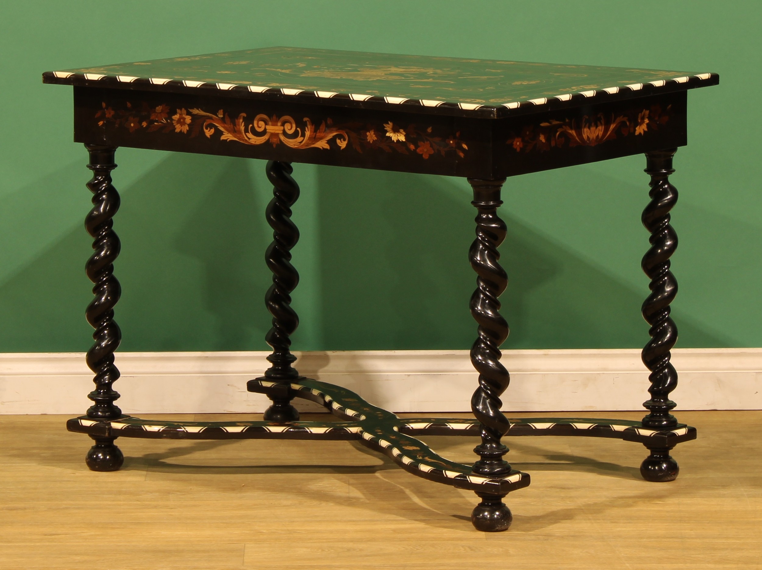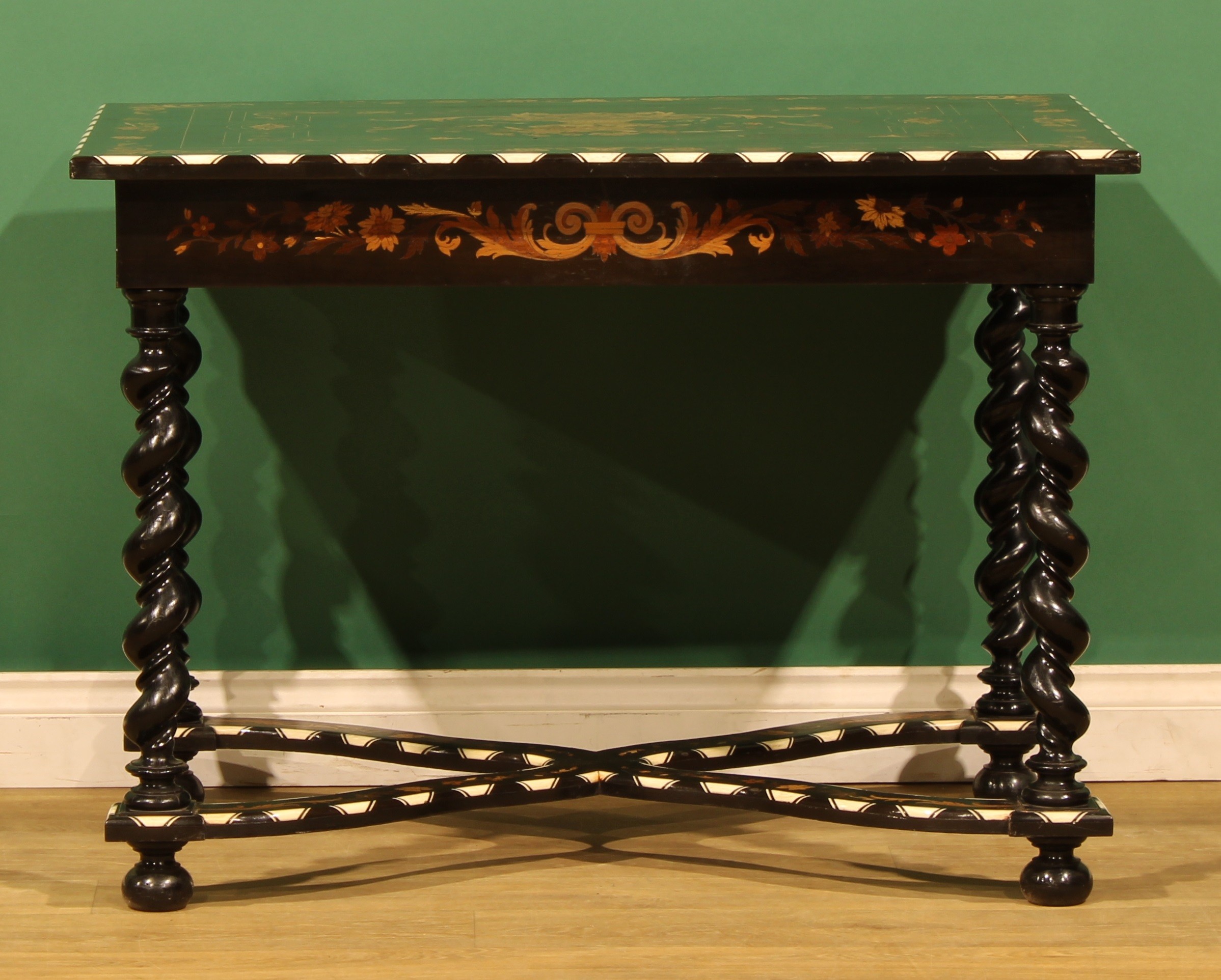 A 19th century Dutch ebonised, marquetry and bone centre table, rectangular top inlaid with a flowering urn within a border of acanthus and flowering leafy stems, drawer to frieze, spirally turned supports, shaped X-stretcher, bun feet, 72.5cm high, 100cm wide, 68cm deep