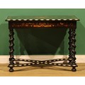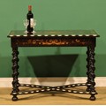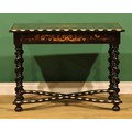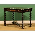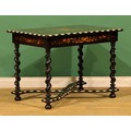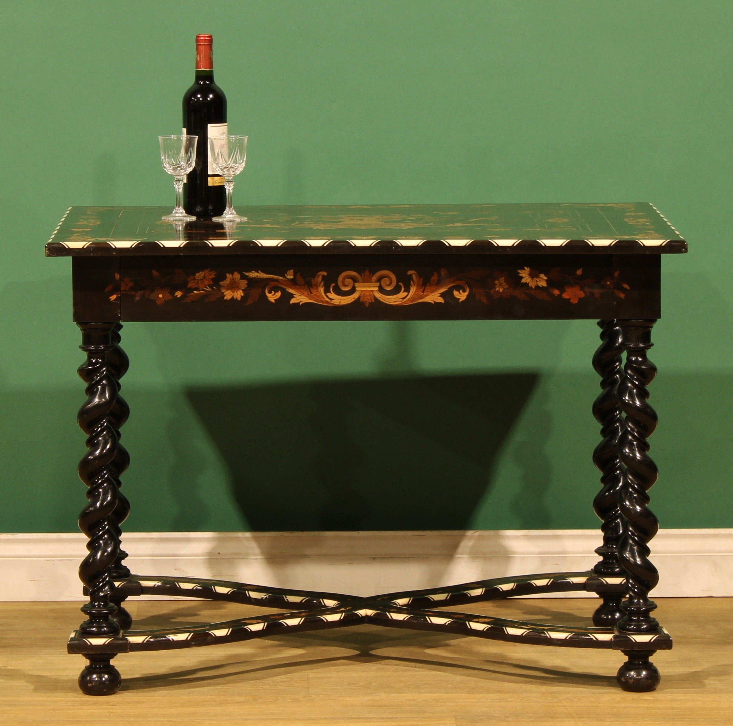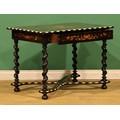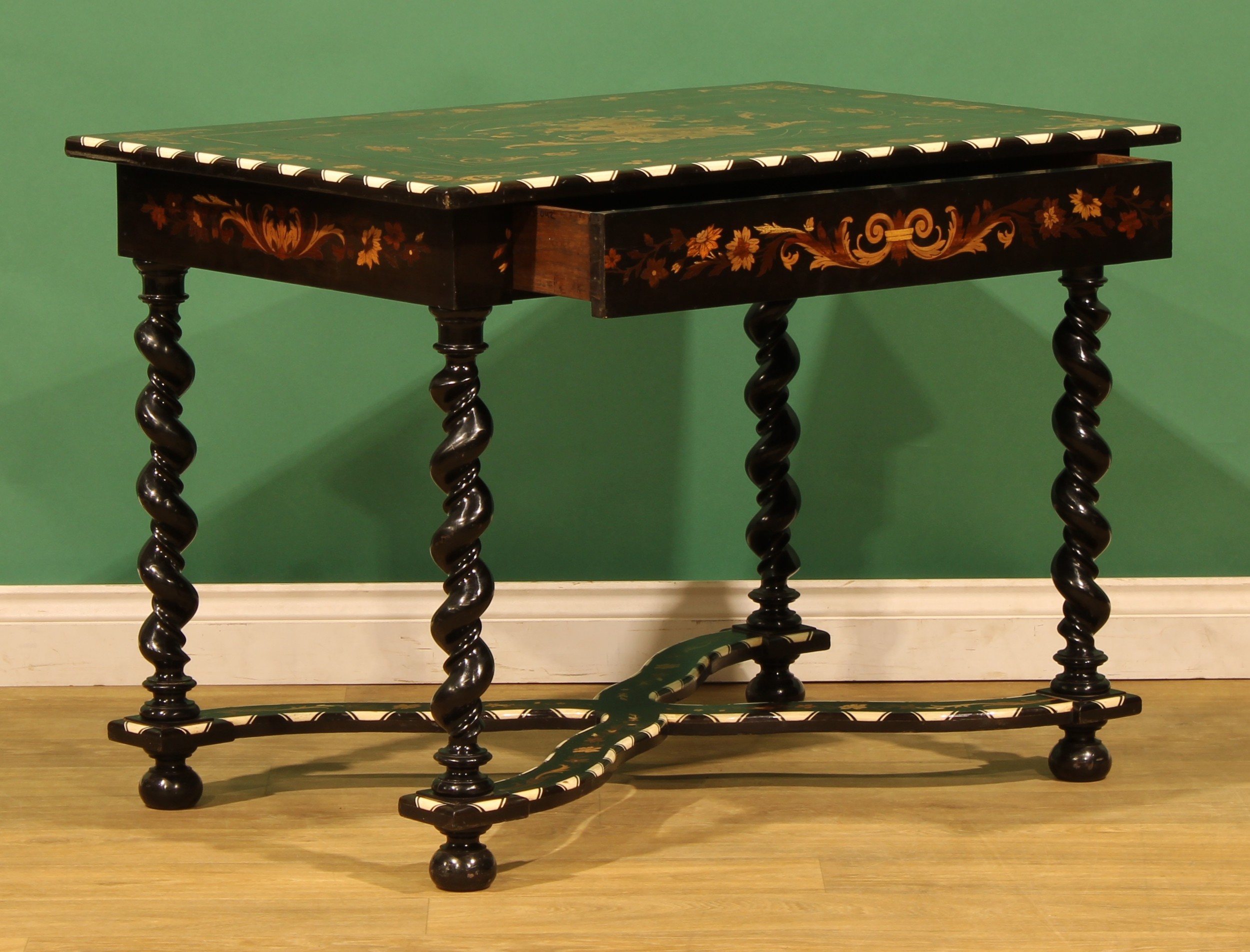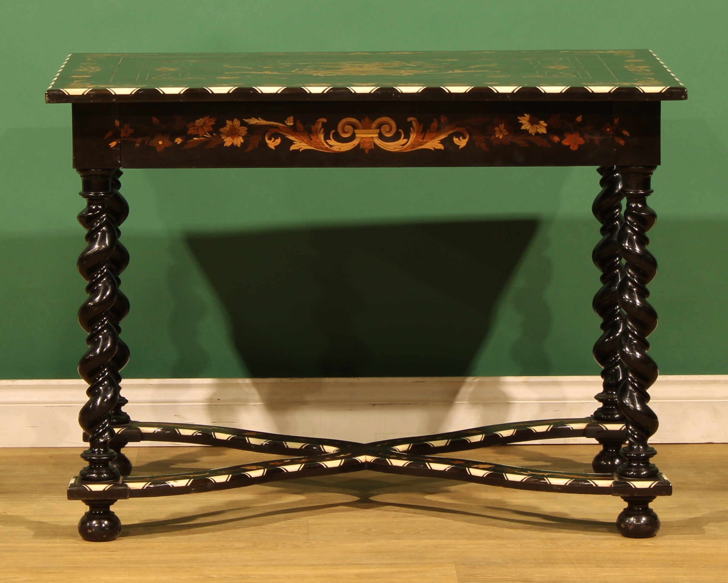 A 19th century Dutch ebonised, marquetry and bone centre table, rectangular top inlaid with a flowering urn within a border of acanthus and flowering leafy stems, drawer to frieze, spirally turned supports, shaped X-stretcher, bun feet, 72.5cm high, 100cm wide, 68cm deep