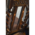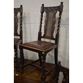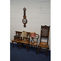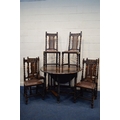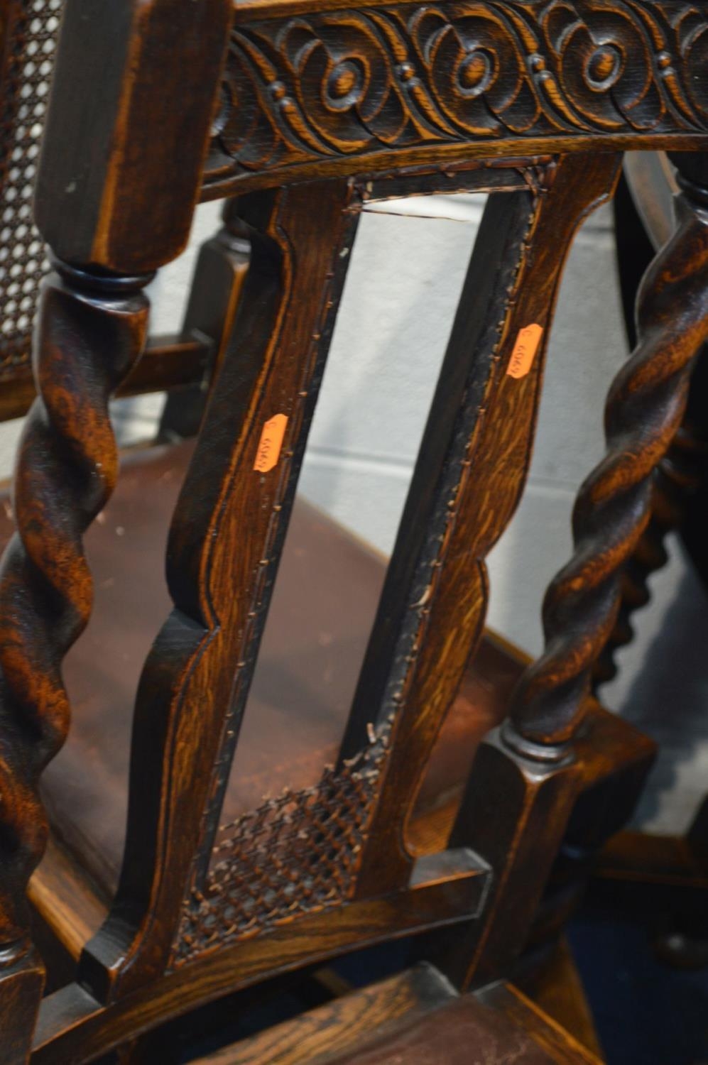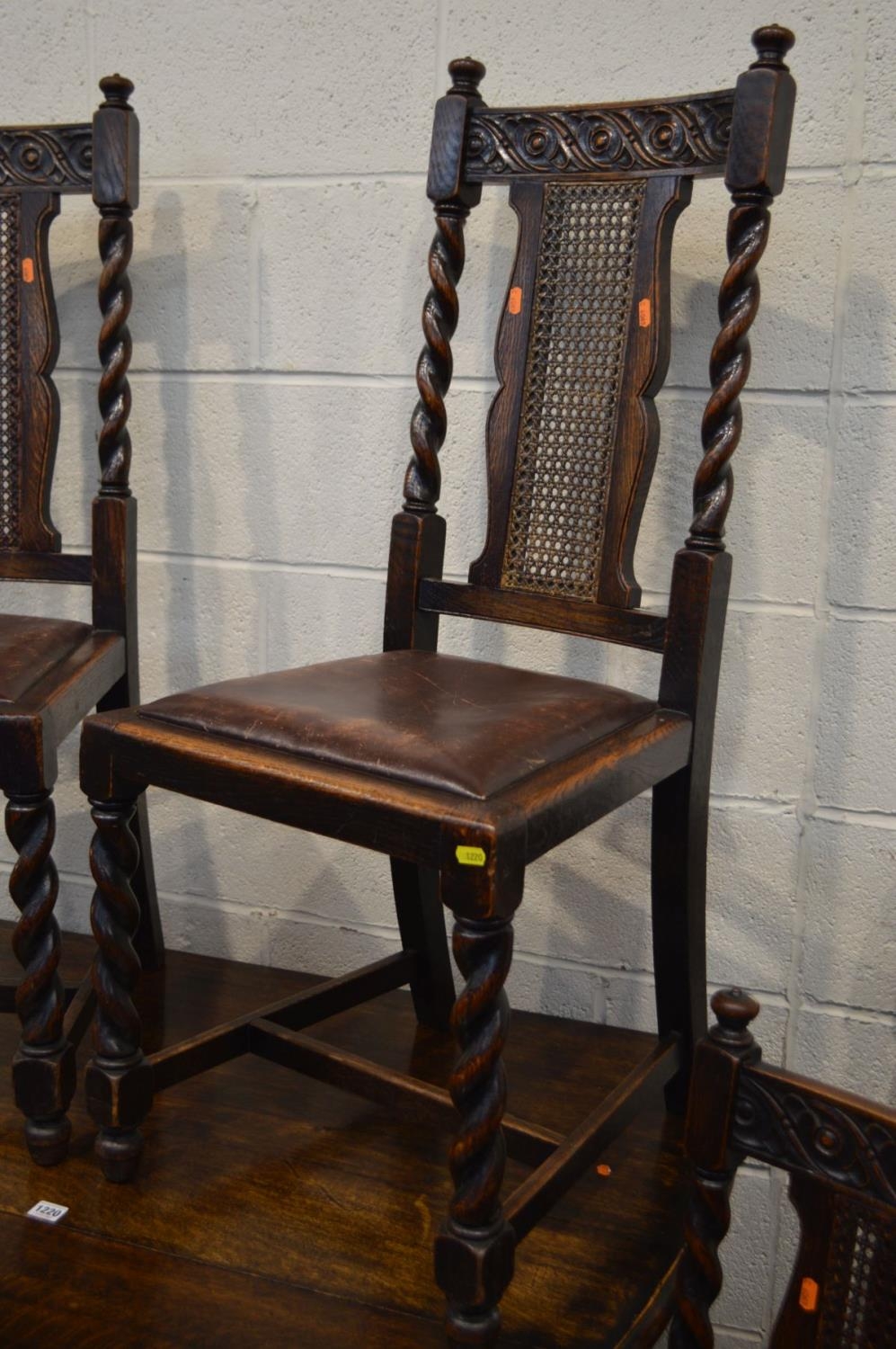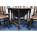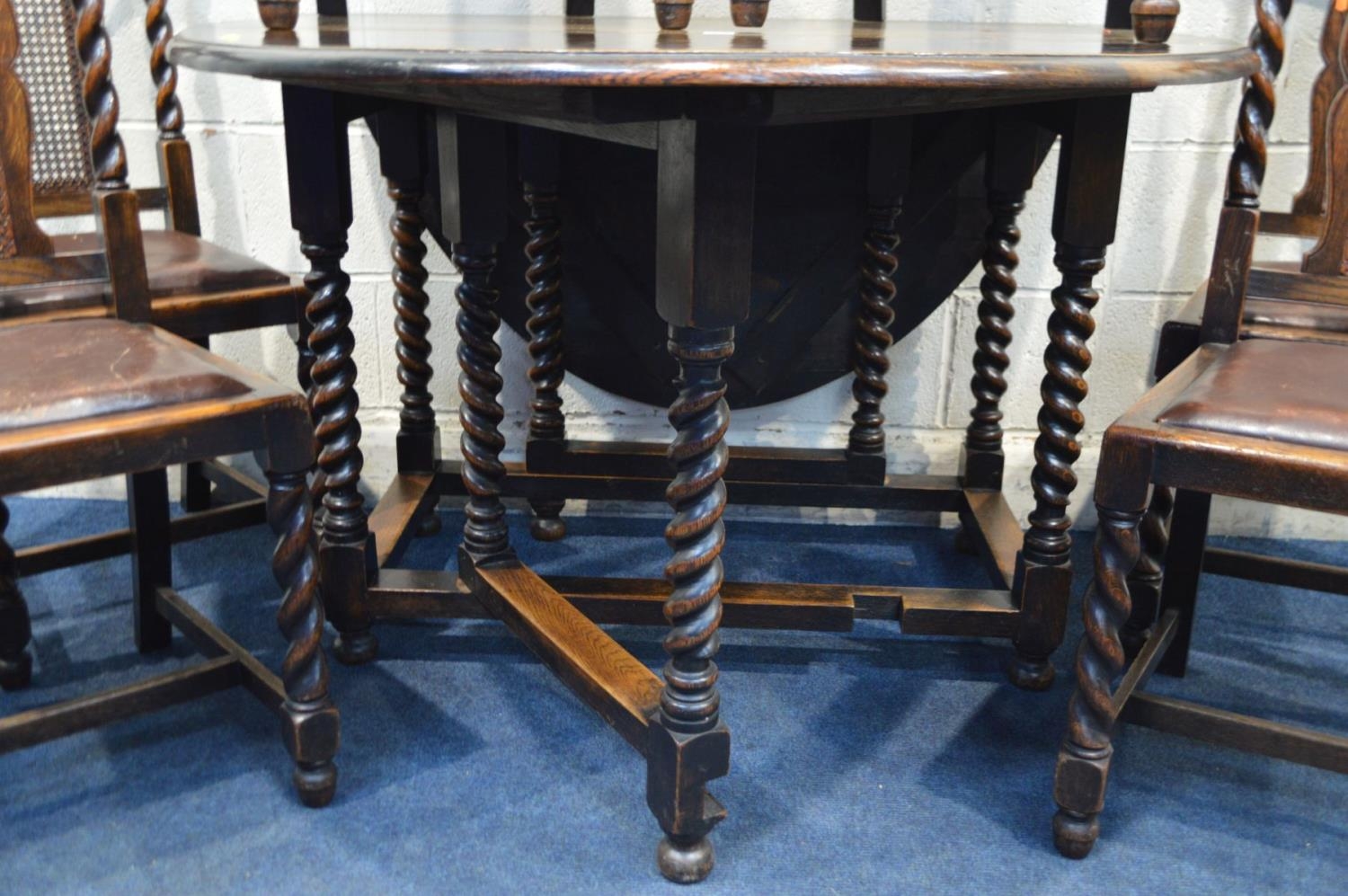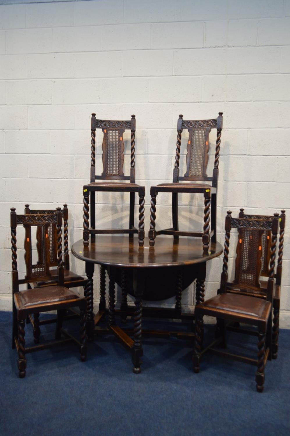 AN EARLY 20TH CENTURY OAK BARLEY TWIST GATE LEG TABLE, open length 173cm x closed 60cm x depth 120cm x height 78cm and a set of six oak chairs with a cane back (missing cane work to one chair) (7)