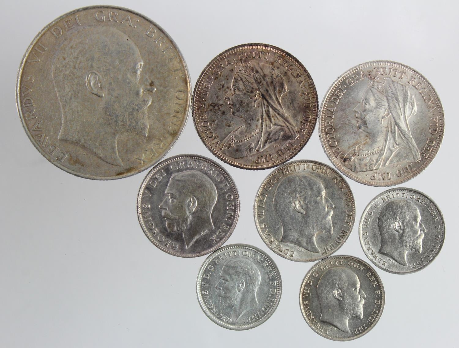 GB silver in better grade (8) Halfcrown 1902, Shillings 1893 & 1898, Sixpences 1902 & 1915, Threepences 1902, 03 & 1926. nEF - GEF