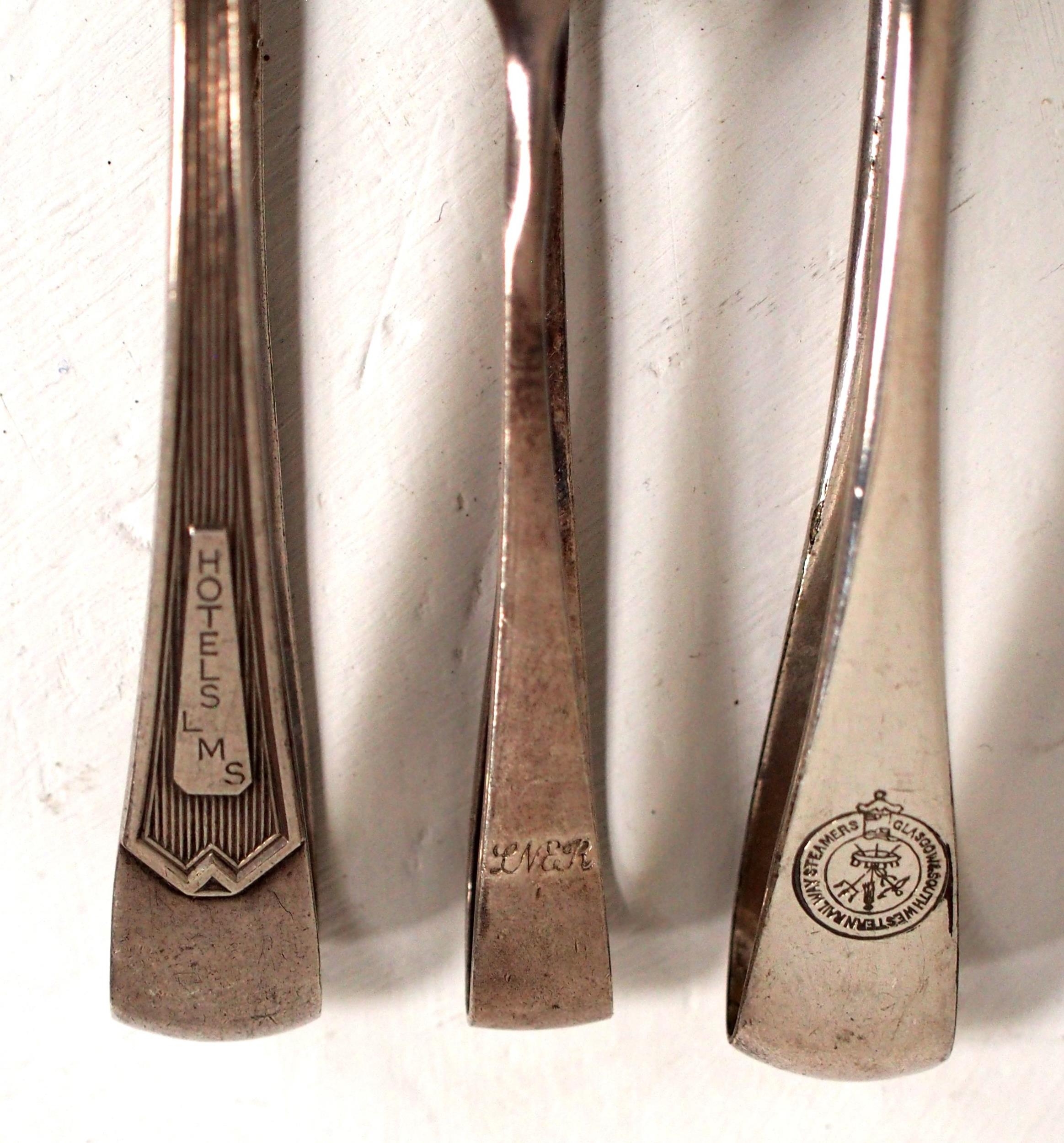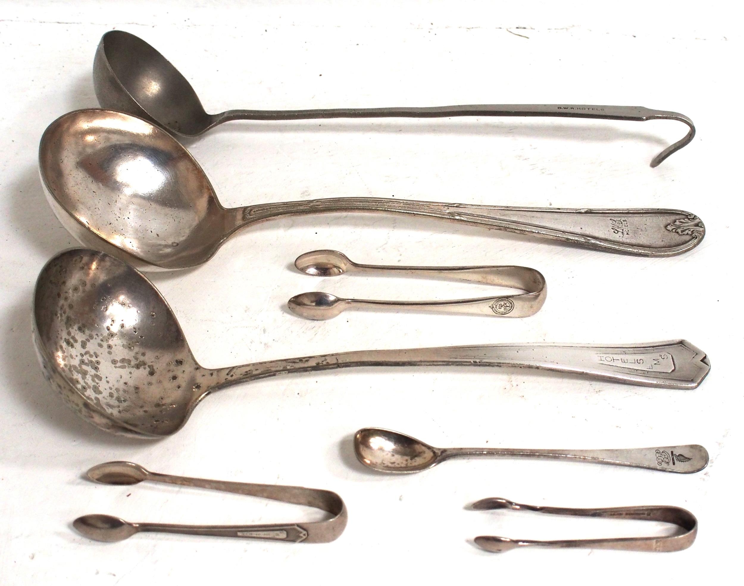 LMS Hotels sugar tongs (Mappin & Webb), Glasgow South Western Rly same (Walker & Hall), GER sundae spoon, LMS ladles (both Mappin & Webb), GWR Hotels (Elkington), LNER sugar tongs (Hutton). (7) (D2) (Dispatch by Mailboxes/Collect from Banbury Depot)