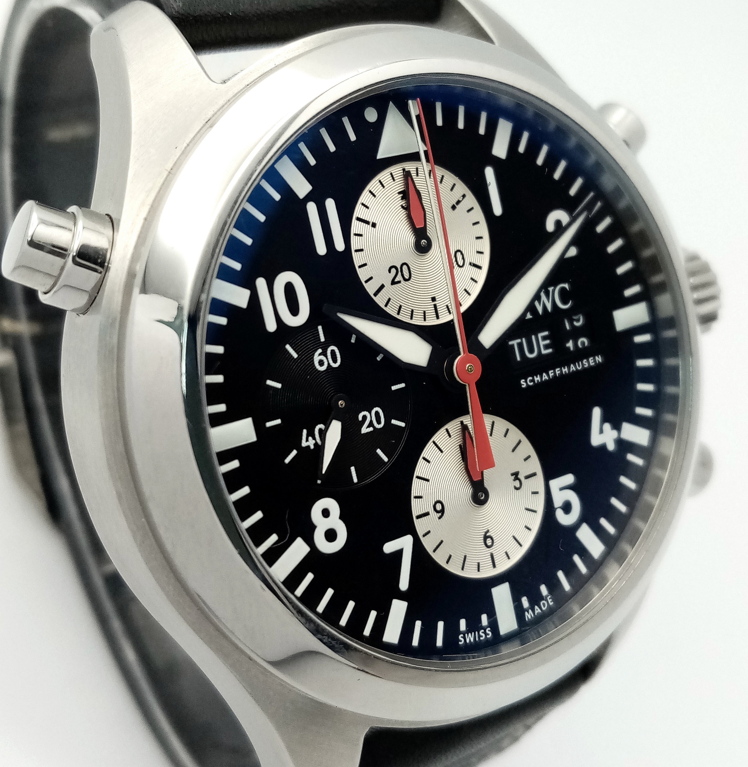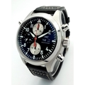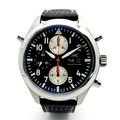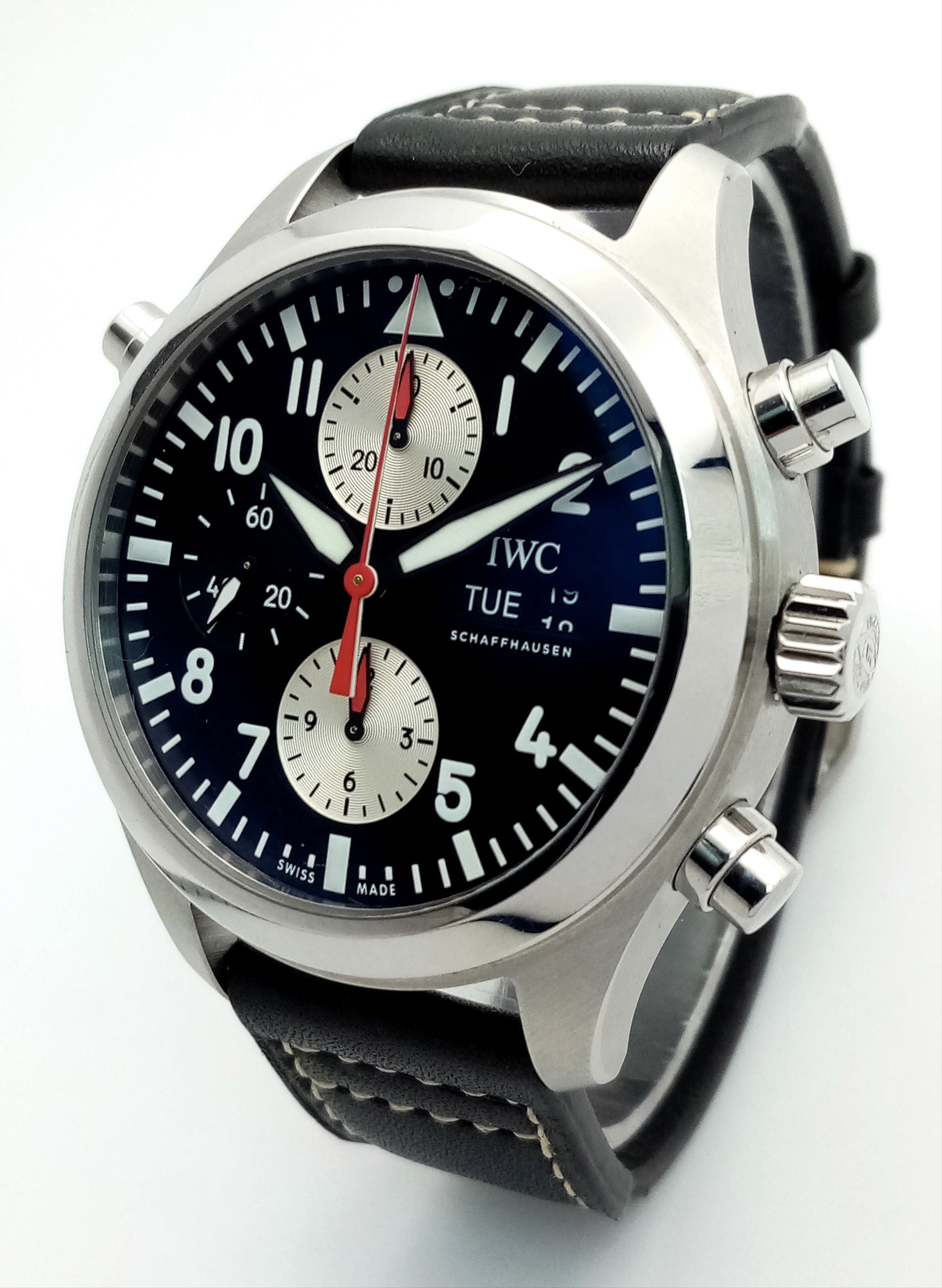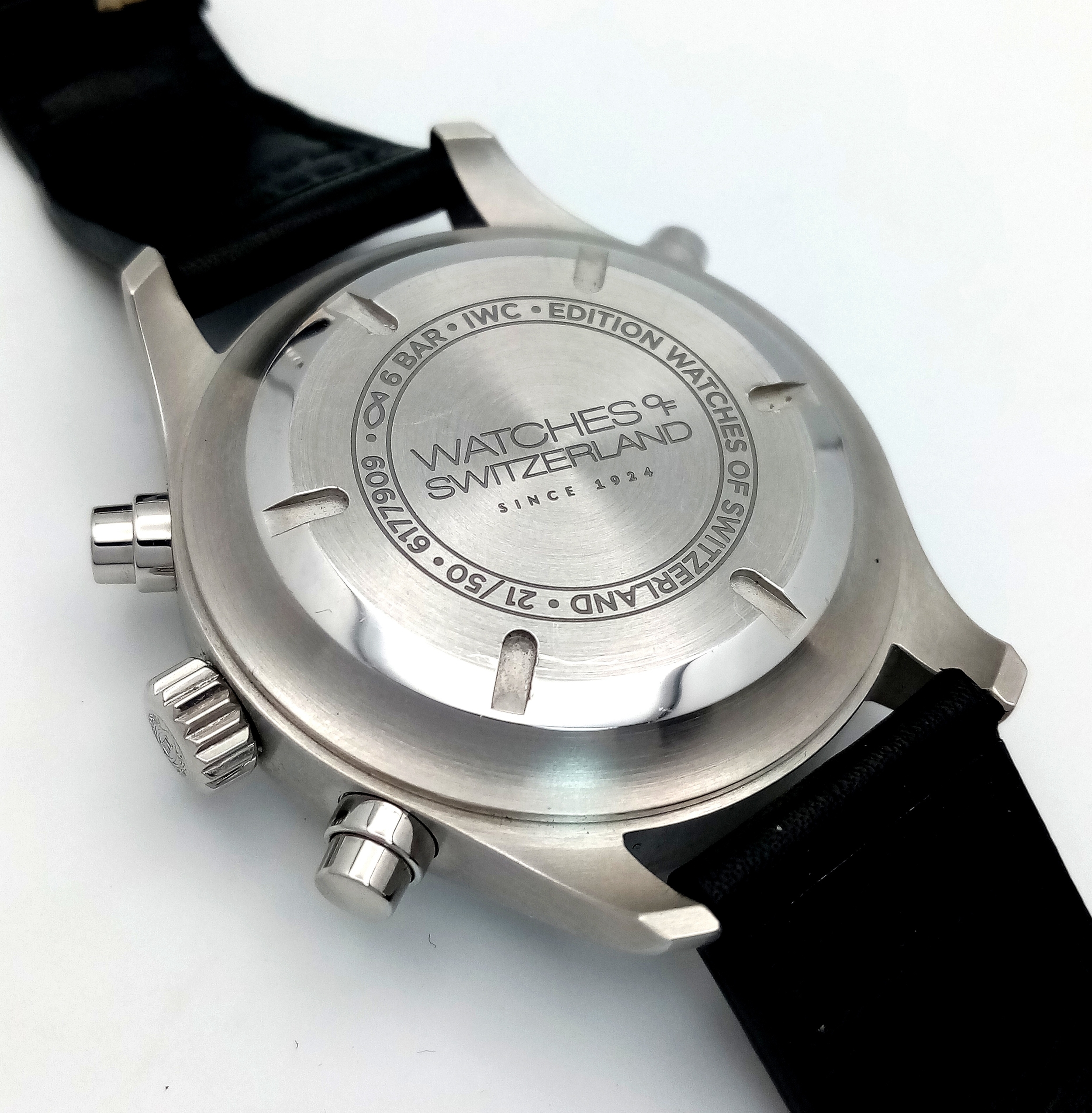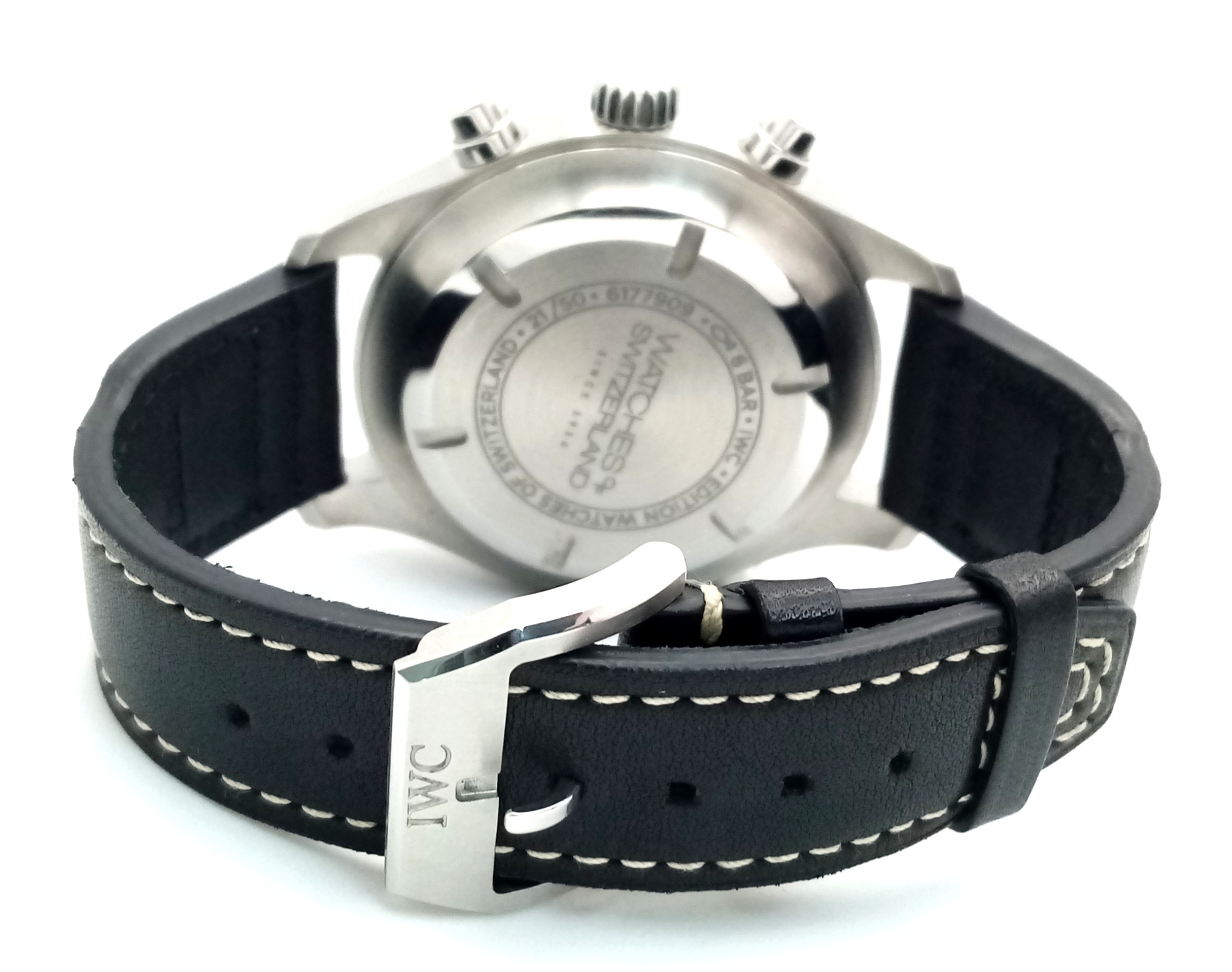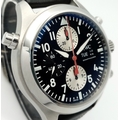 An IWC Pilot's Double Chronograph Automatic Gents Watch. Limited edition 21/50. Black leather strap. Stainless steel case - 43mm. Black dial with three sub dials. In good condition and working order. Comes with box and papers. Ref: 08492.