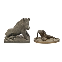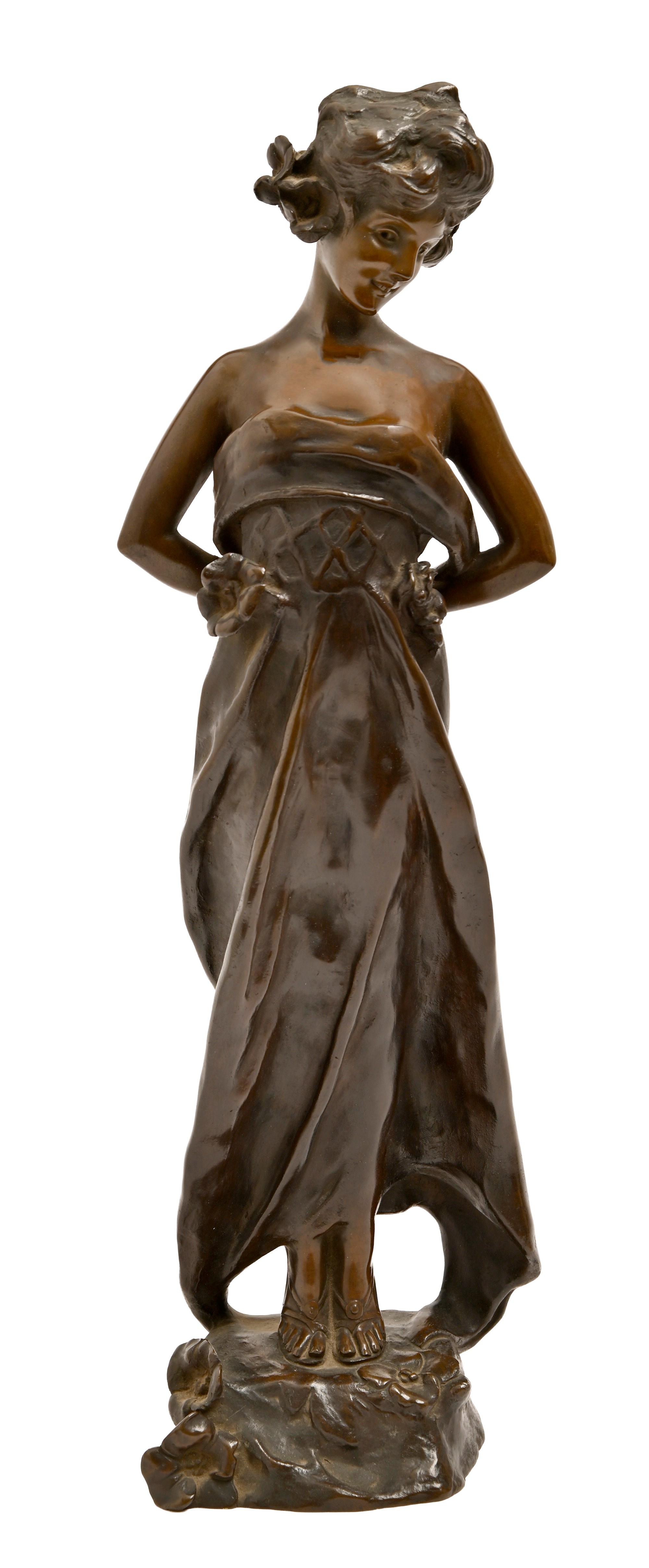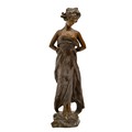 A French bronze statuette of a young woman on tiptoe, cast from a model of Georges van der Straeten, c1900, uneven rich brown patina, 40.5cm h , Societe des Bronzes de Paris stamped seal and AP 1 8 0 2