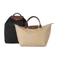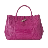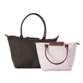 Longchamp, two Le Pliage handbags, to include a large brown nylon tote with crocodile embossed leather handles and trim, together with a small pink nylon Shopping tote, with tall tan leather handles and trim, lengths measure 26 and 32cm
