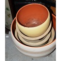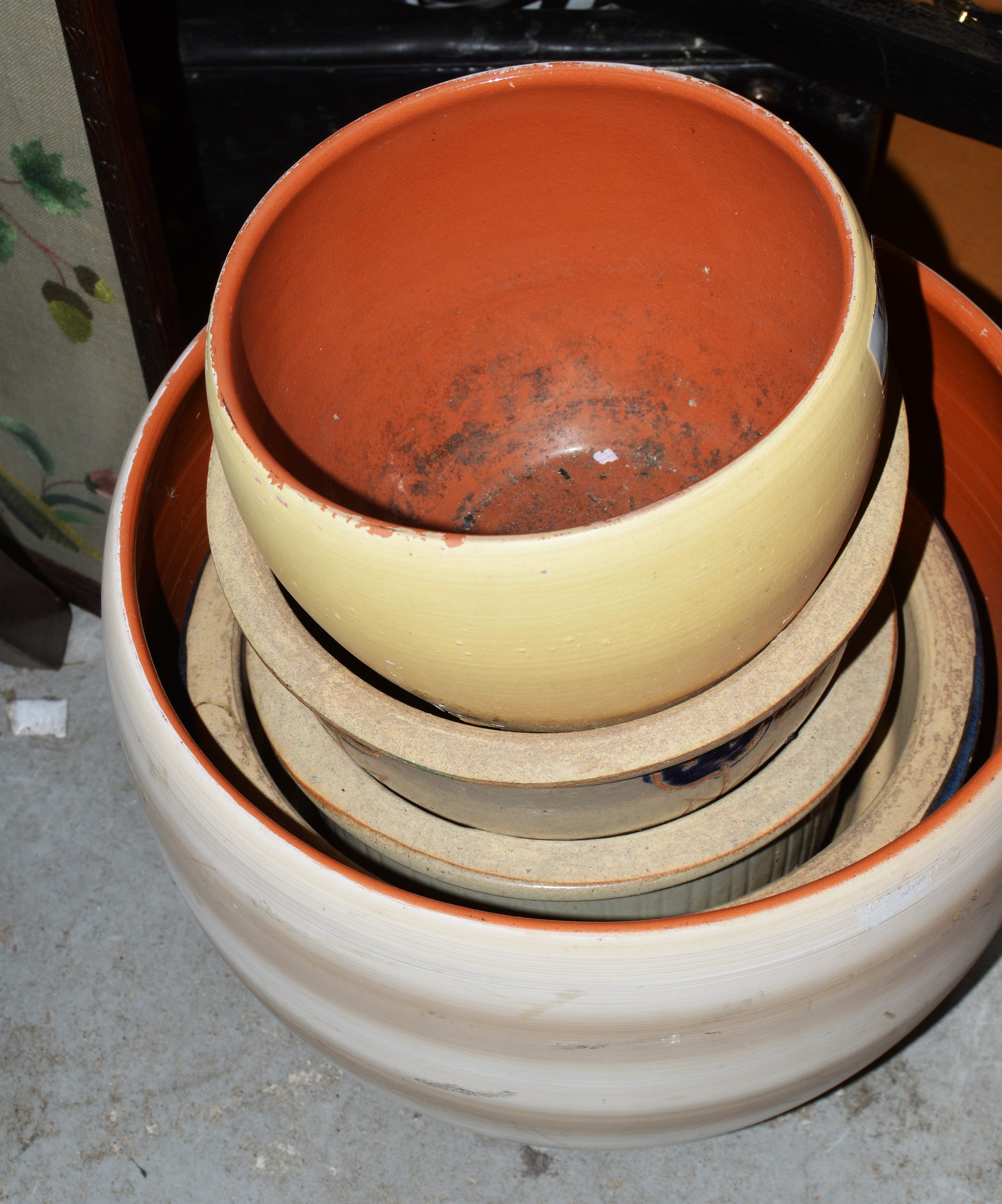 Four Vintage Plant Pots for Interior Use, Plus an Ornate Metal Three-Tier Stand