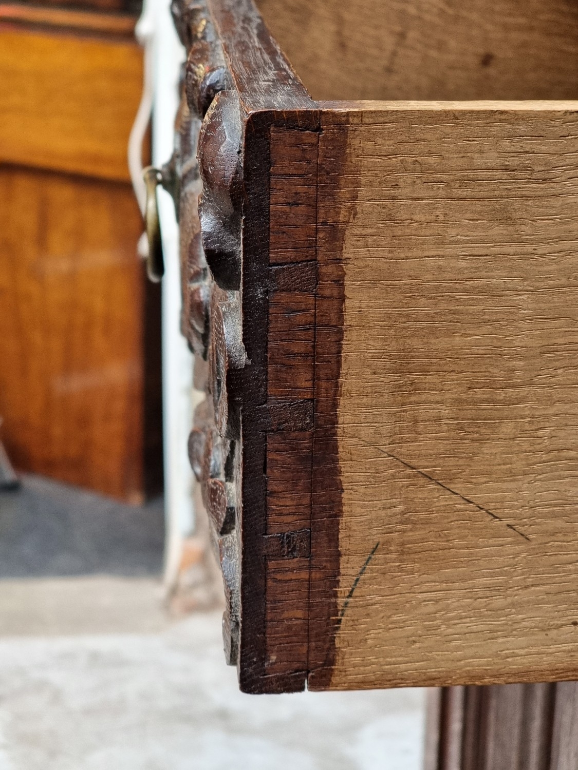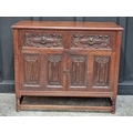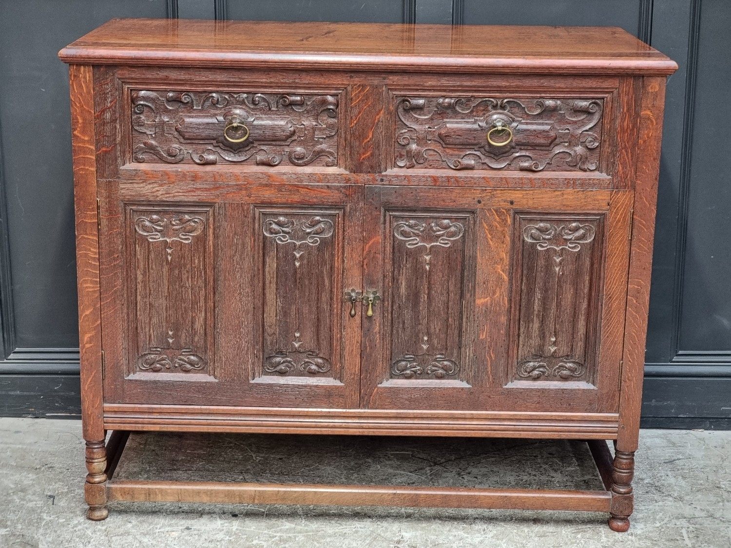 A 17th century style carved oak panelled side cabinet, with linenfold decoration, 127.5cm wide.