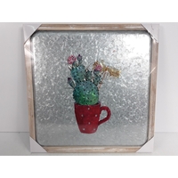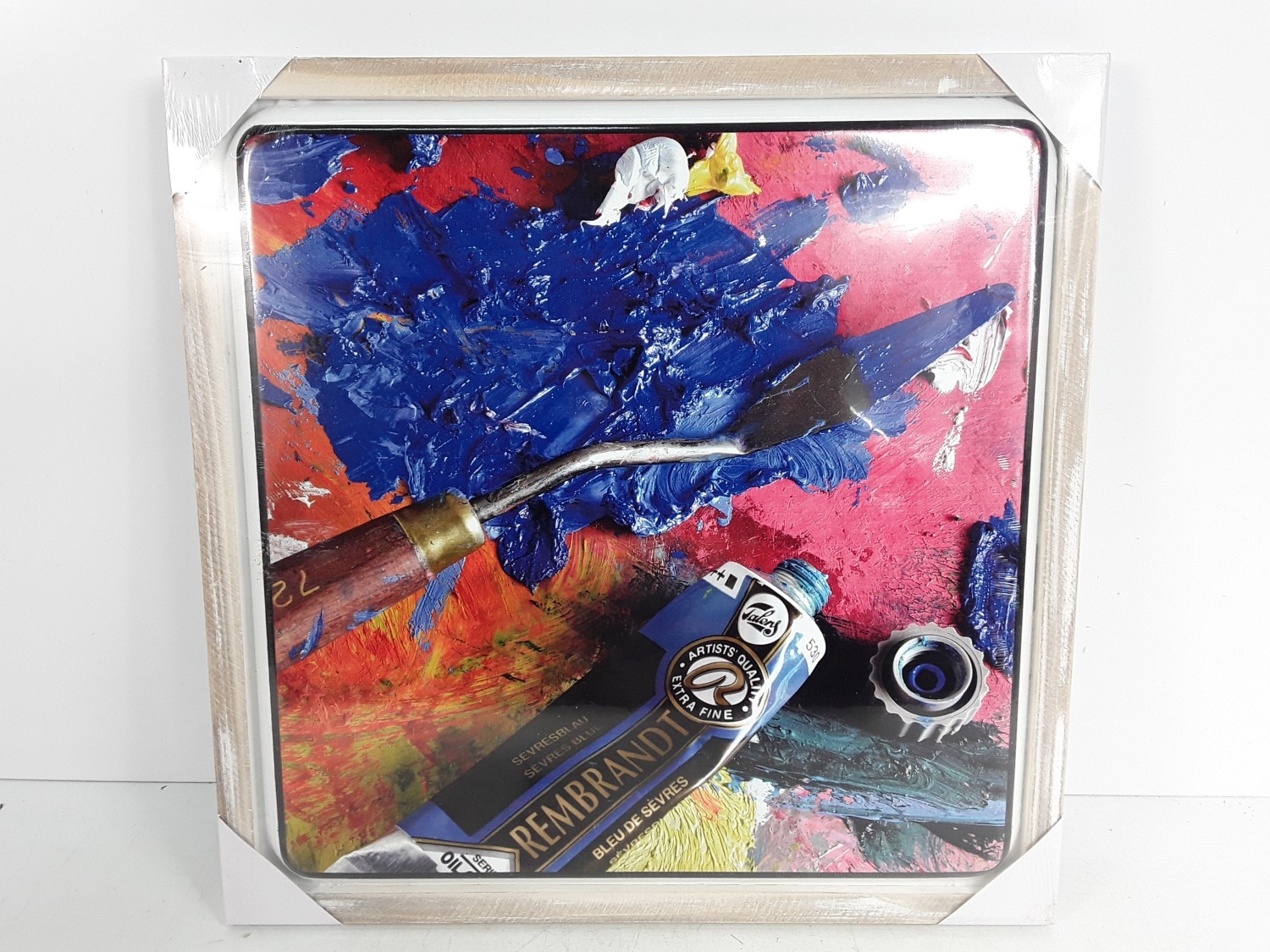 Two boxes (24 pictures) of wooden framed metal pictures of an art pallet, 48 x 48cms
