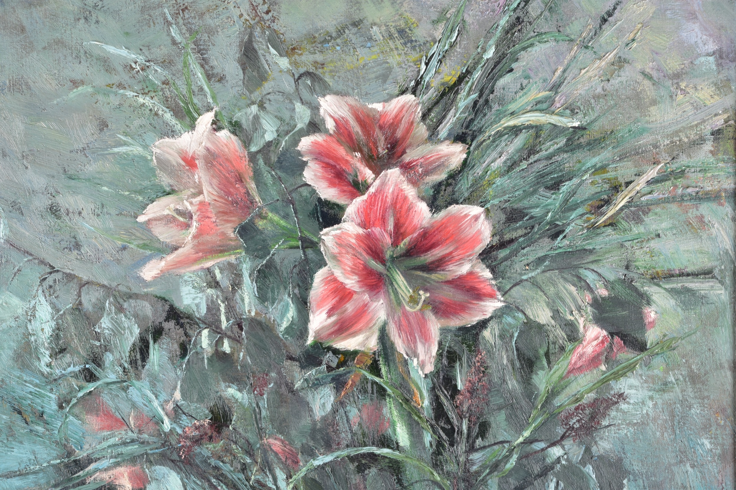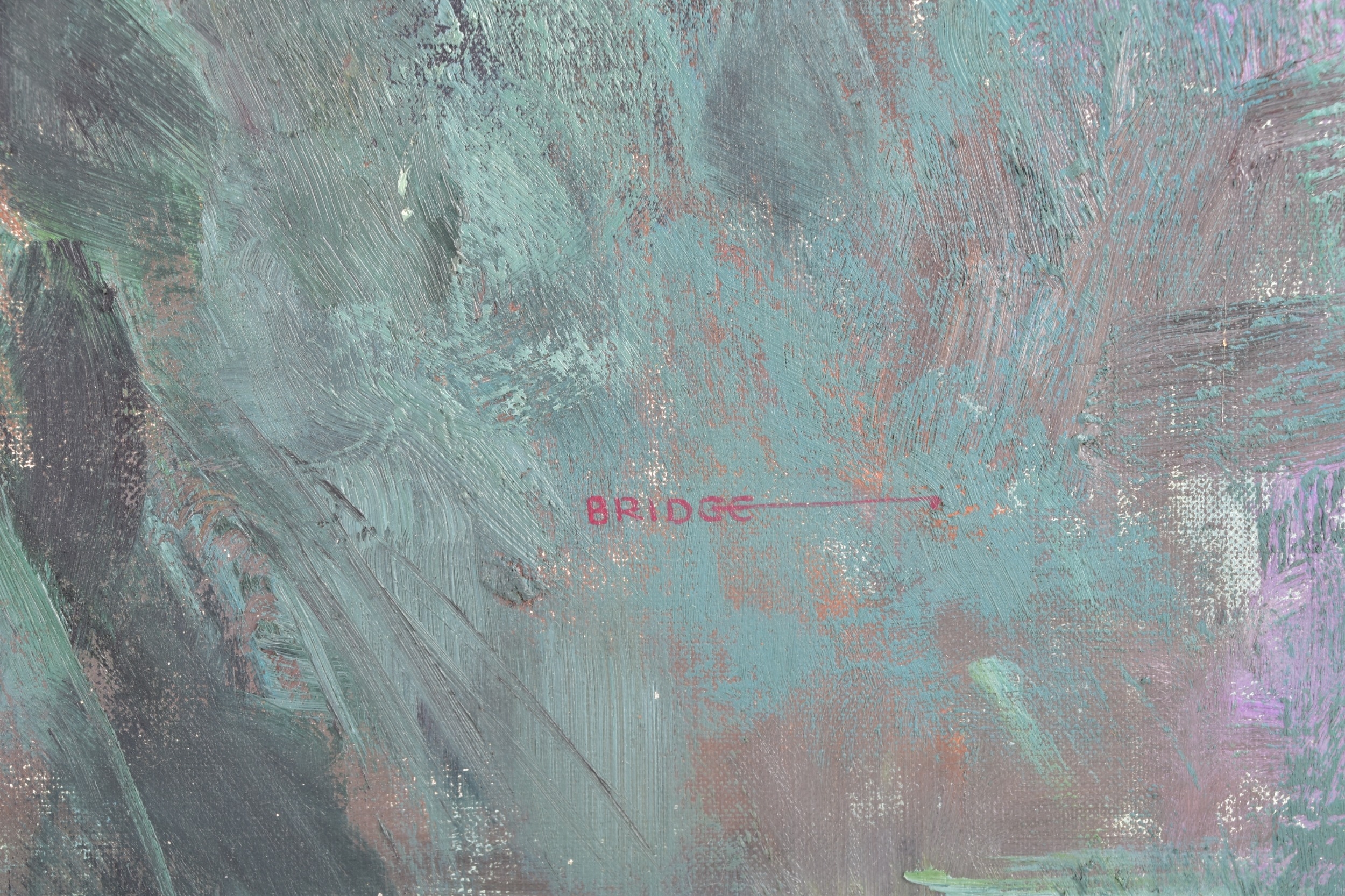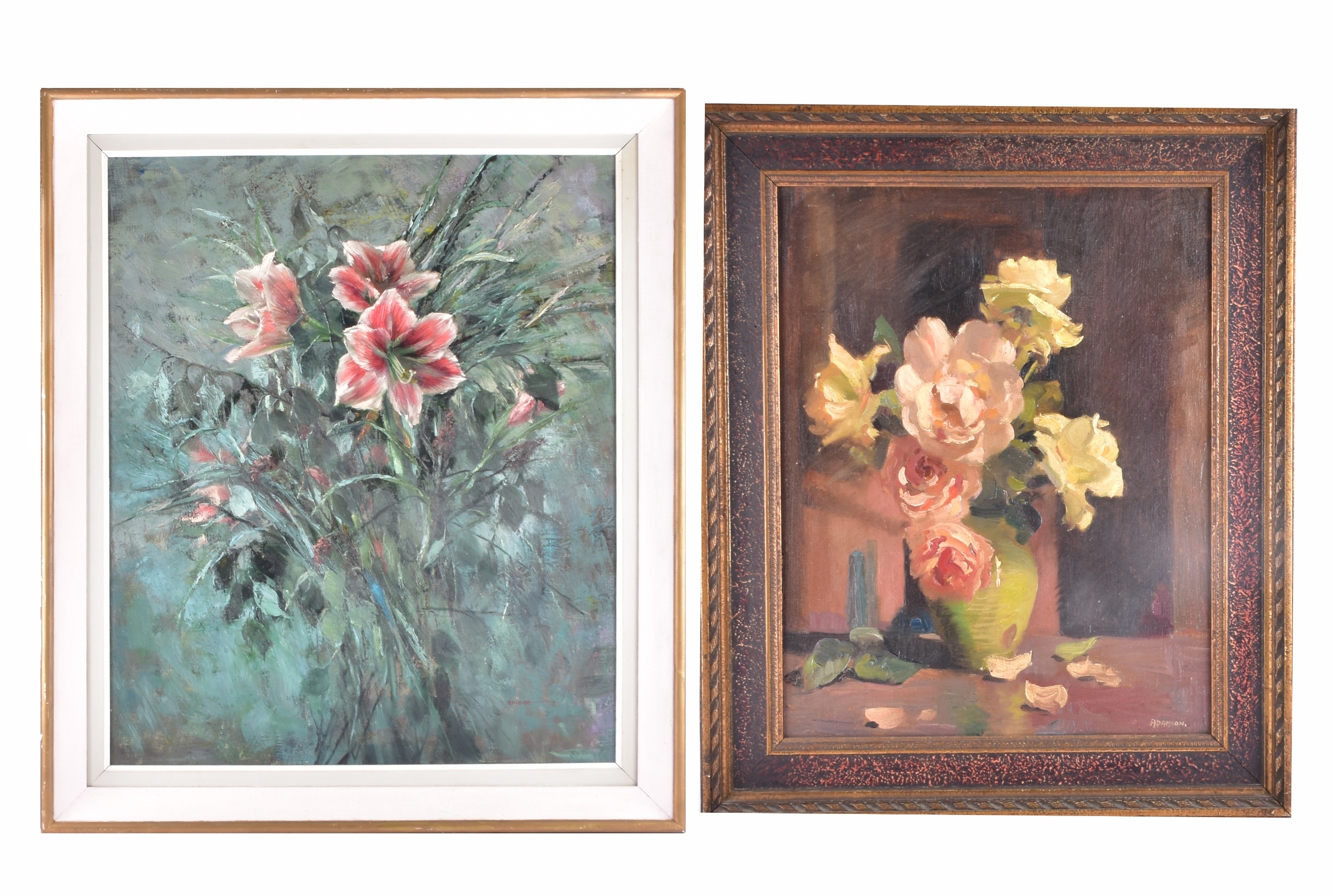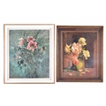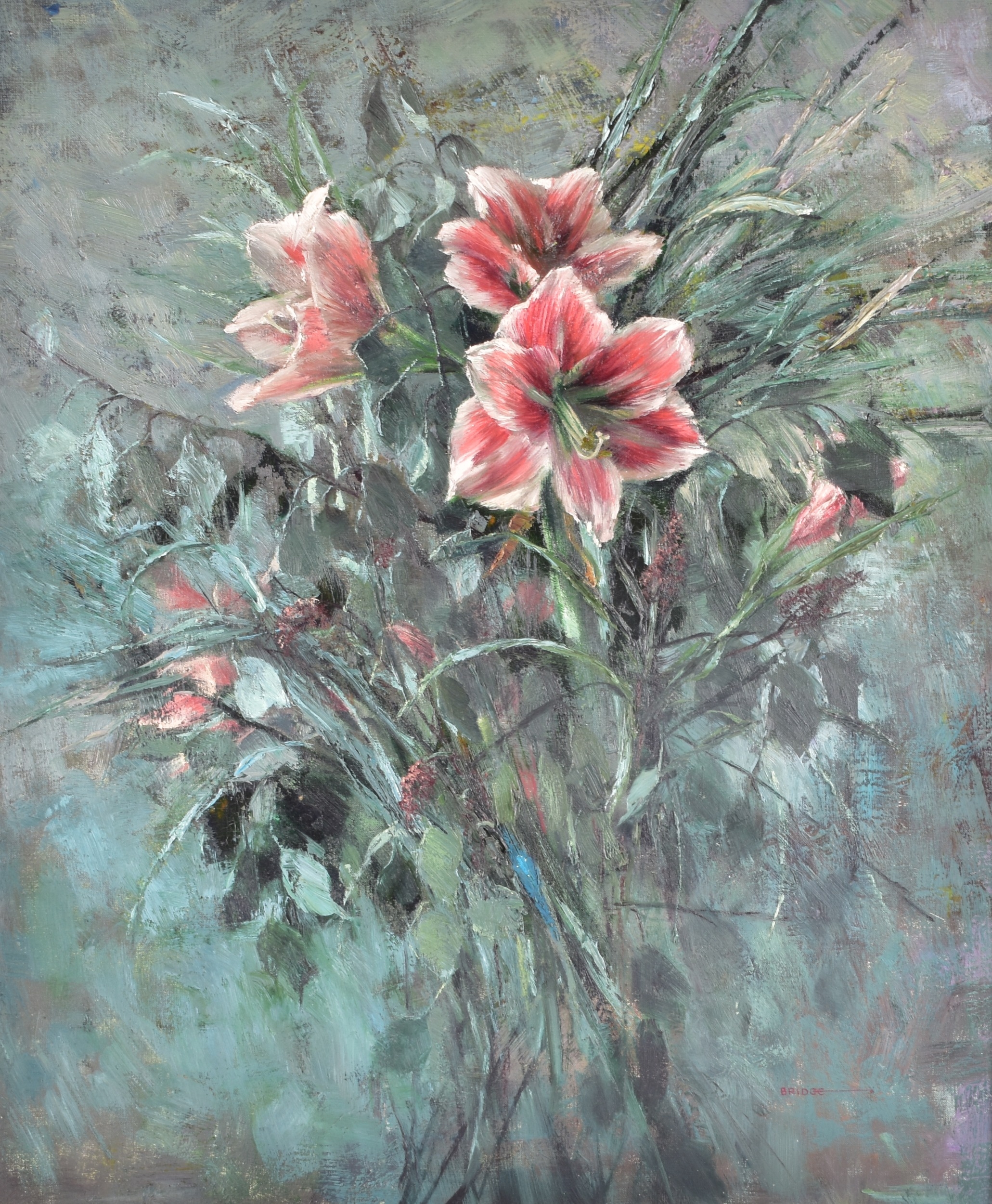 A still life of roses in a vase, oil on canvas, signed lower right, Academy inscription verso, 52 x 41 cm; together with a larger still life of flowers signed Bridge, oil on canvas, 75 x 63 cm. (2)