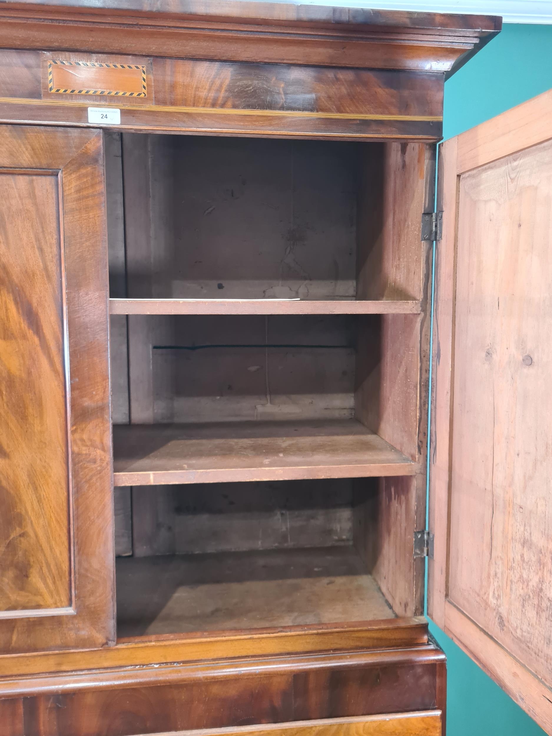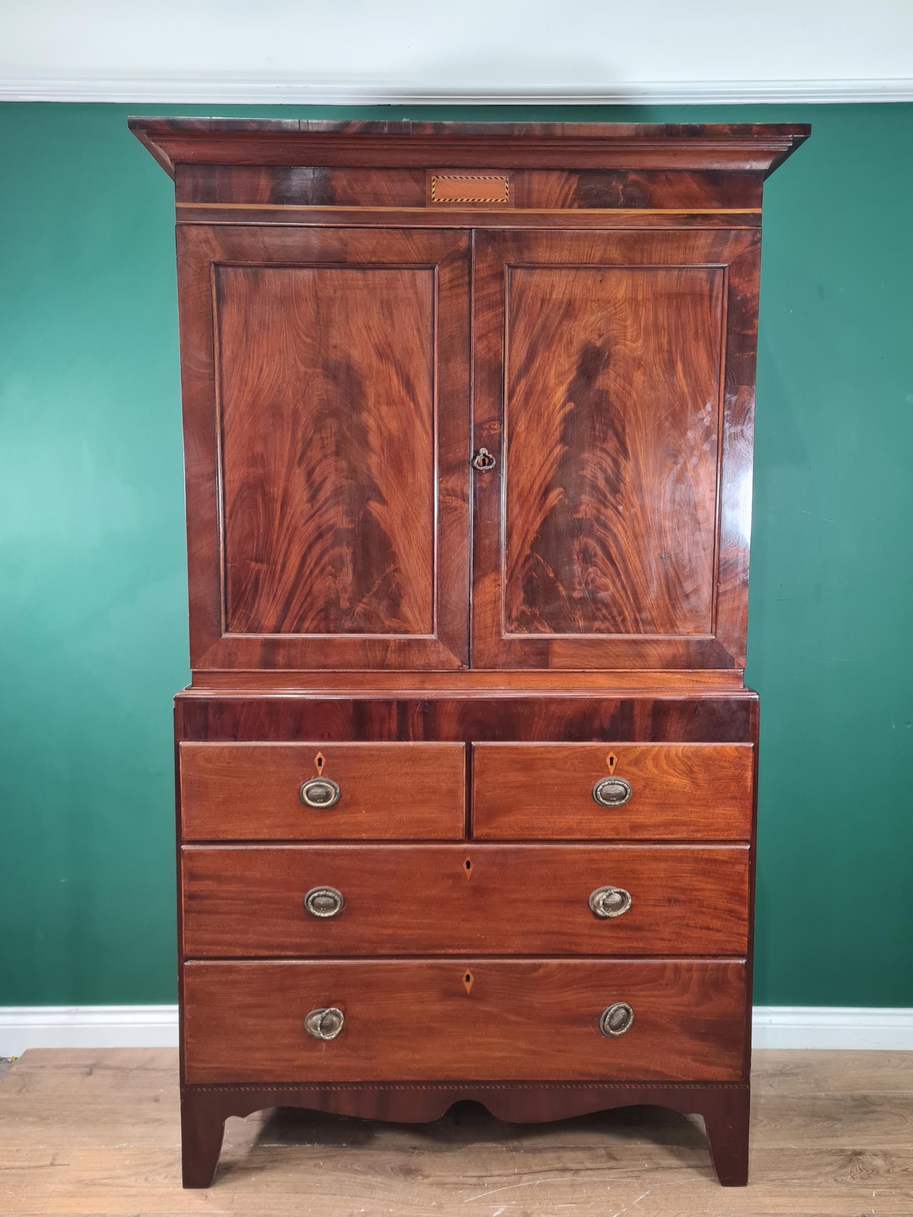 A Mahogany Linen Press the top fitted pair of cupboard doors enclosing two fitted shelves above two long drawers and two short, 6ft 8" H 3ft 11" W 1ft 10" D (R1)