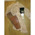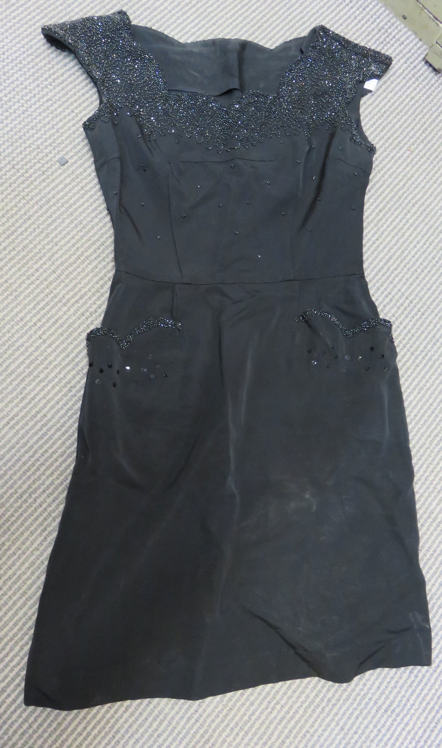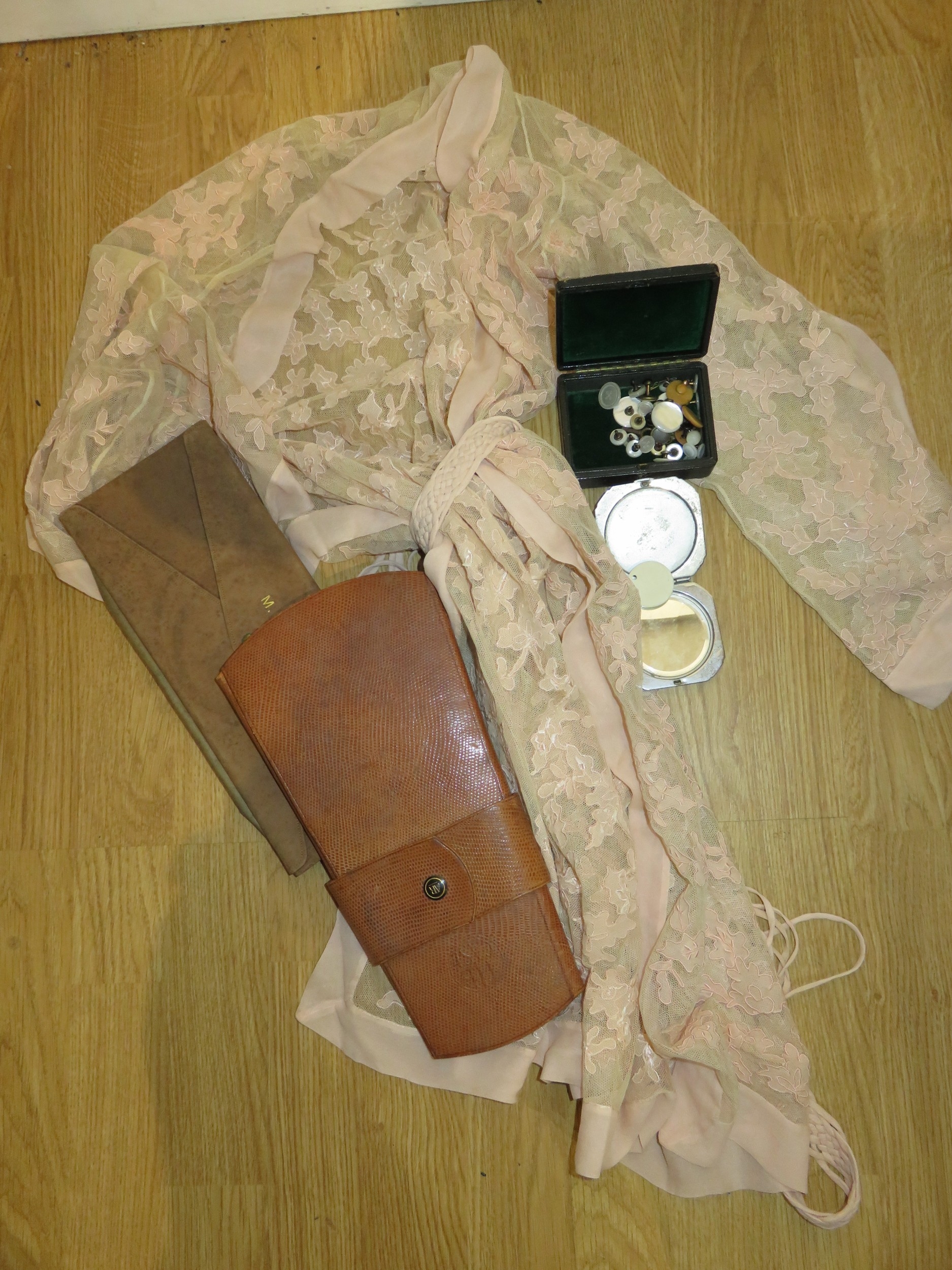 Ladies 1950s black dress, together with a vintage negligee, two leather tie cases, box of various mother of pearl buttons / studs and a chrome cased ladies compact