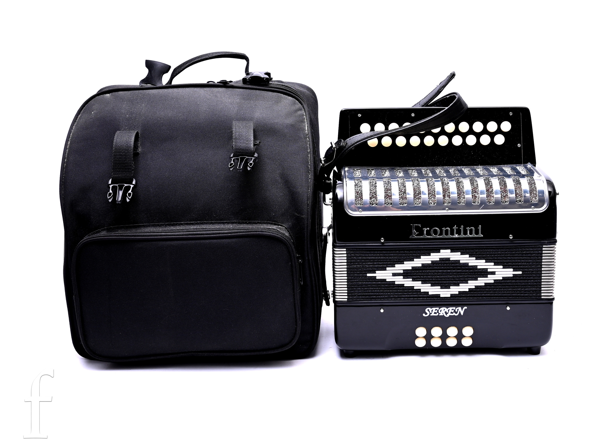 A Frontini Seren black Melodeon with two row button keyboard, in black canvas carrying case, width 28cm.