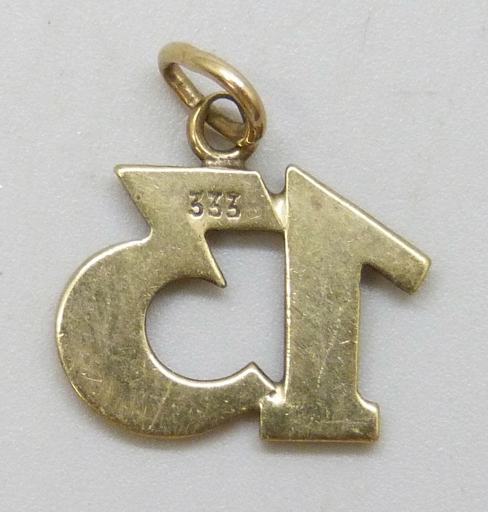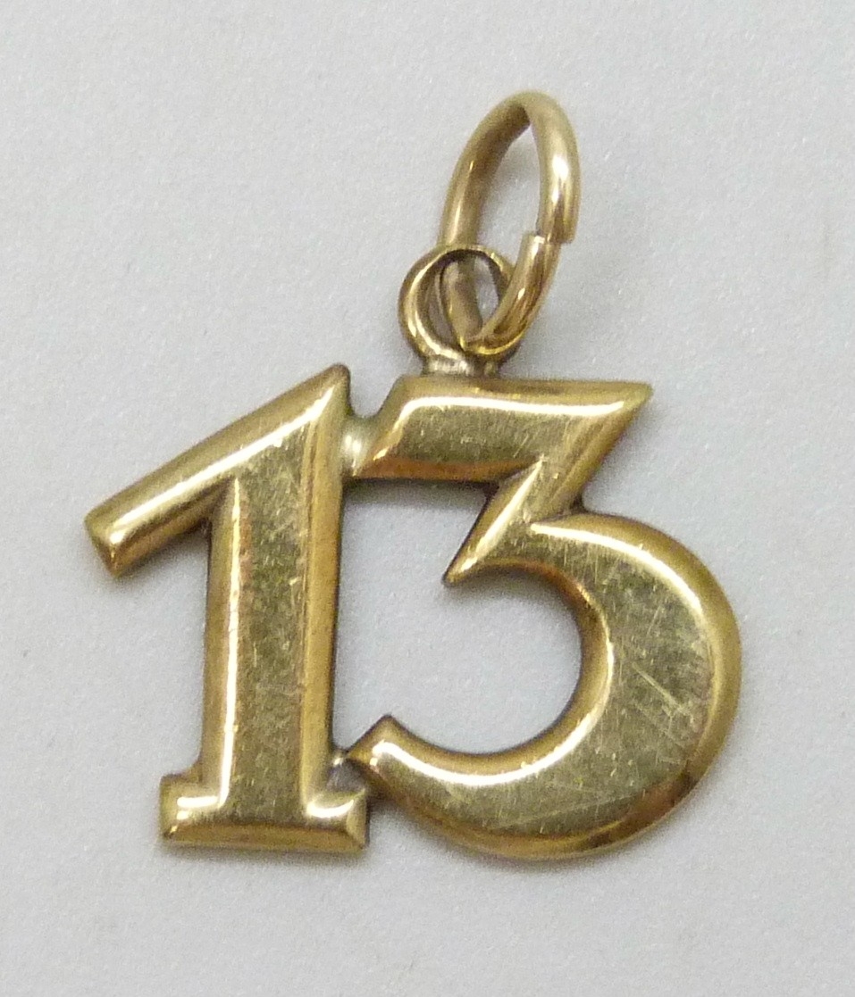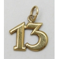 A yellow metal '13' charm, marked 333, 1.7g, 1.9cm including bail
