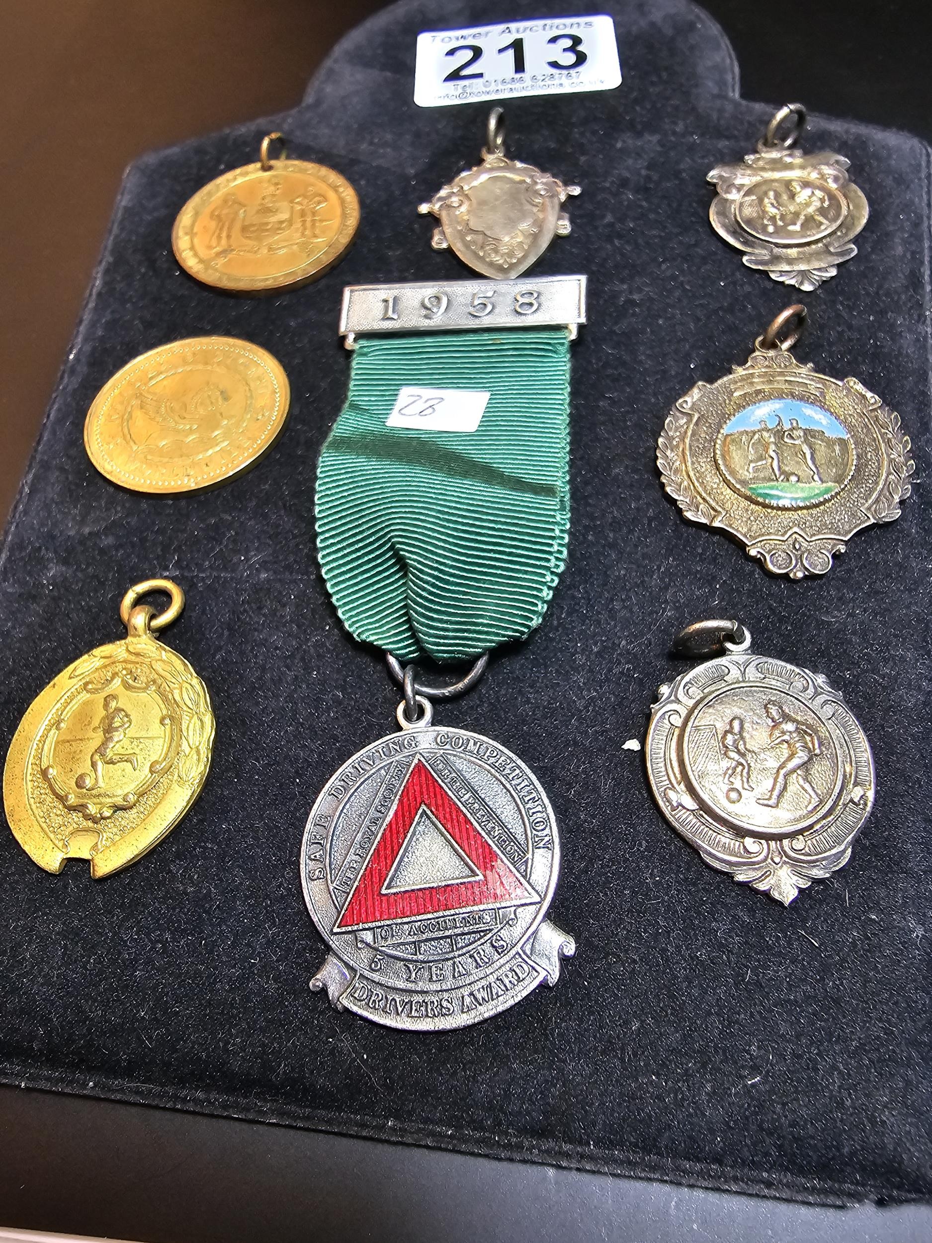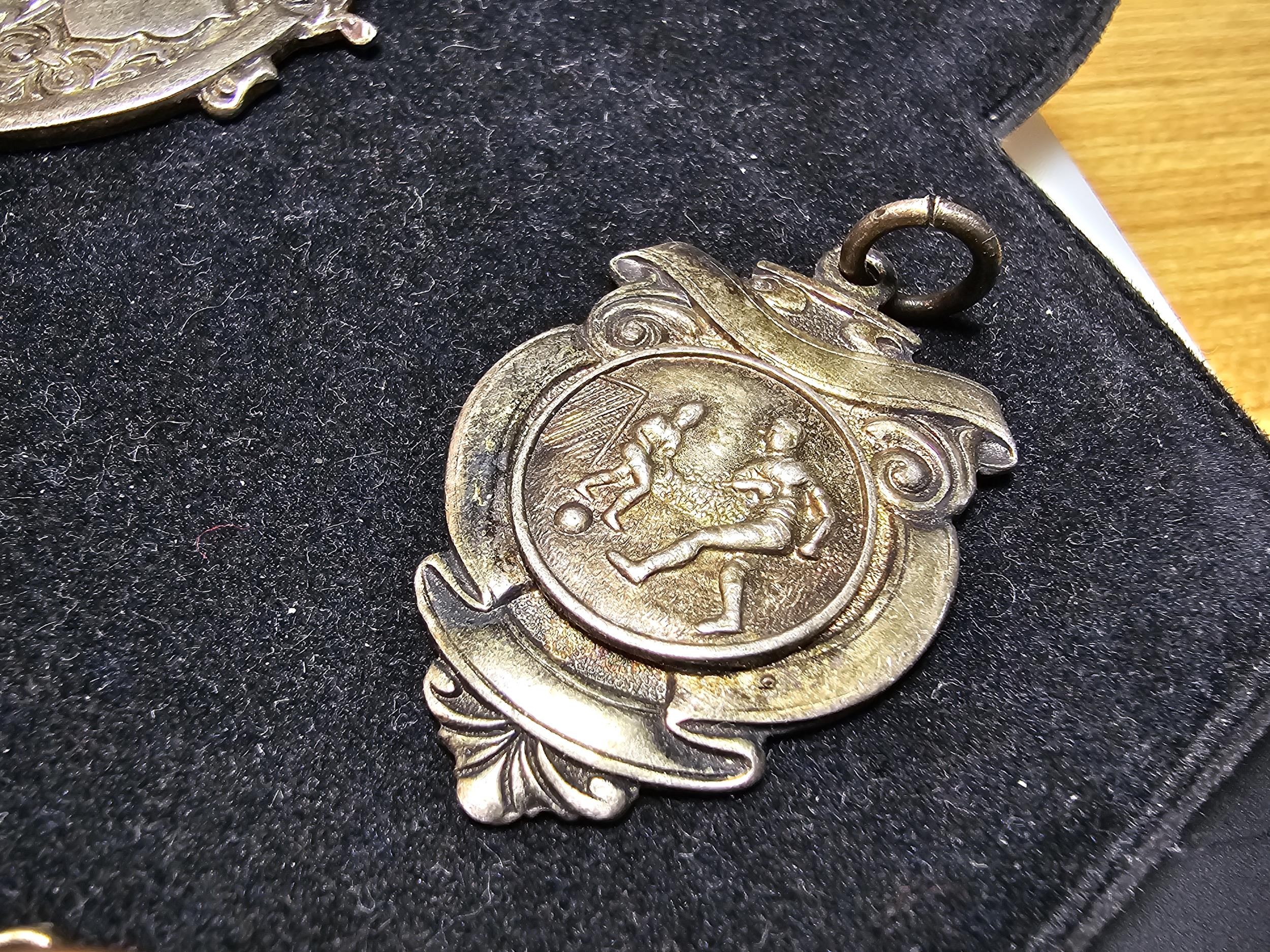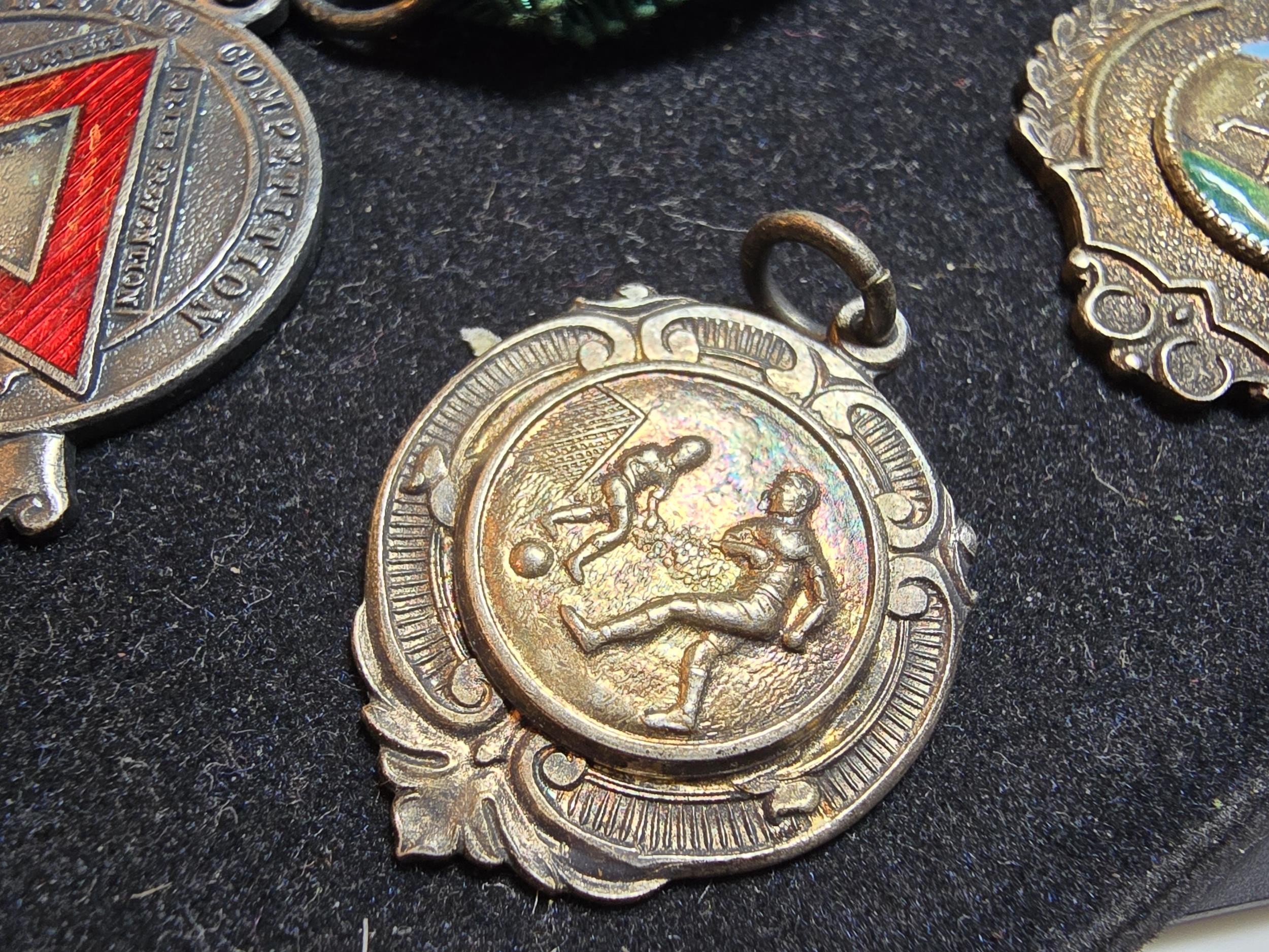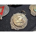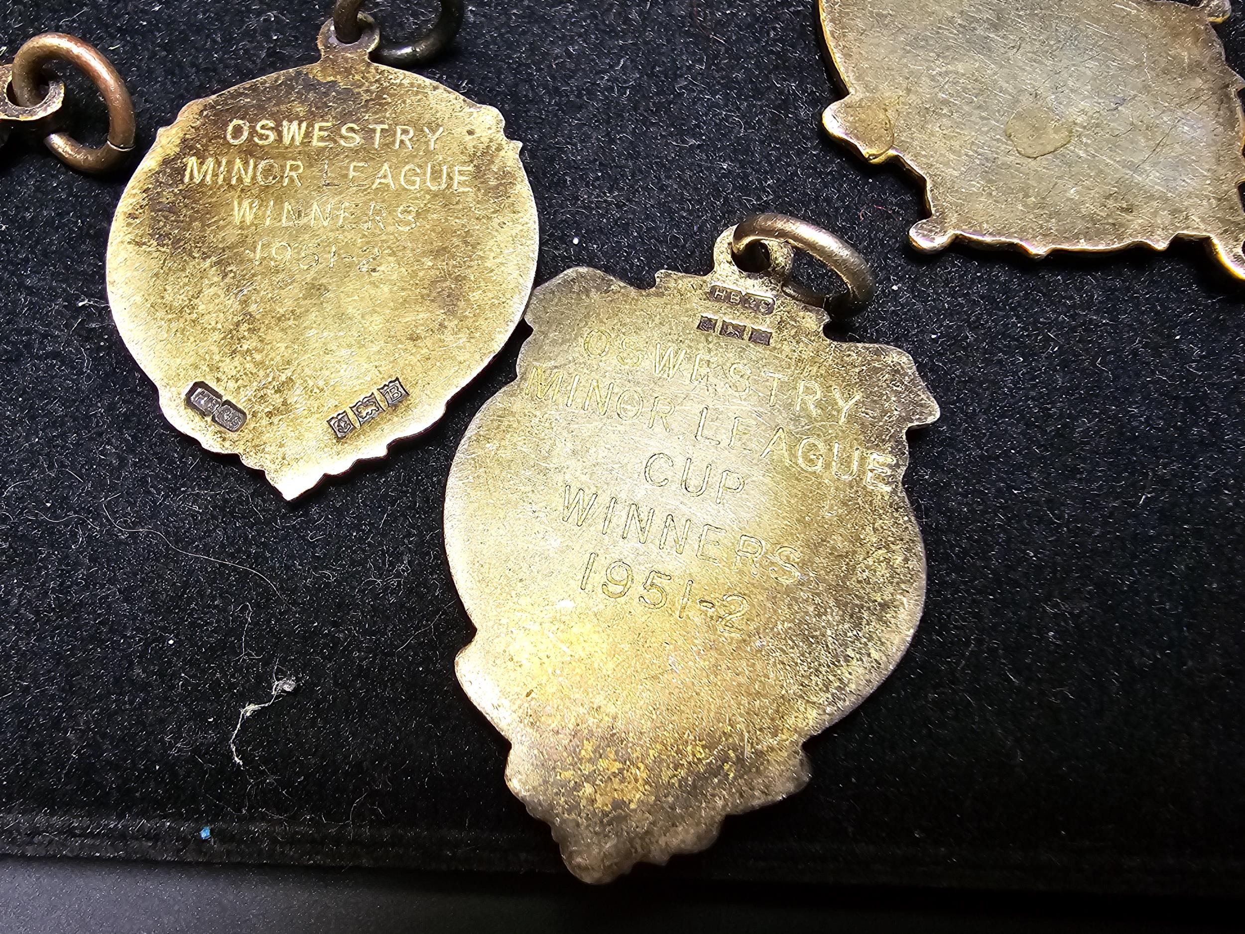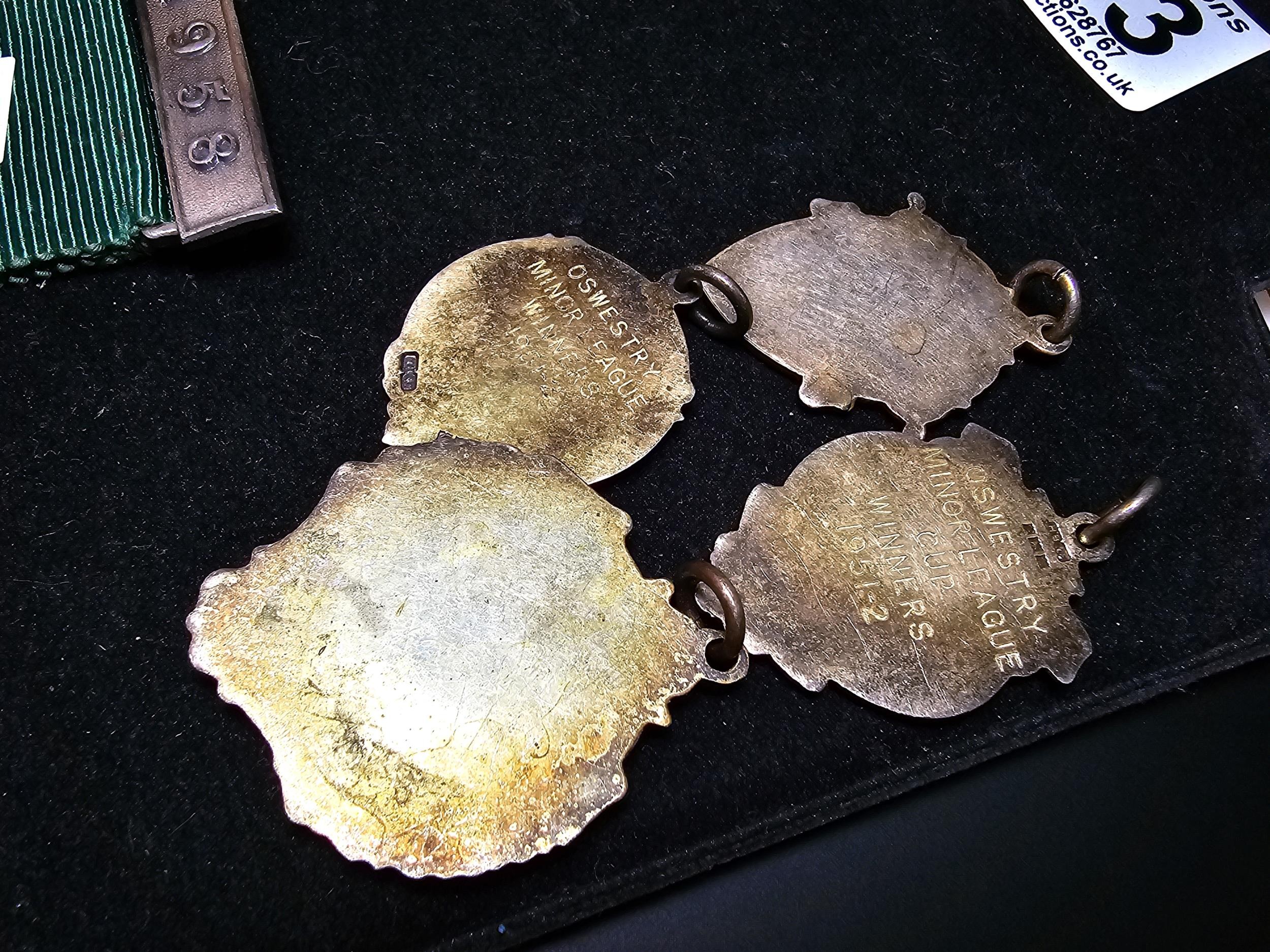 A collection of 8x various medals to include 4 Sterling Silver medals, 3 of which are football related and marked for Oswestry. Also includes a blank shield medal. Display board is not included.