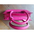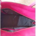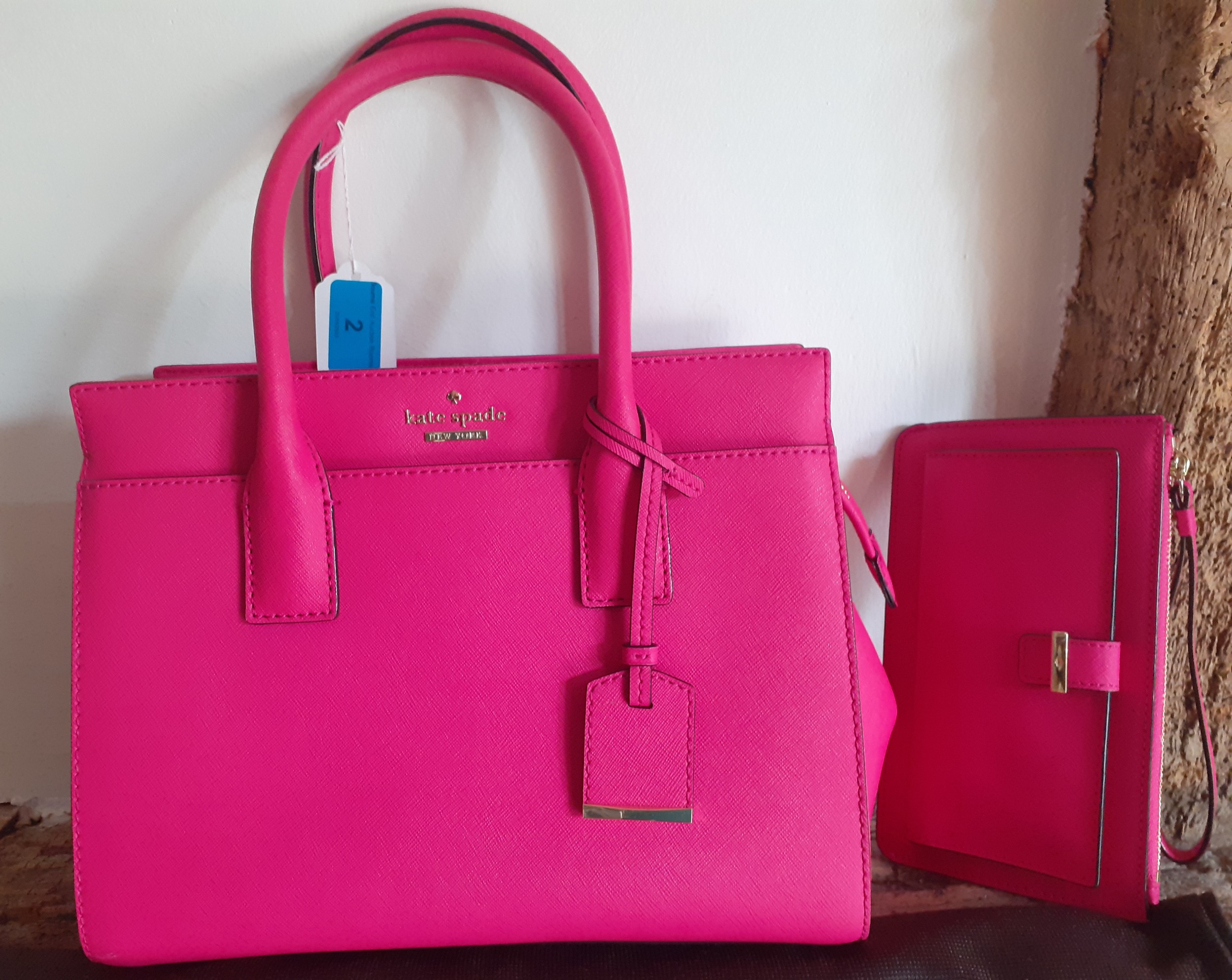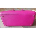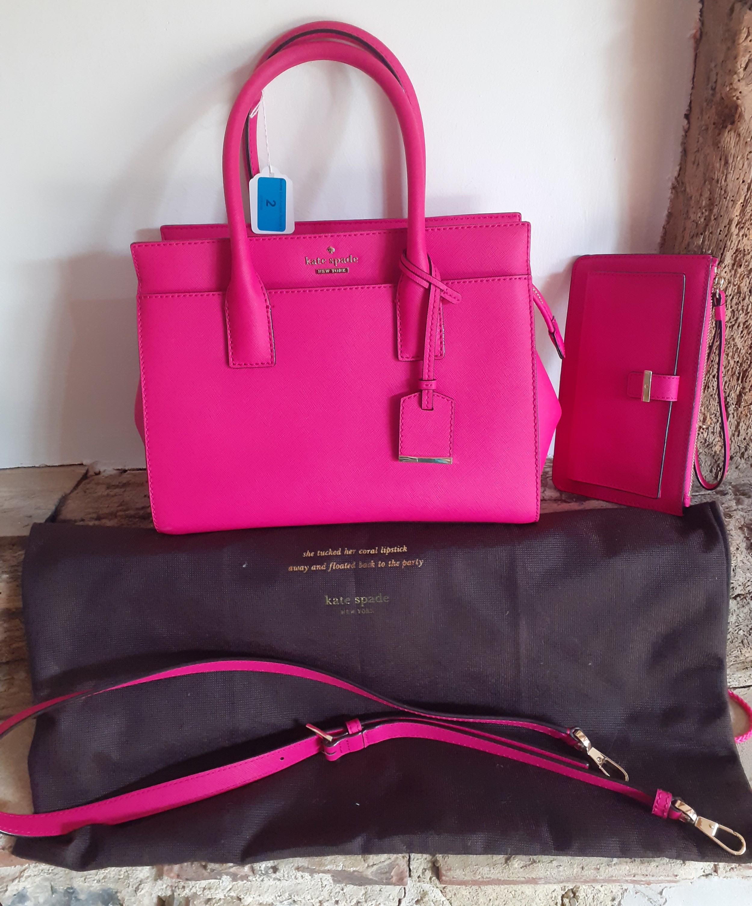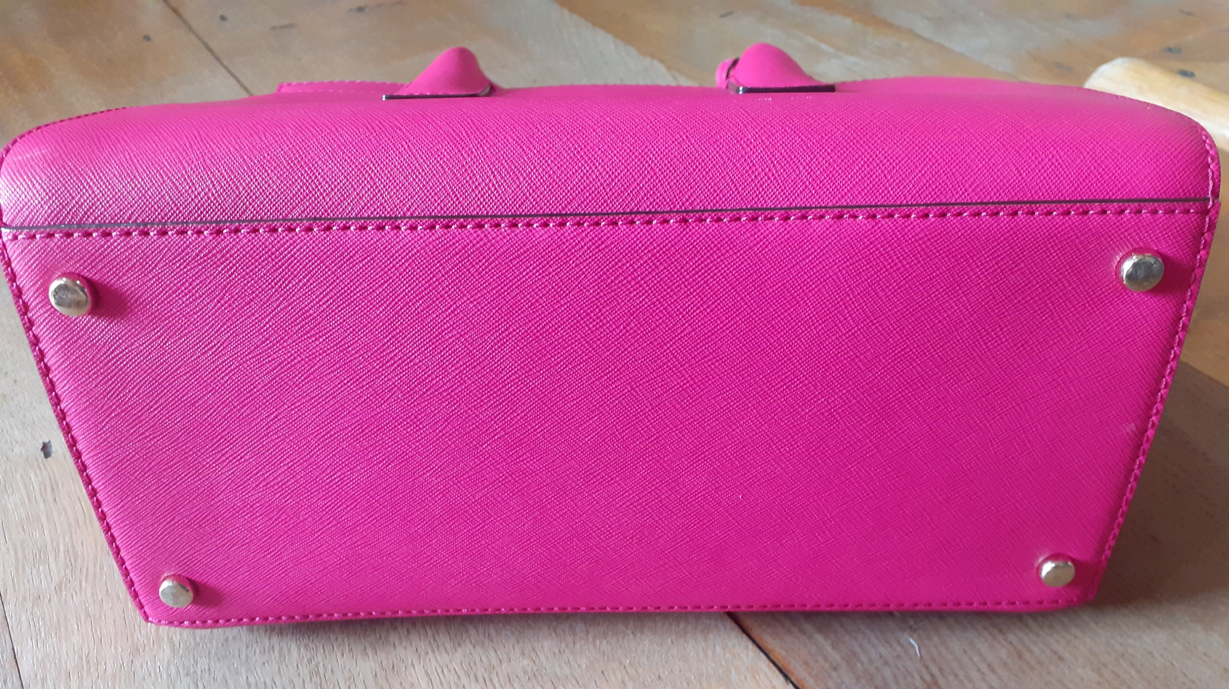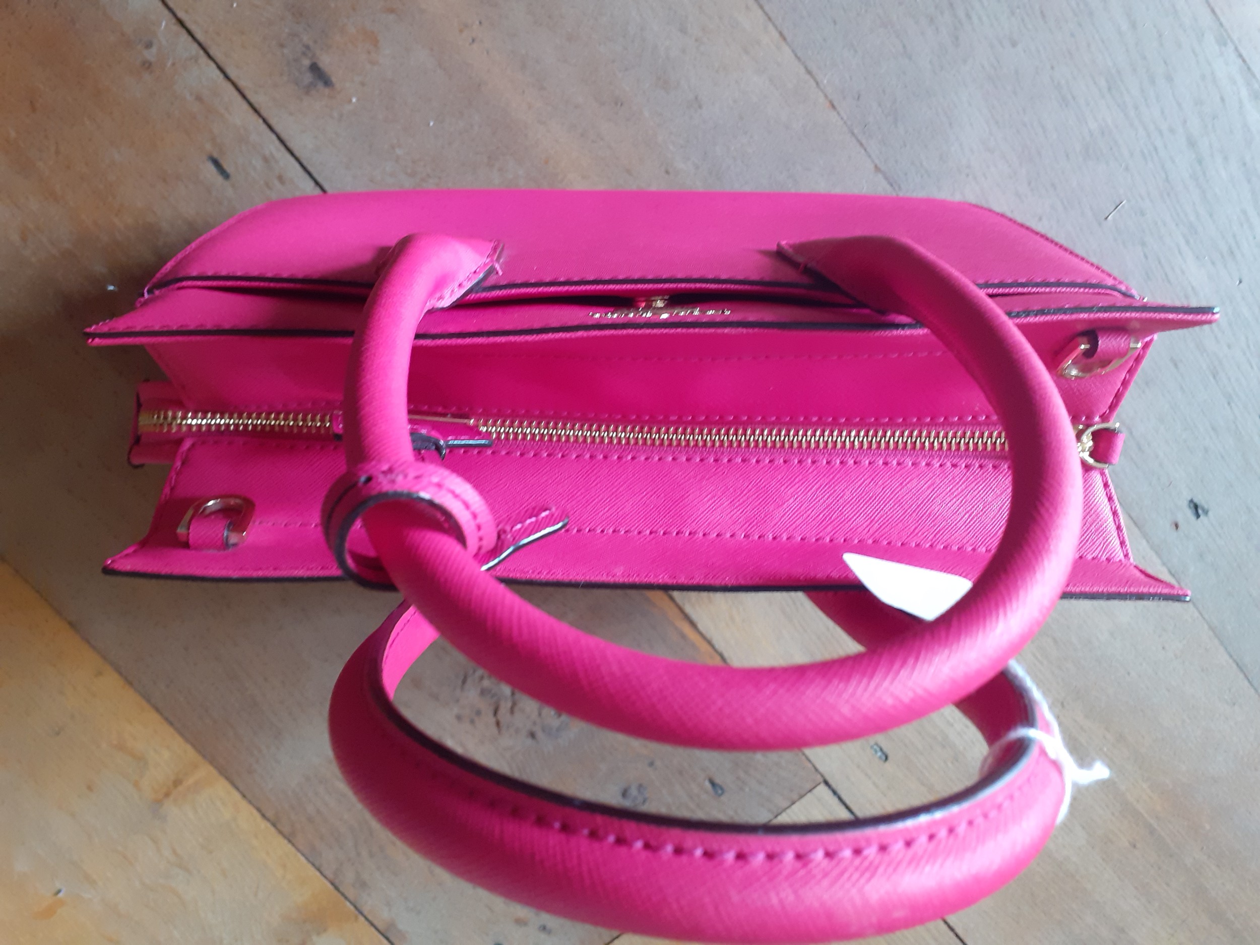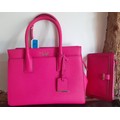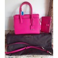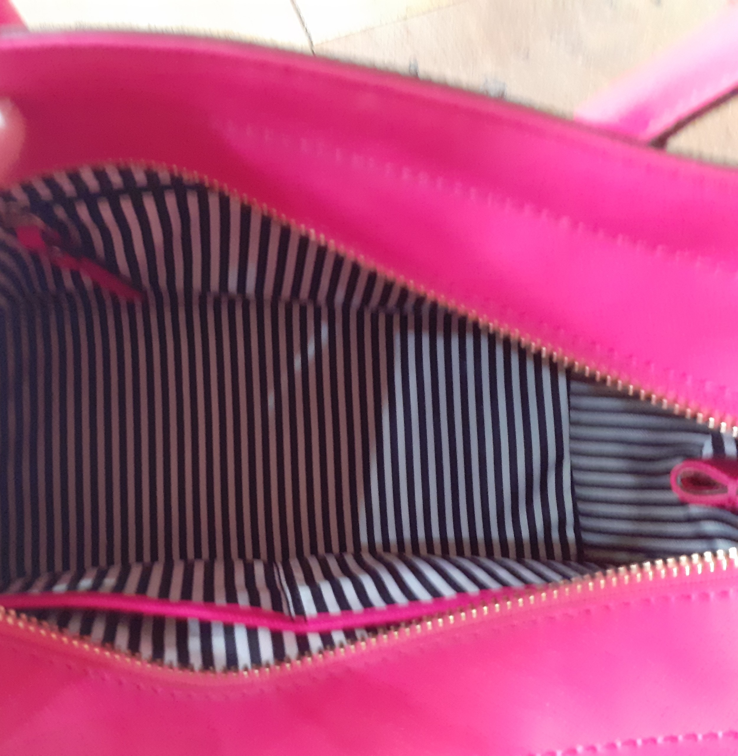 Kate Spade- A hot pink leather satchel style handbag 28cm Wide x 22cm High (not including handles) x 14cm Deep (bottom) x 6cm Deep (top) having detachable shoulder straps, gold tone hardware, black and white striped fabric interior with one zipped compartment and 2 pockets and matching purse together with a branded dust-bag. Location:R2.1