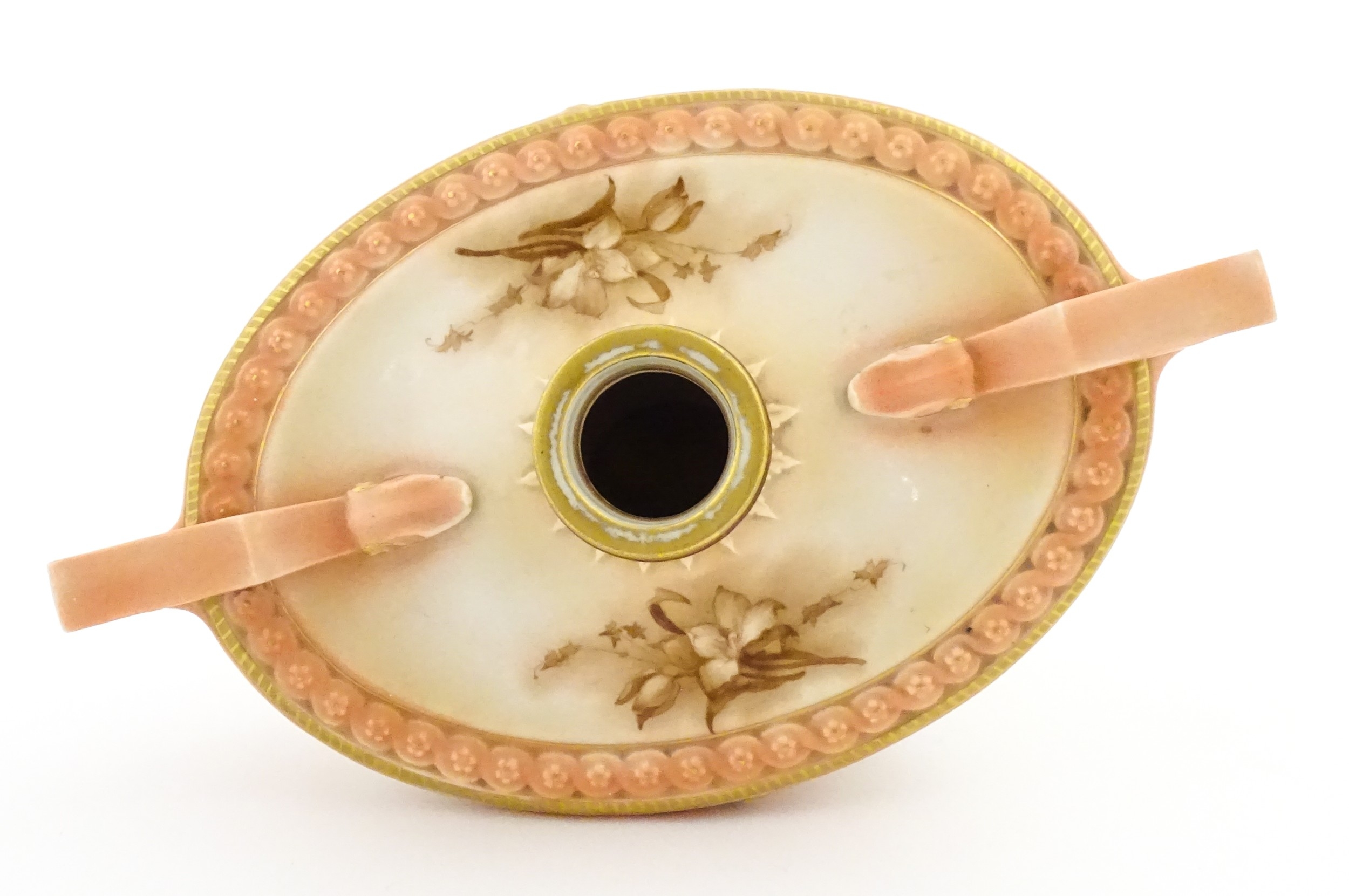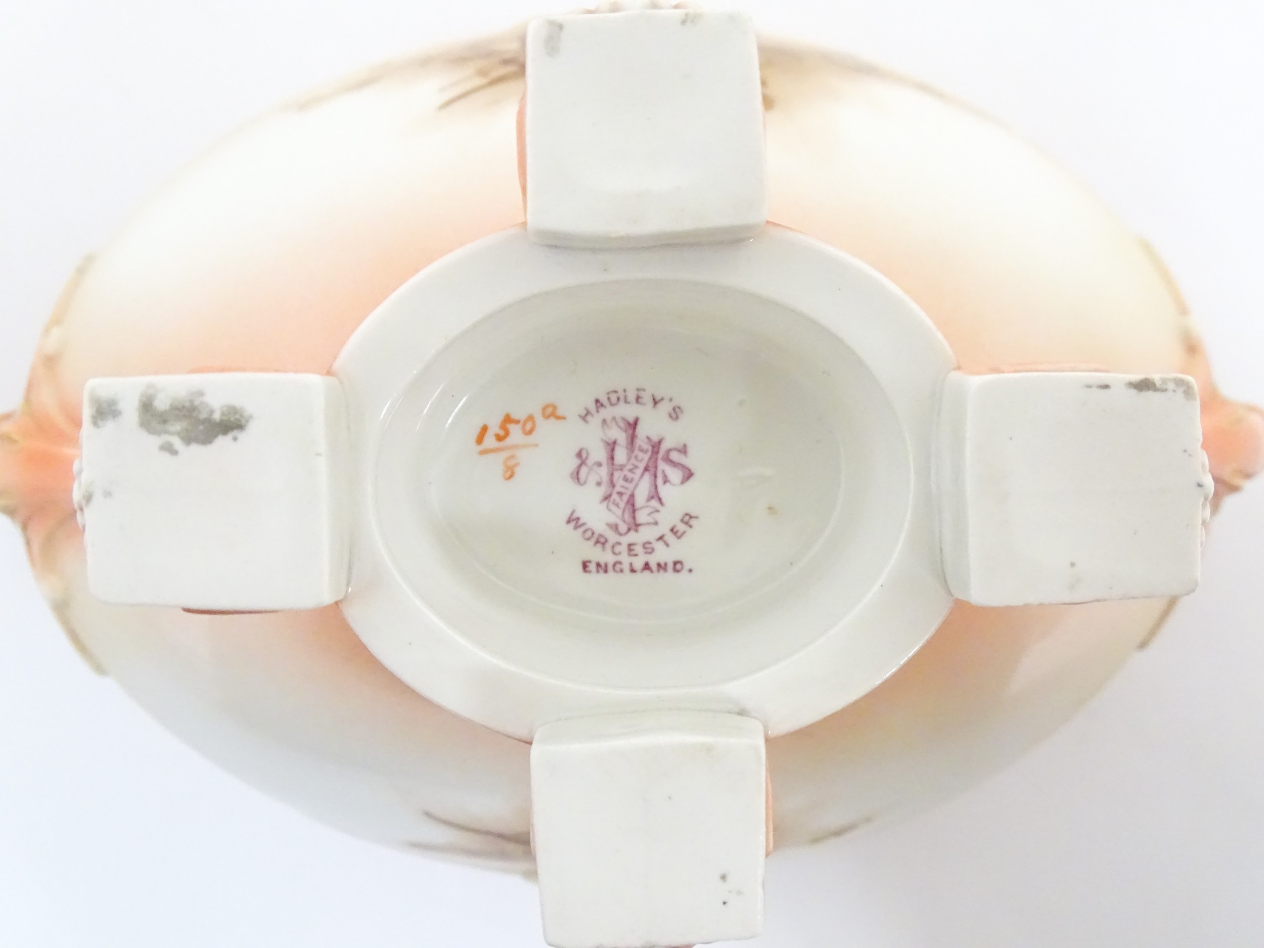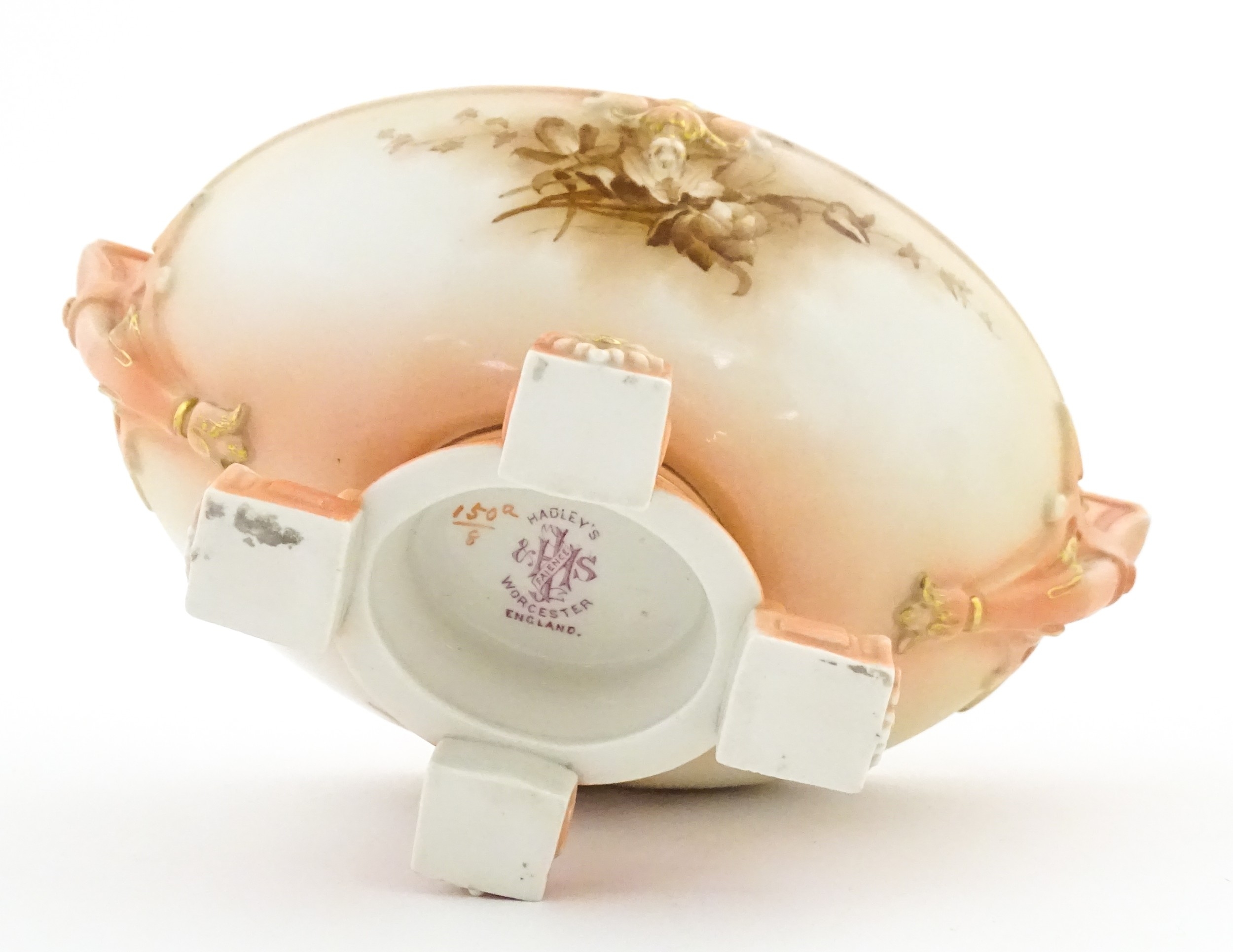 A Hadley's Worcester twin handled squat vase of boat form with floral and foliate decoration. Marked under 150a / 8. Approx. 4" high