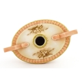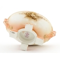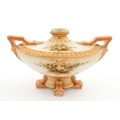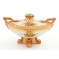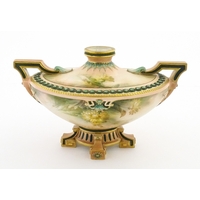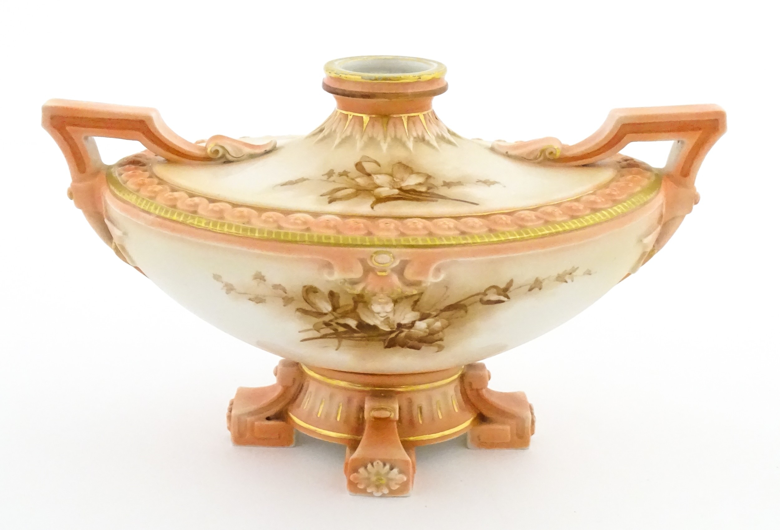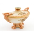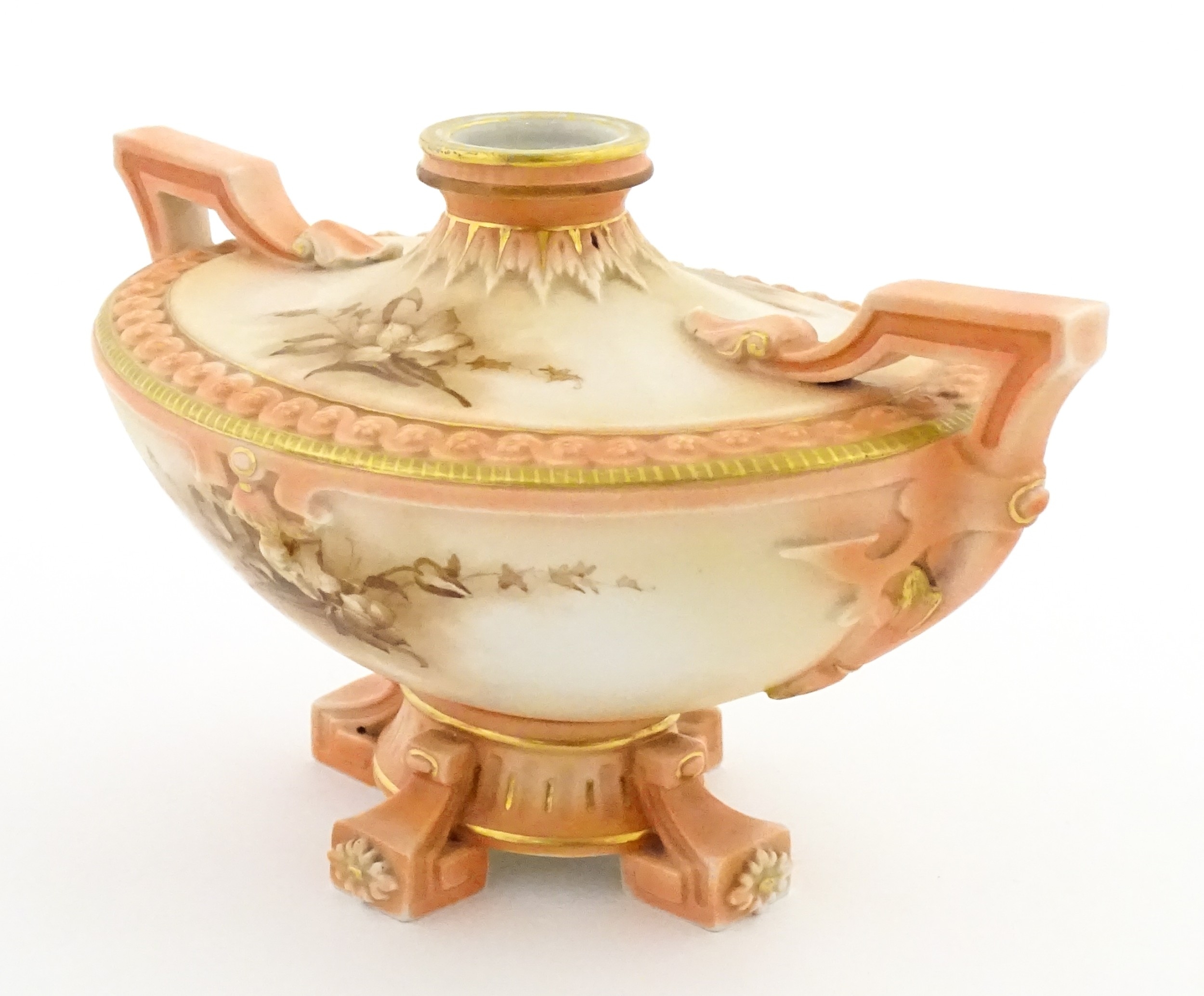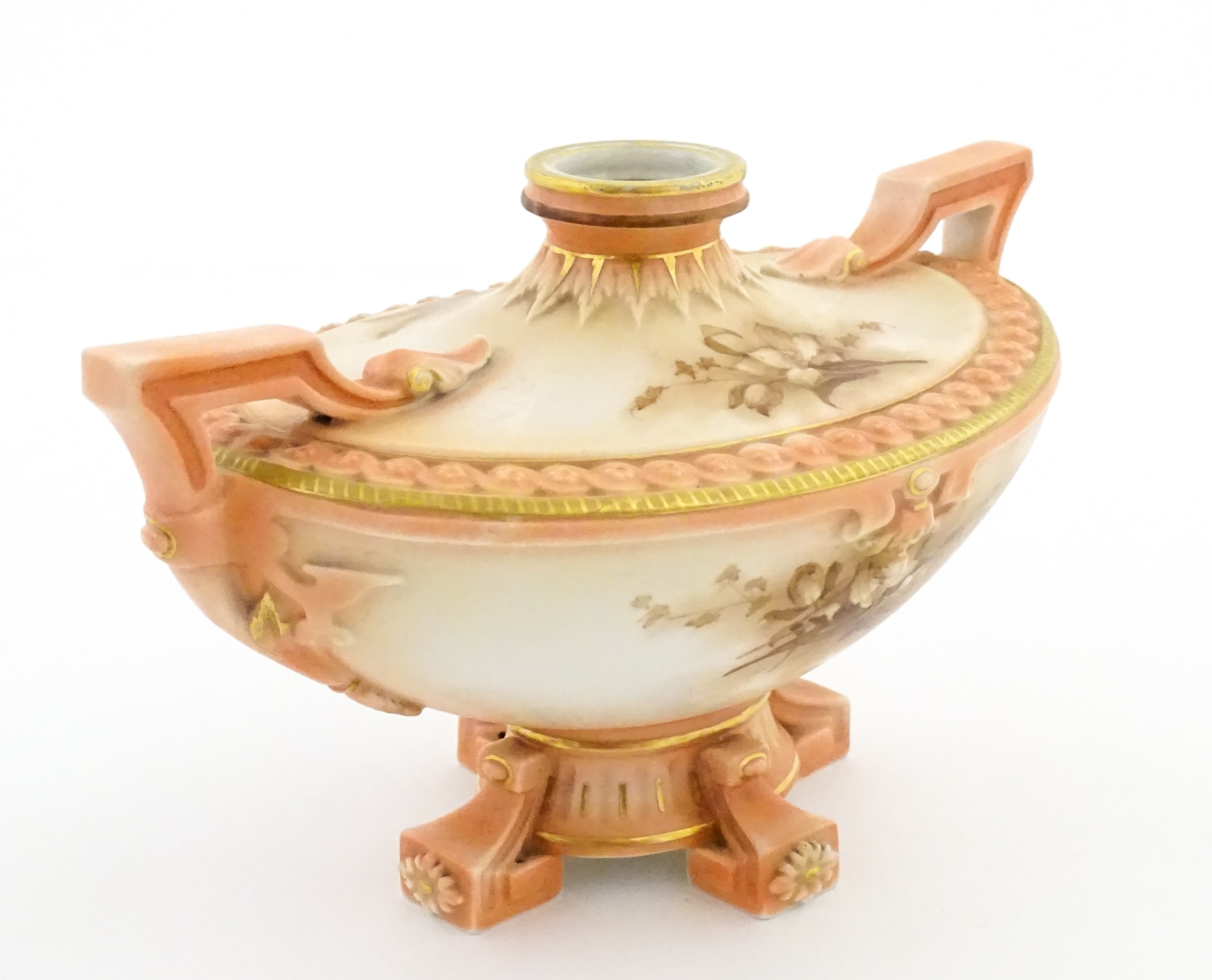 A Hadley's Worcester twin handled squat vase of boat form with floral and foliate decoration. Marked under 150a / 8. Approx. 4" high