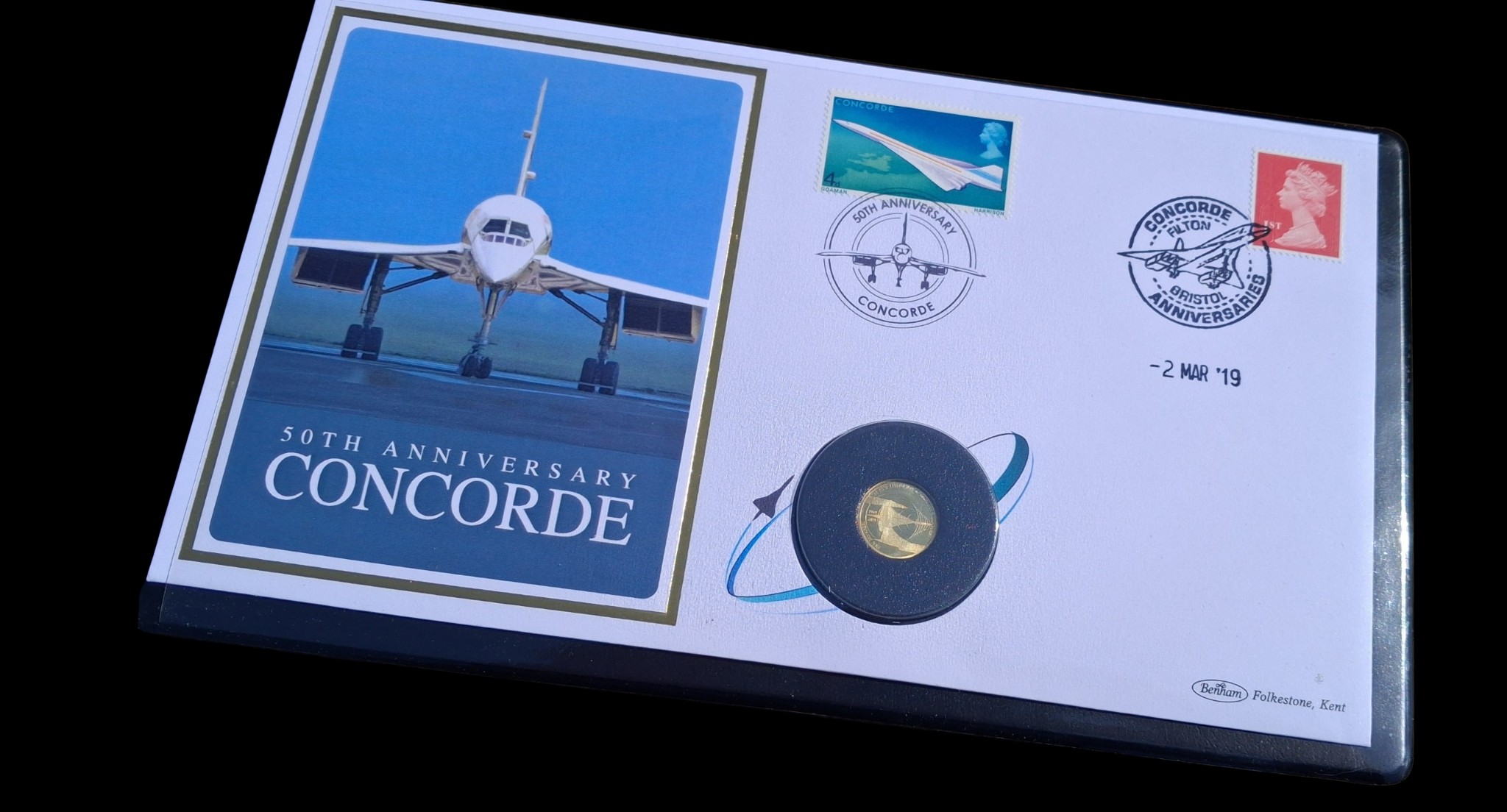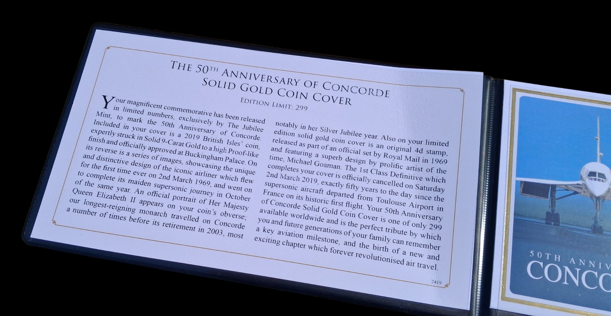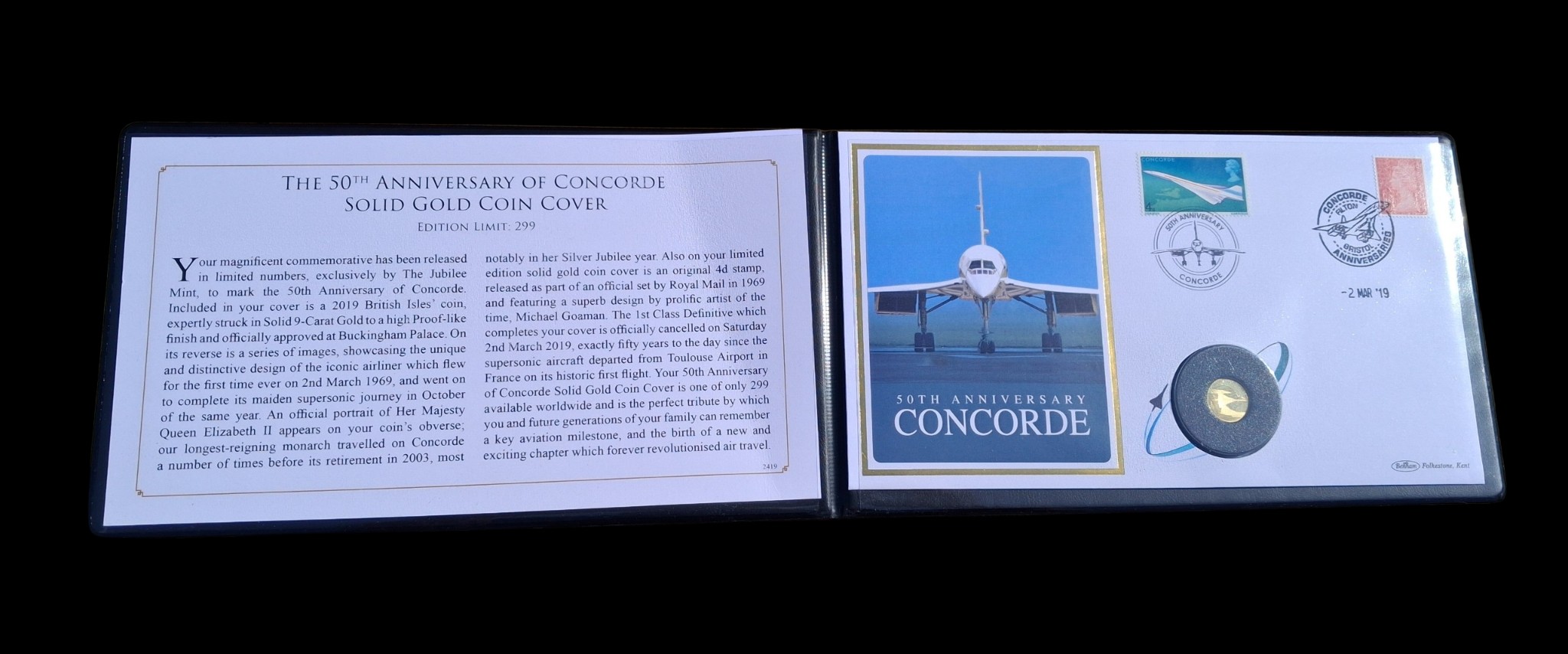 A LIMITED EDITION 9CT GOLD COIN 50TH ANNIVERSARY OF CONCORDE WITH PAPERS AND SLEEVE