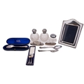 A mixed group of silver including; a cased silver christening spoon by Josiah Williams & Co, London 1896, an arched photograph frame, two cased salt spoons, a silver fork, a pair of globular silver and glass scent bottles, a silver and glass powder pot and two nail buffers, 98gms., (3.1ozs.), gross, and a silver plated spoon, (10)
