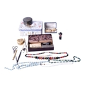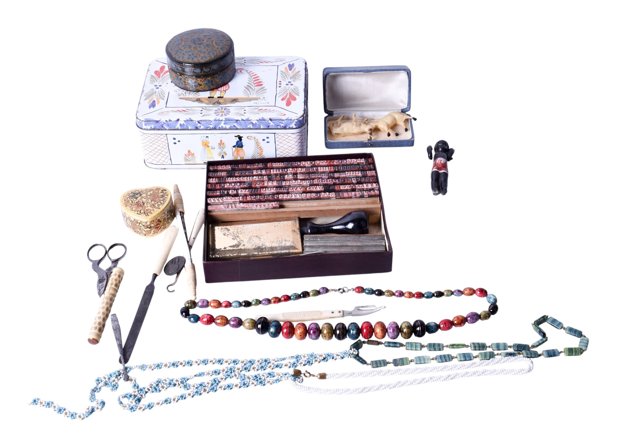 A group of assorted costume jewellery and collectables. Including necklaces, beads, a small black doll, etc.