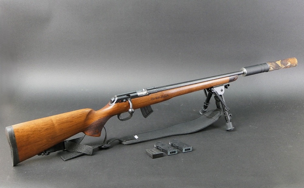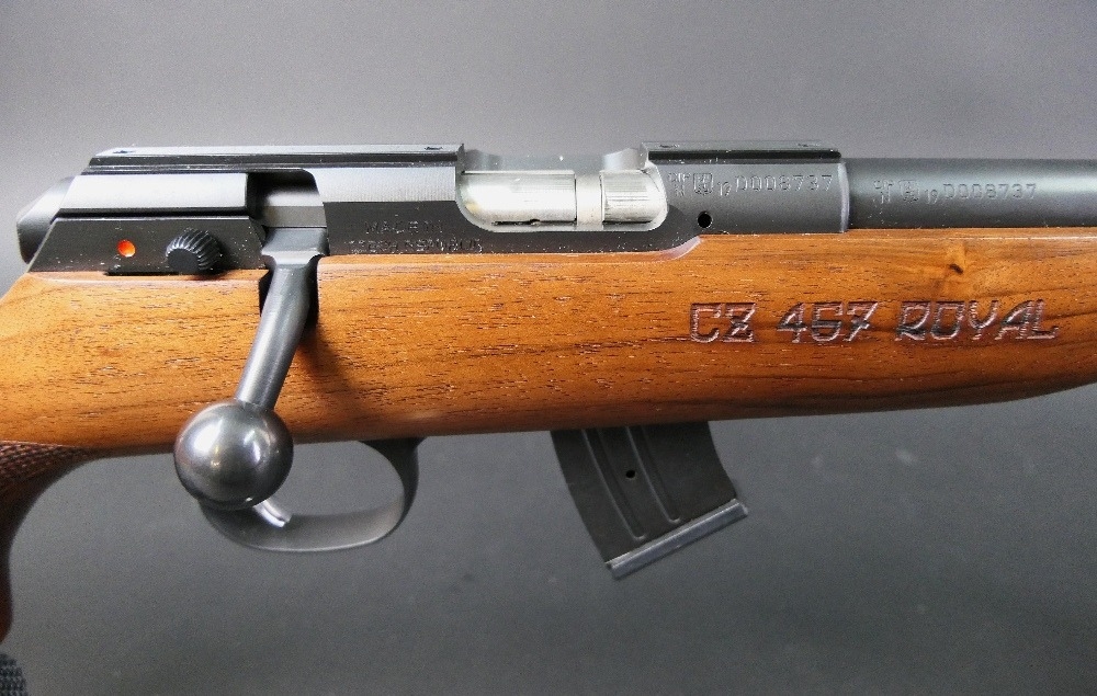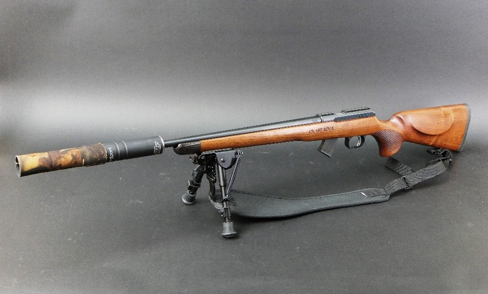 CZ457 Royal cal 22 LR bolt action rifle, fitted with an Aimsport Rimfire 2 sound moderator, bipod and an Allen Neoprene sling, comes with four magazines. Sound moderator Serial No. 206453. Rifle Serial No. D008737. FIREARMS CERTIFICATE REQUIRED x 2.