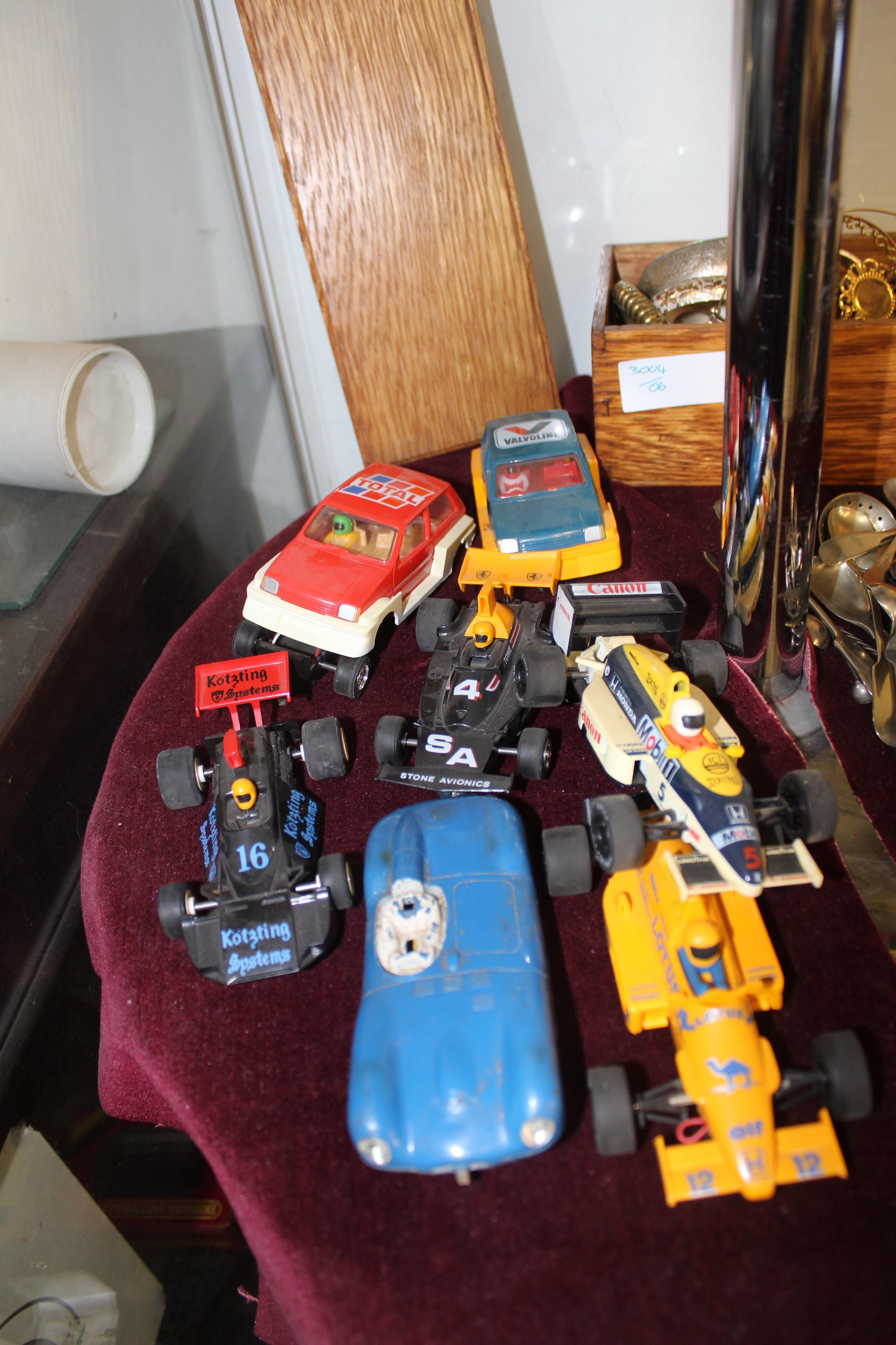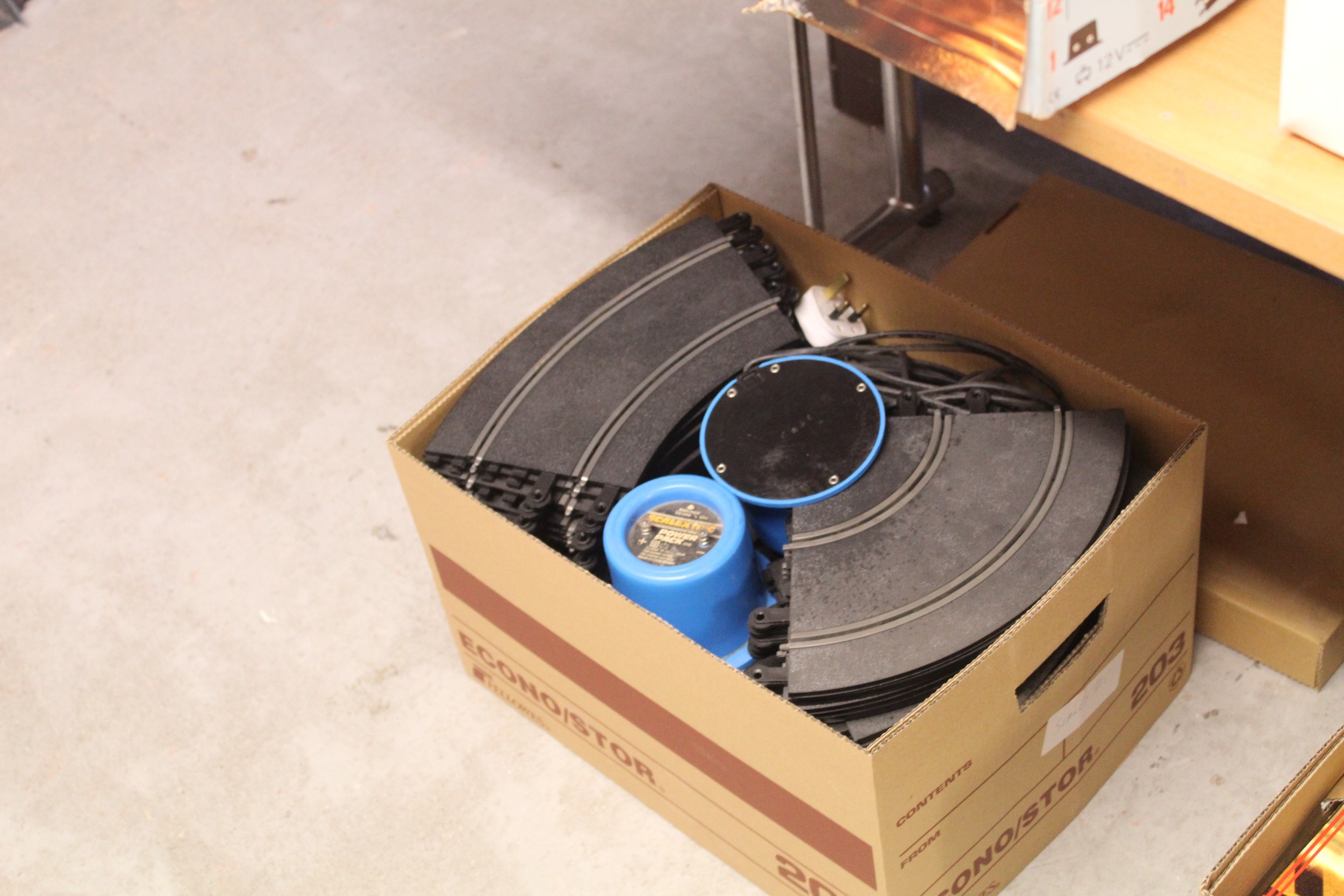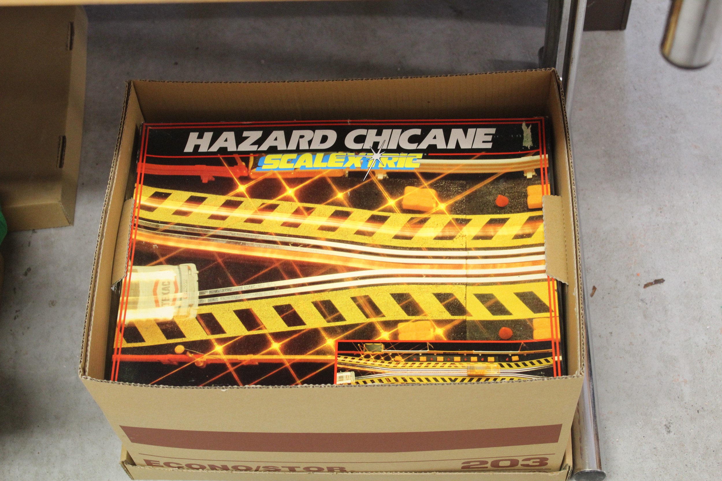 Three Boxed Scalectrix, Four Boxes, Scalectrix Accessories, Large Quantity of Track, Chicane Pack, Seven F1 Racing Cars