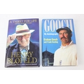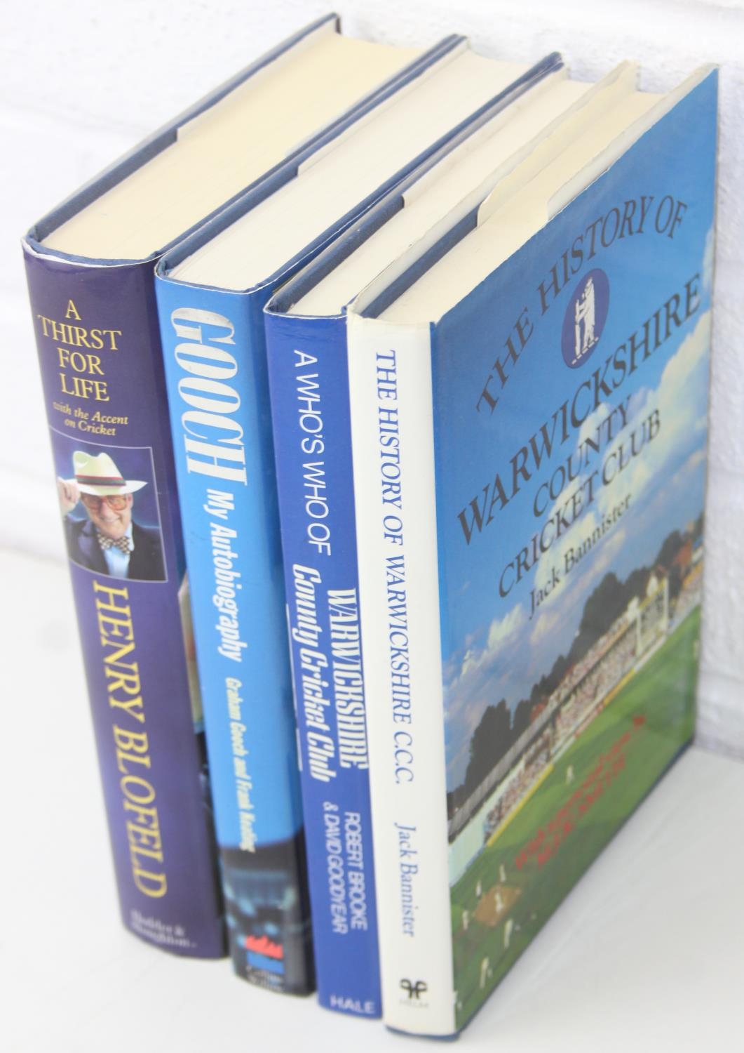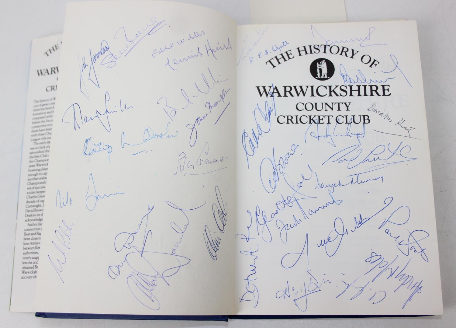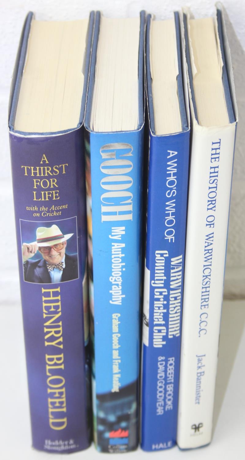 Autographs; Cricketers - Books about cricket, with approximately 40 autographs, mostly cricketers, to include signed by the author copies of 'A Thirst for Life' by Henry Blofeld and 'Gooch' by Graham Gooch and extensively signed Warwickshire County Cricket Club book [4]