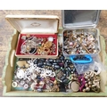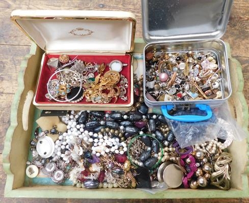 Collection of vintage jewellery + tin, smalls incl. silver & 27 vintage brooches & 1950's tray